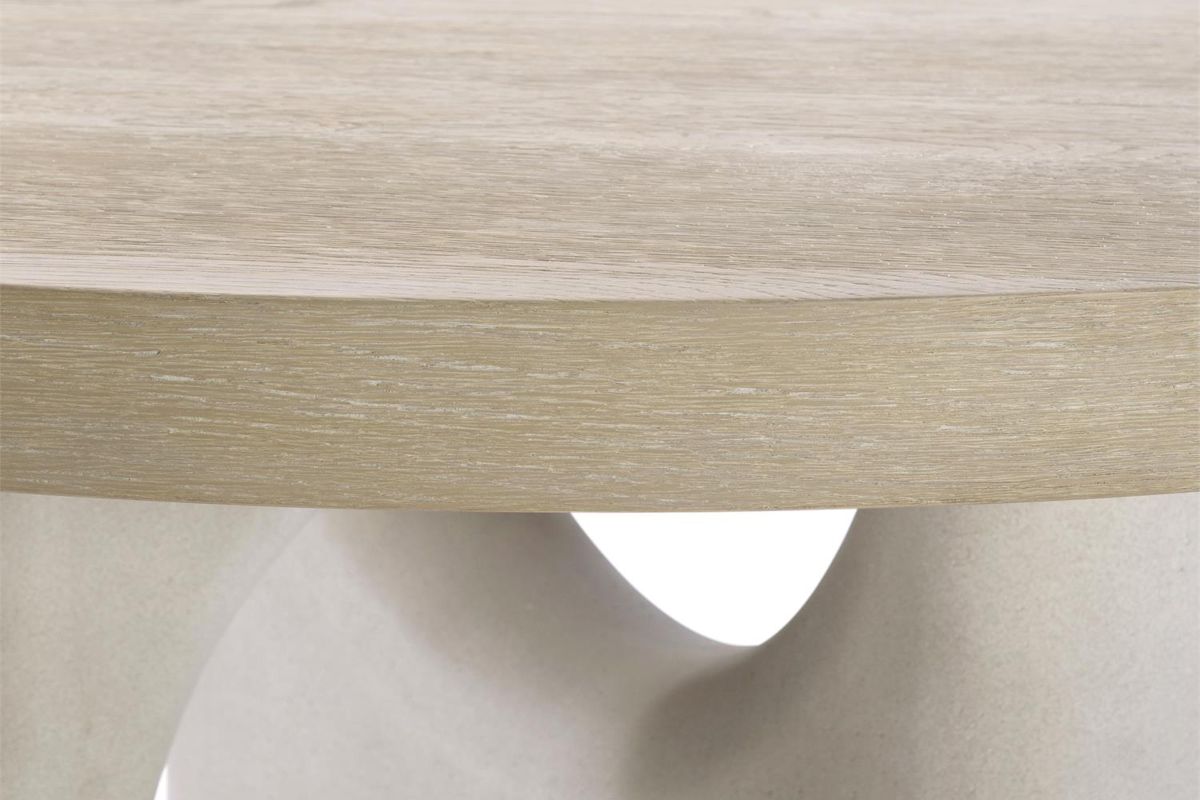 - Round table top crafted from rustic oak in Roz finish with glass-reinforced concrete base in Pumice finish
