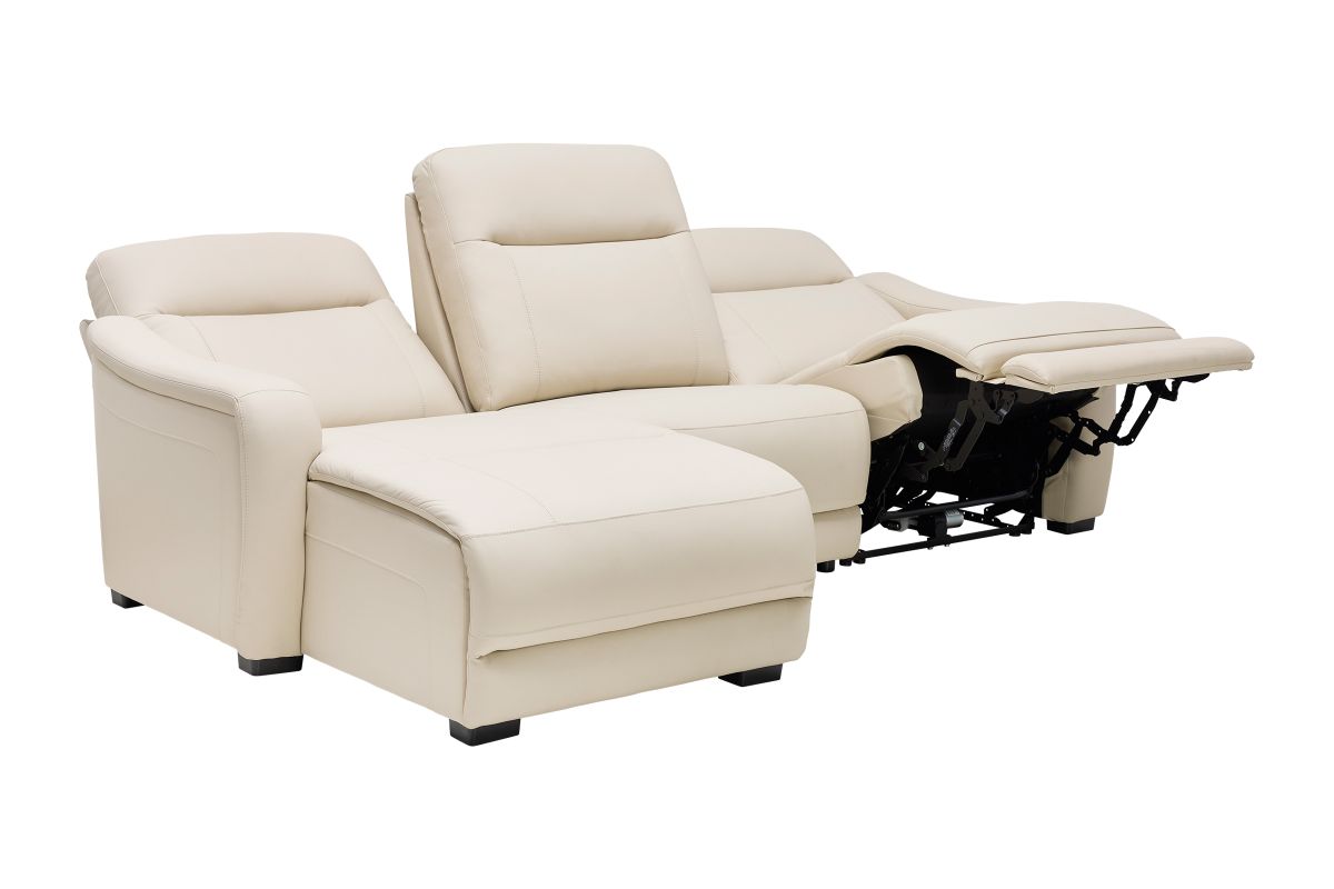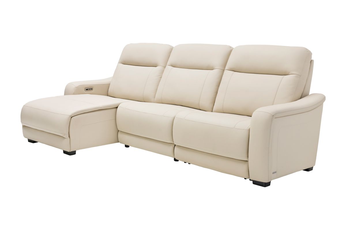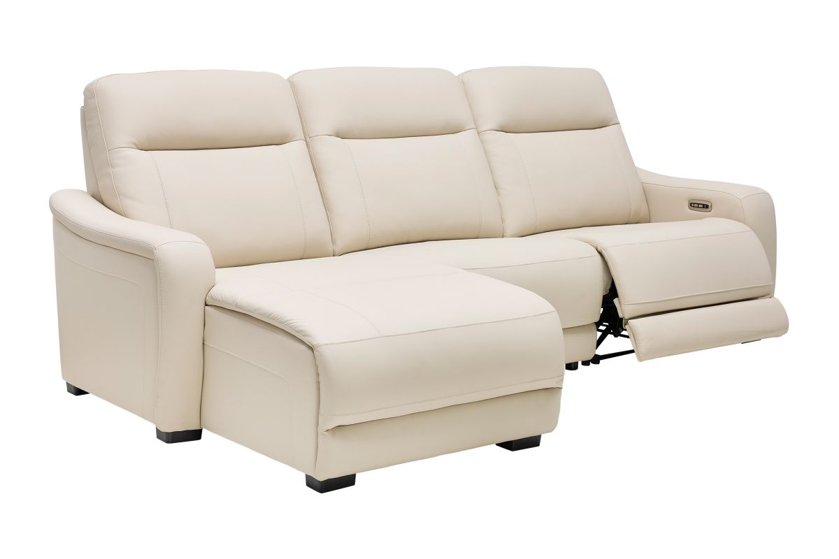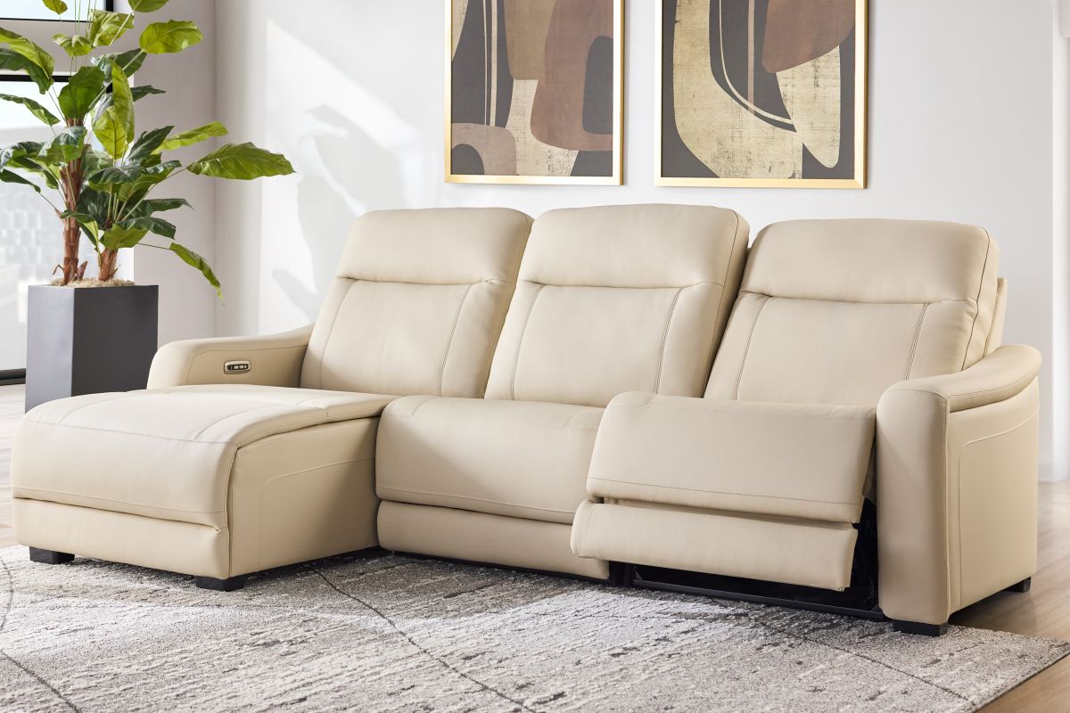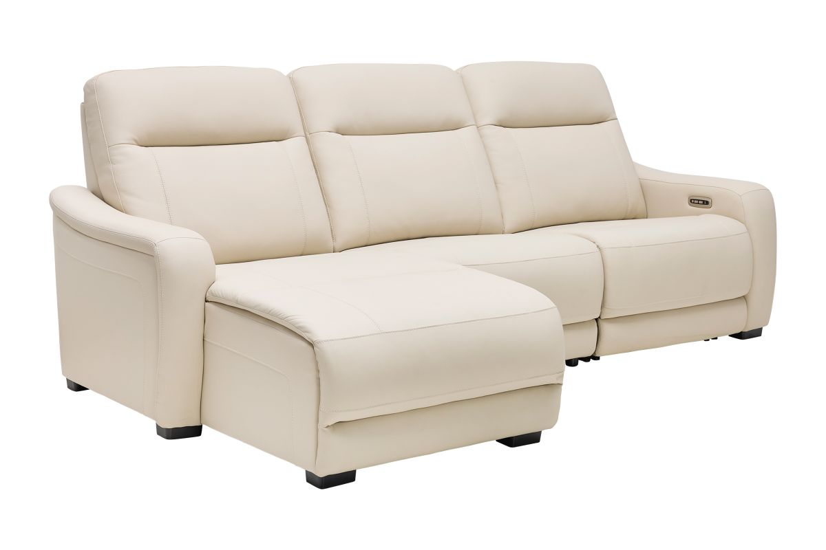 The sleek design, understated sophistication and casual profile of the Drew & Jonathan Newport sectional presents a warm, inviting feeling the whole family can enjoy. Modern in style, this sectional is upholstered in a soft, supple almond-colored top grain leather where the body touches with stylish double top-stitched seams for a luxurious look. Curved, padded arms, wide seats and an elongated footrest in the chaise provide ample space for exceptional comfort. Dual power reclining functions provide the finishing touch, allowing adjustments in the head and footrest with a patented zero gravity mechanism for the ultimate lounging experience.