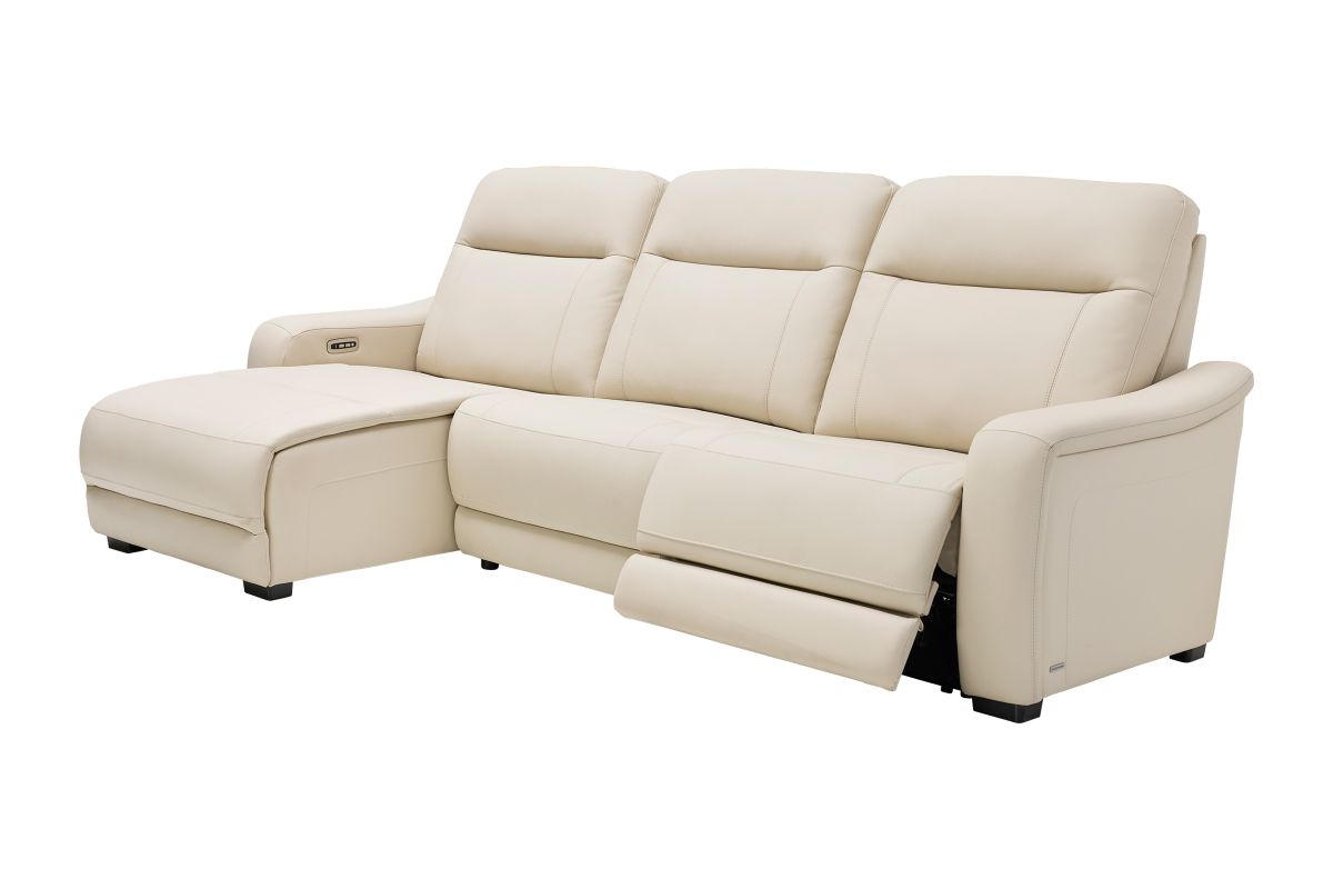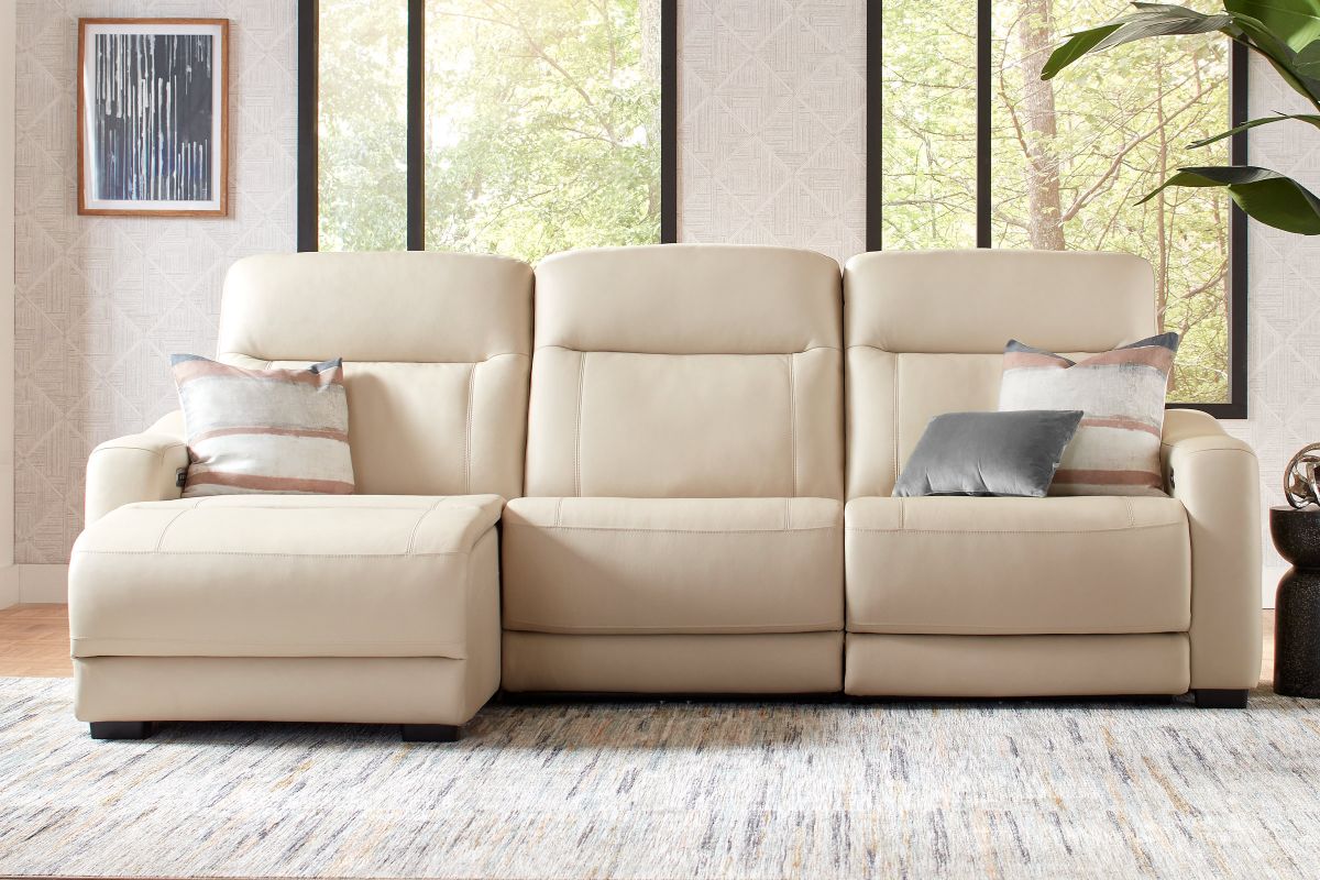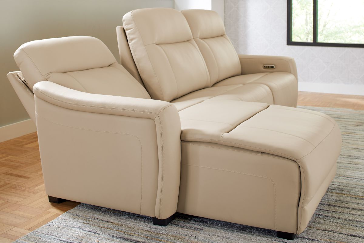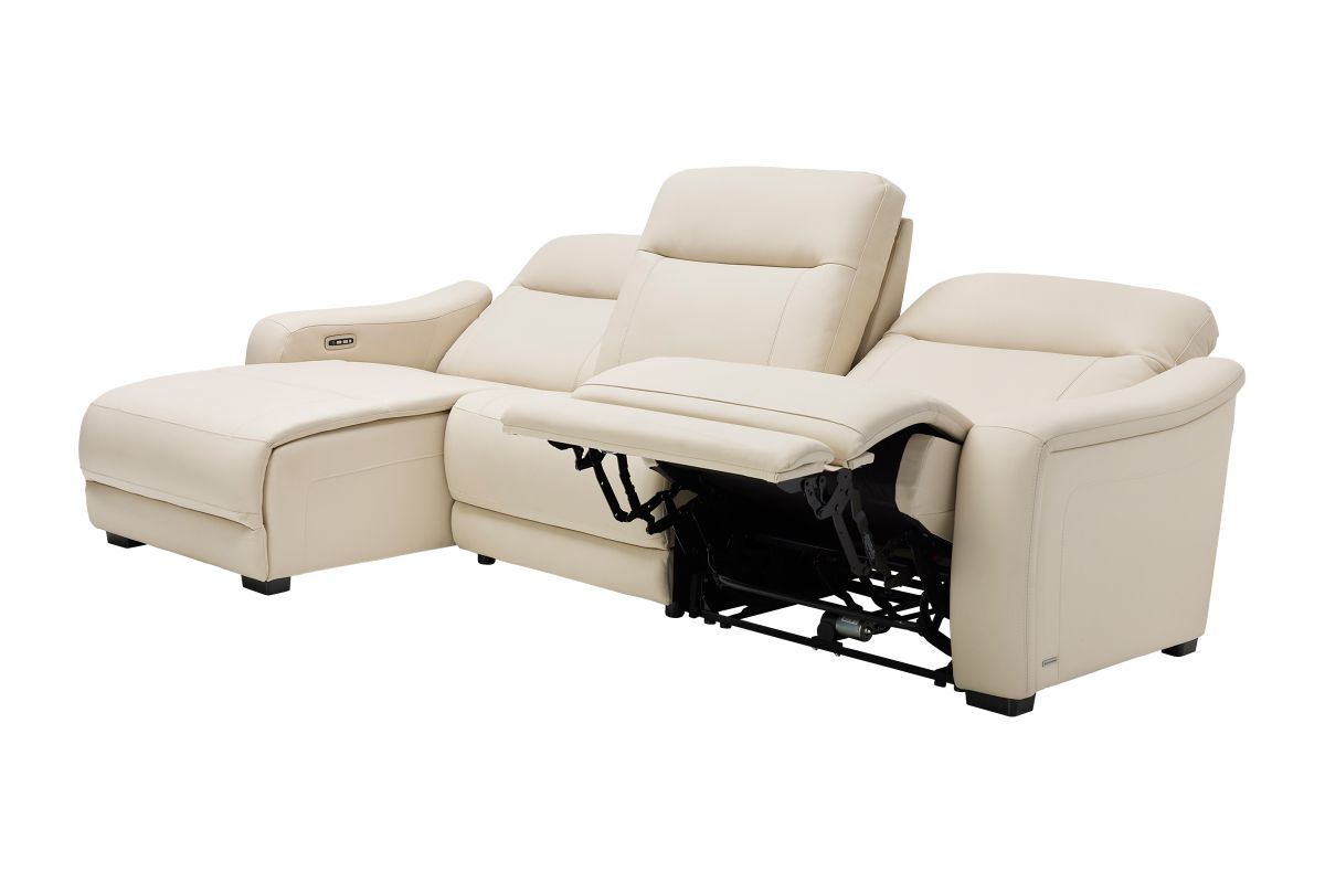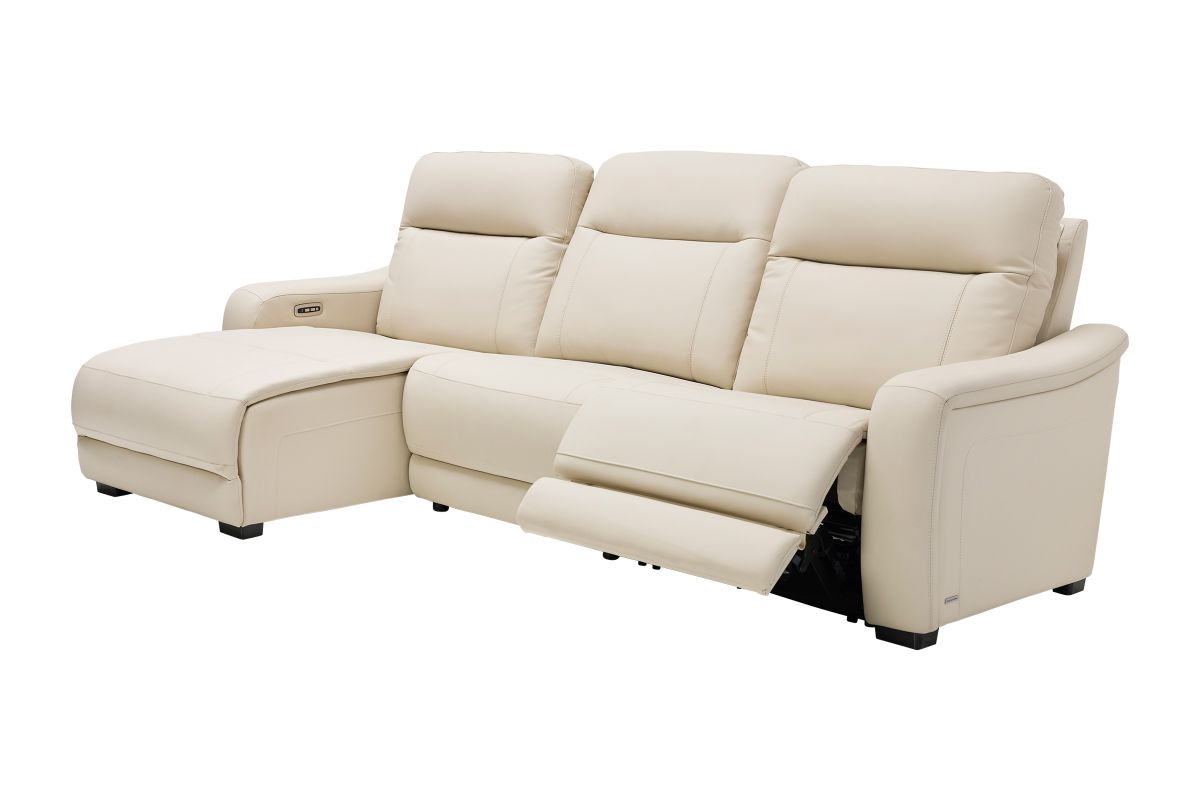 The sleek design, understated sophistication and casual profile of the Drew & Jonathan Newport sectional presents a warm, inviting feeling the whole family can enjoy. Modern in style, this sectional is upholstered in a soft, supple almond-colored top grain leather where the body touches with stylish double top-stitched seams for a luxurious look. Curved, padded arms, wide seats and an elongated footrest in the chaise provide ample space for exceptional comfort. Dual power reclining functions provide the finishing touch, allowing adjustments in the head and footrest with a patented zero gravity mechanism for the ultimate lounging experience.