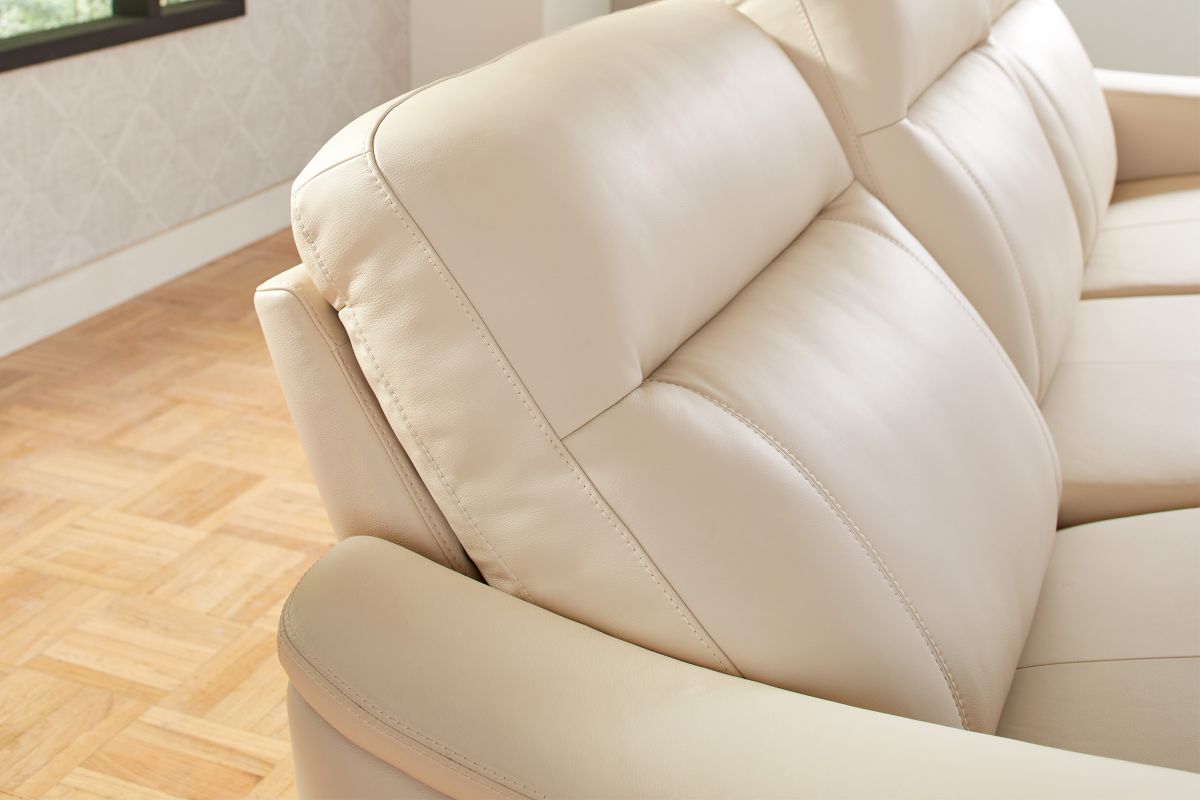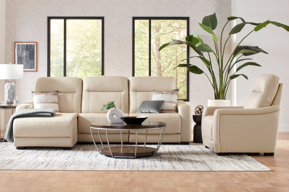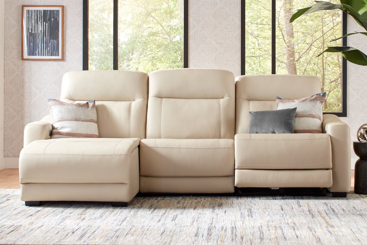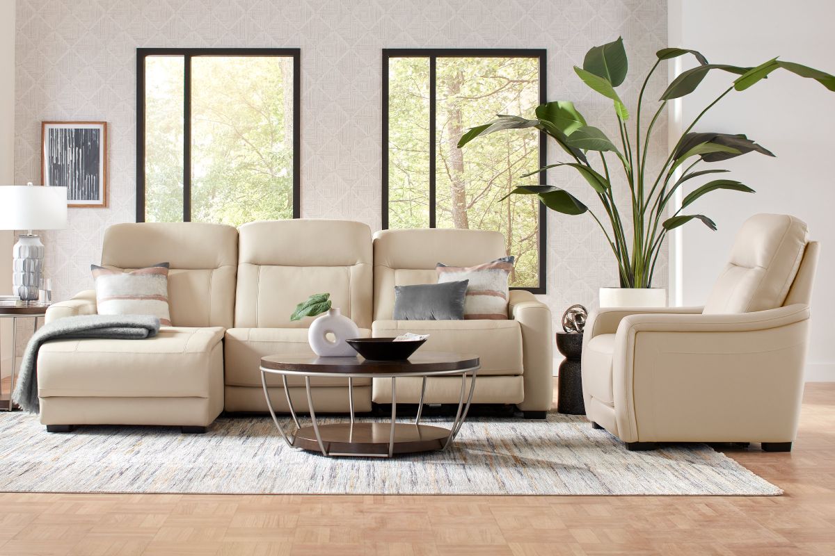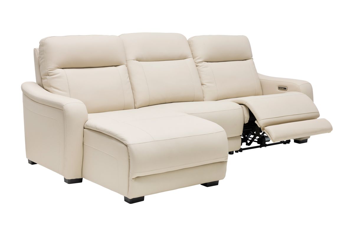 The sleek design, understated sophistication and casual profile of the Drew & Jonathan Newport sectional presents a warm, inviting feeling the whole family can enjoy. Modern in style, this sectional is upholstered in a soft, supple almond-colored top grain leather where the body touches with stylish double top-stitched seams for a luxurious look. Curved, padded arms, wide seats and an elongated footrest in the chaise provide ample space for exceptional comfort. Dual power reclining functions provide the finishing touch, allowing adjustments in the head and footrest with a patented zero gravity mechanism for the ultimate lounging experience.