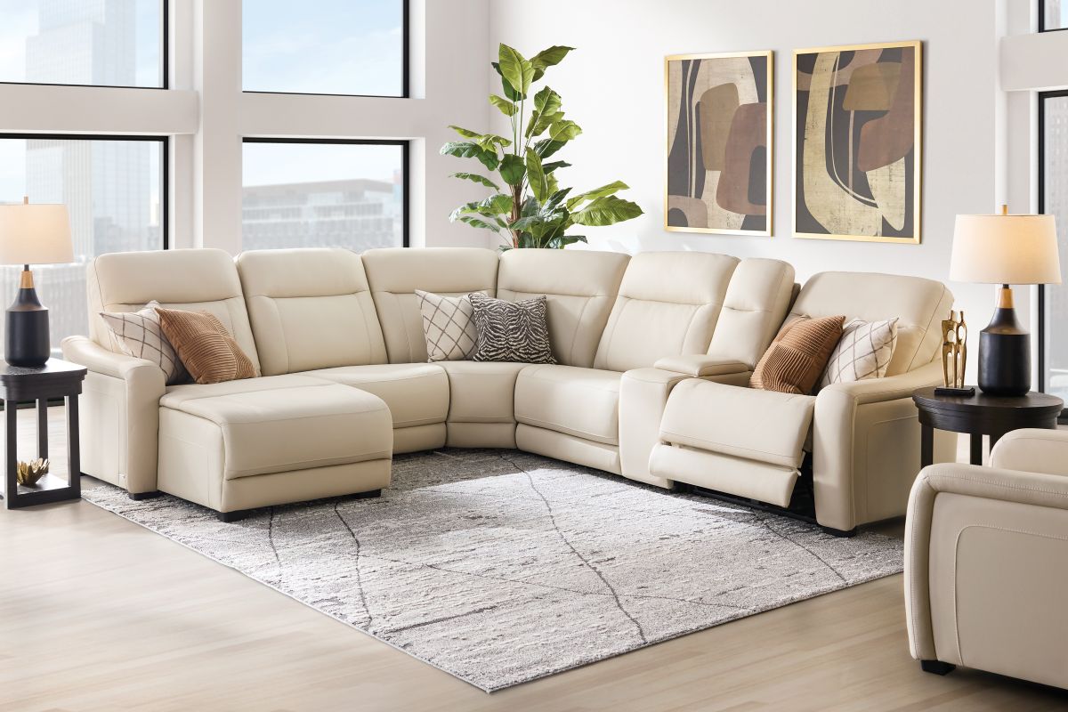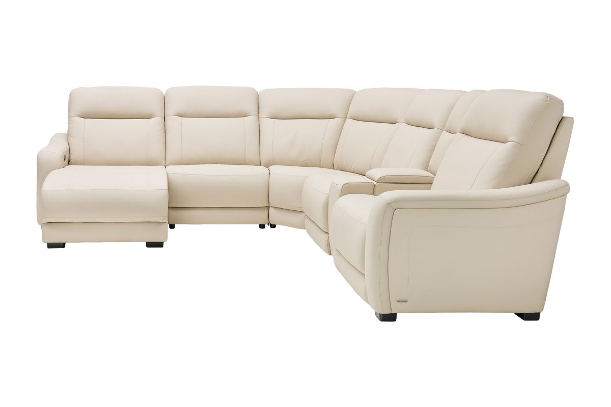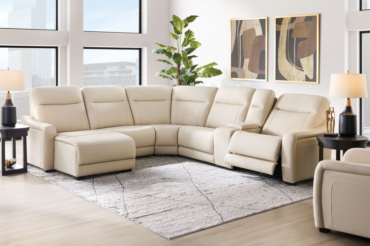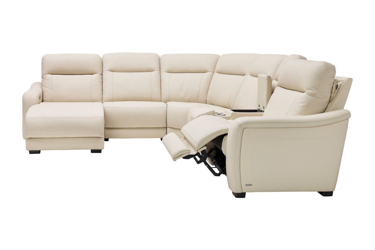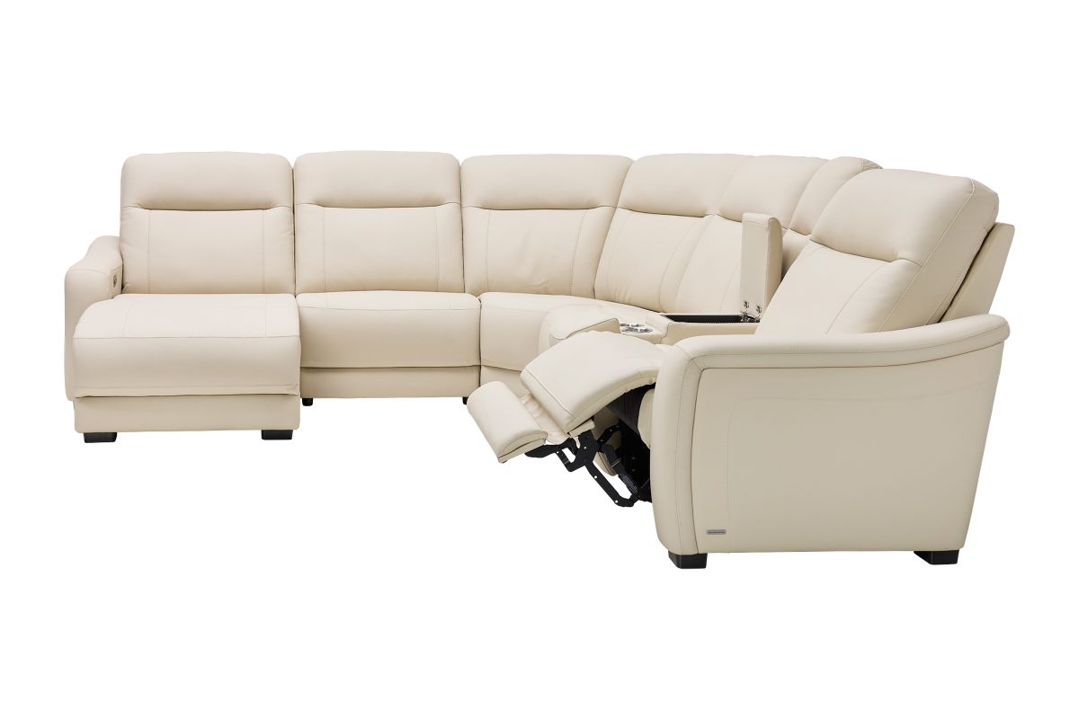 The sleek design, understated sophistication and casual profile of the Drew & Jonathan Newport sectional presents a warm, inviting feeling the whole family can enjoy. Modern in style, this sectional is upholstered in a soft, supple almond-colored top grain leather where the body touches with stylish double top-stitched seams for a luxurious look. Curved, padded arms, wide seats and an elongated footrest in the chaise provide ample space for exceptional comfort. The console adds more space as its hidden cupholders and storage compartment hold your relaxation essentials perfectly, as well as additional charging ports for devices. Dual power reclining functions provide the finishing touch, allowing adjustments in the head and footrest with a patented zero gravity mechanism for the ultimate lounging experience.