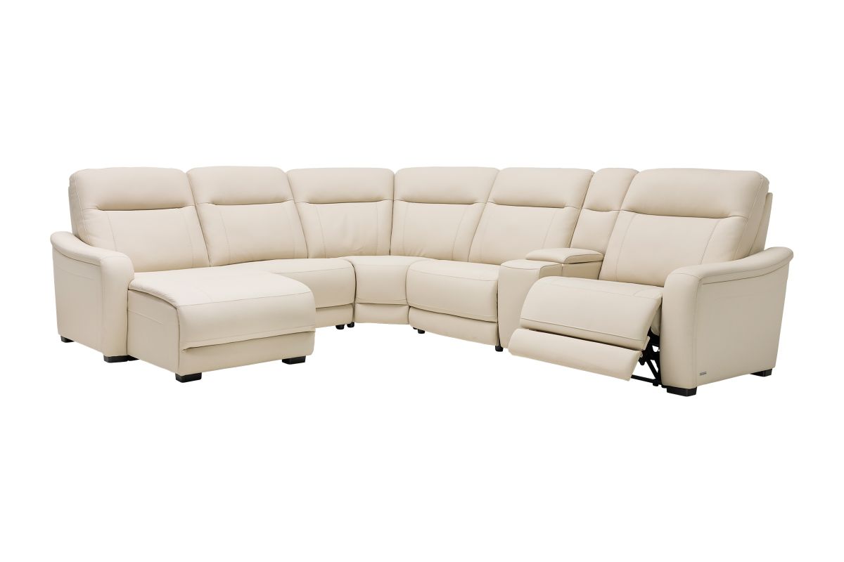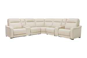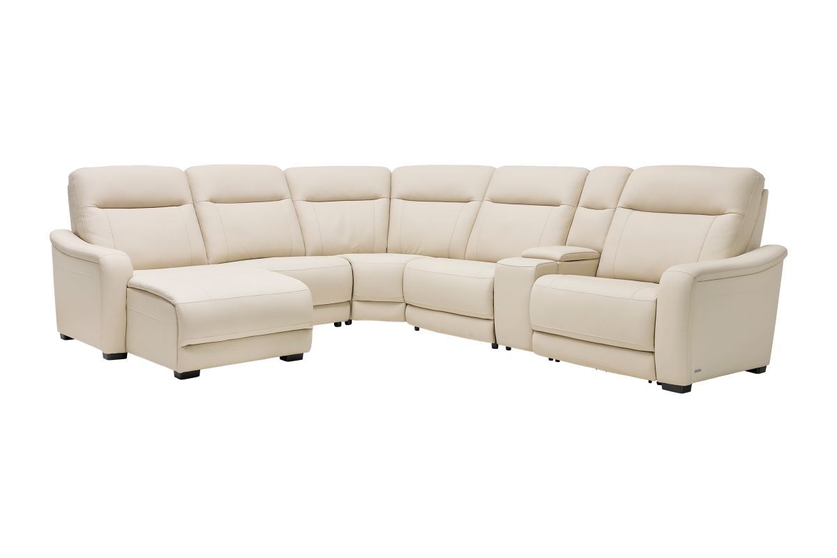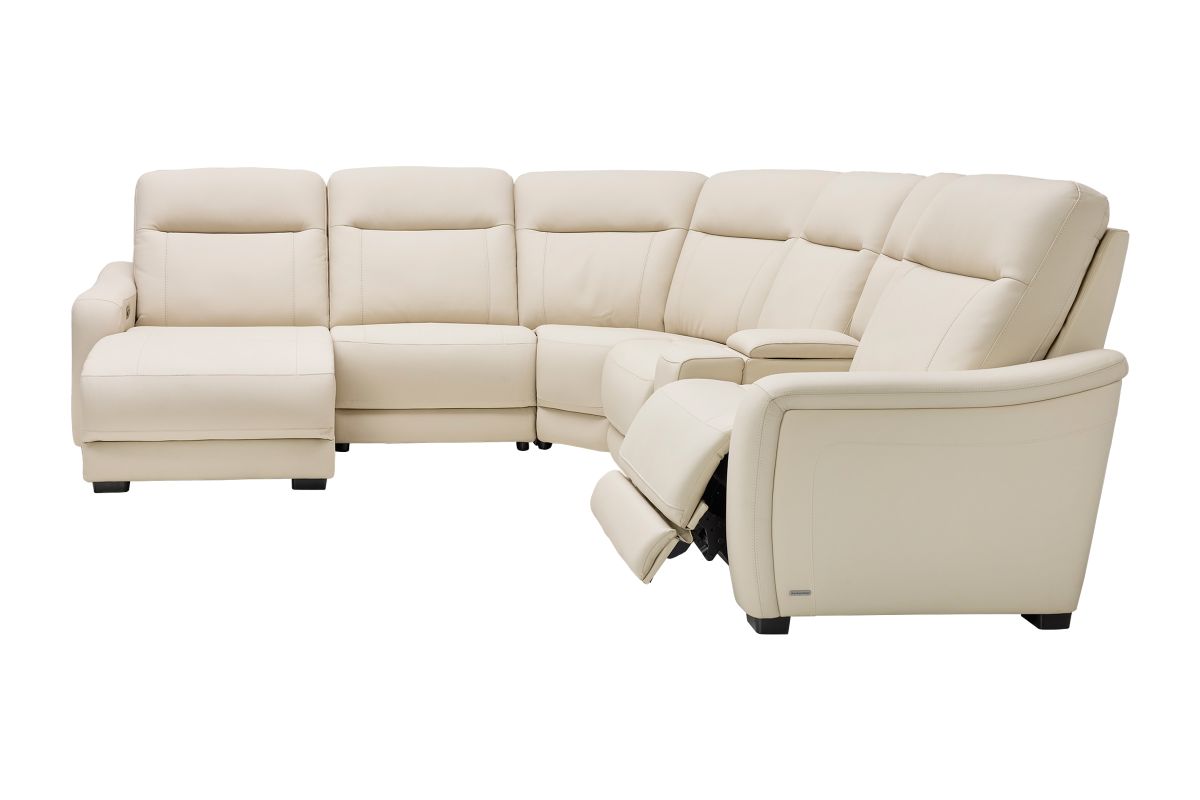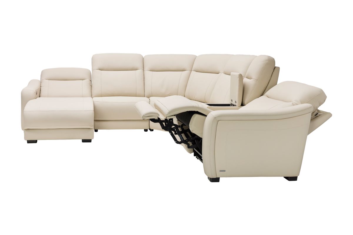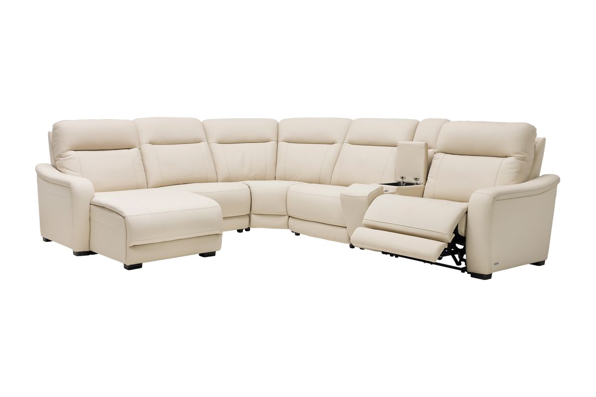 The sleek design, understated sophistication and casual profile of the Drew & Jonathan Newport sectional presents a warm, inviting feeling the whole family can enjoy. Modern in style, this sectional is upholstered in a soft, supple almond-colored top grain leather where the body touches with stylish double top-stitched seams for a luxurious look. Curved, padded arms, wide seats and an elongated footrest in the chaise provide ample space for exceptional comfort. The console adds more space as its hidden cupholders and storage compartment hold your relaxation essentials perfectly, as well as additional charging ports for devices. Dual power reclining functions provide the finishing touch, allowing adjustments in the head and footrest with a patented zero gravity mechanism for the ultimate lounging experience.