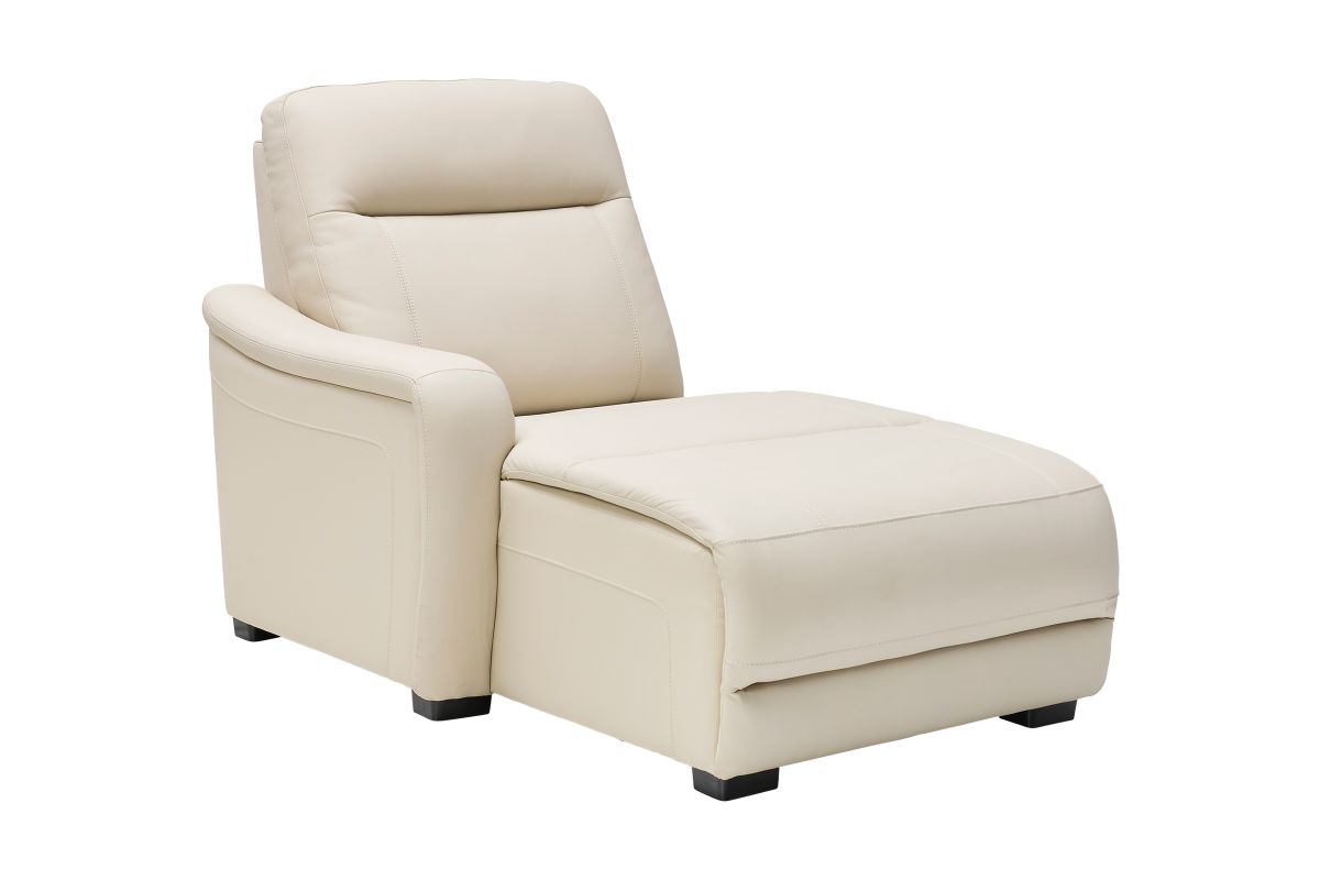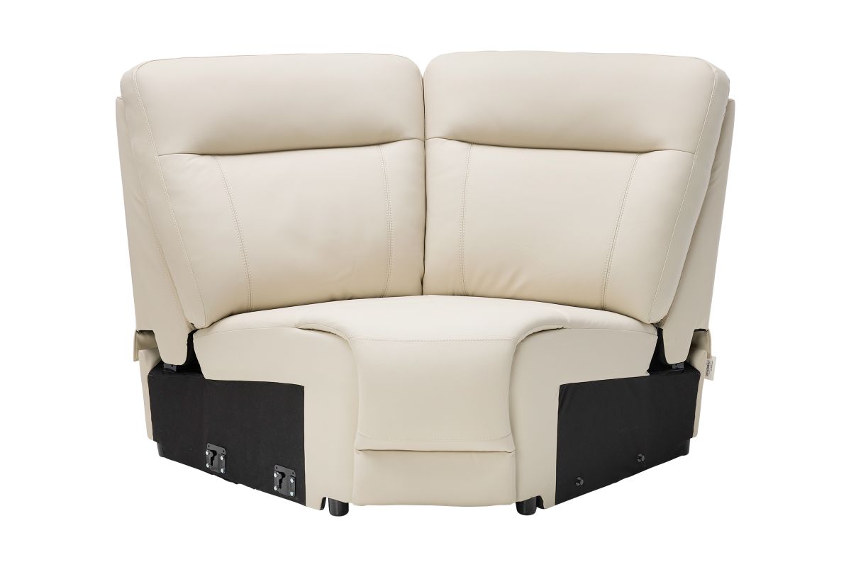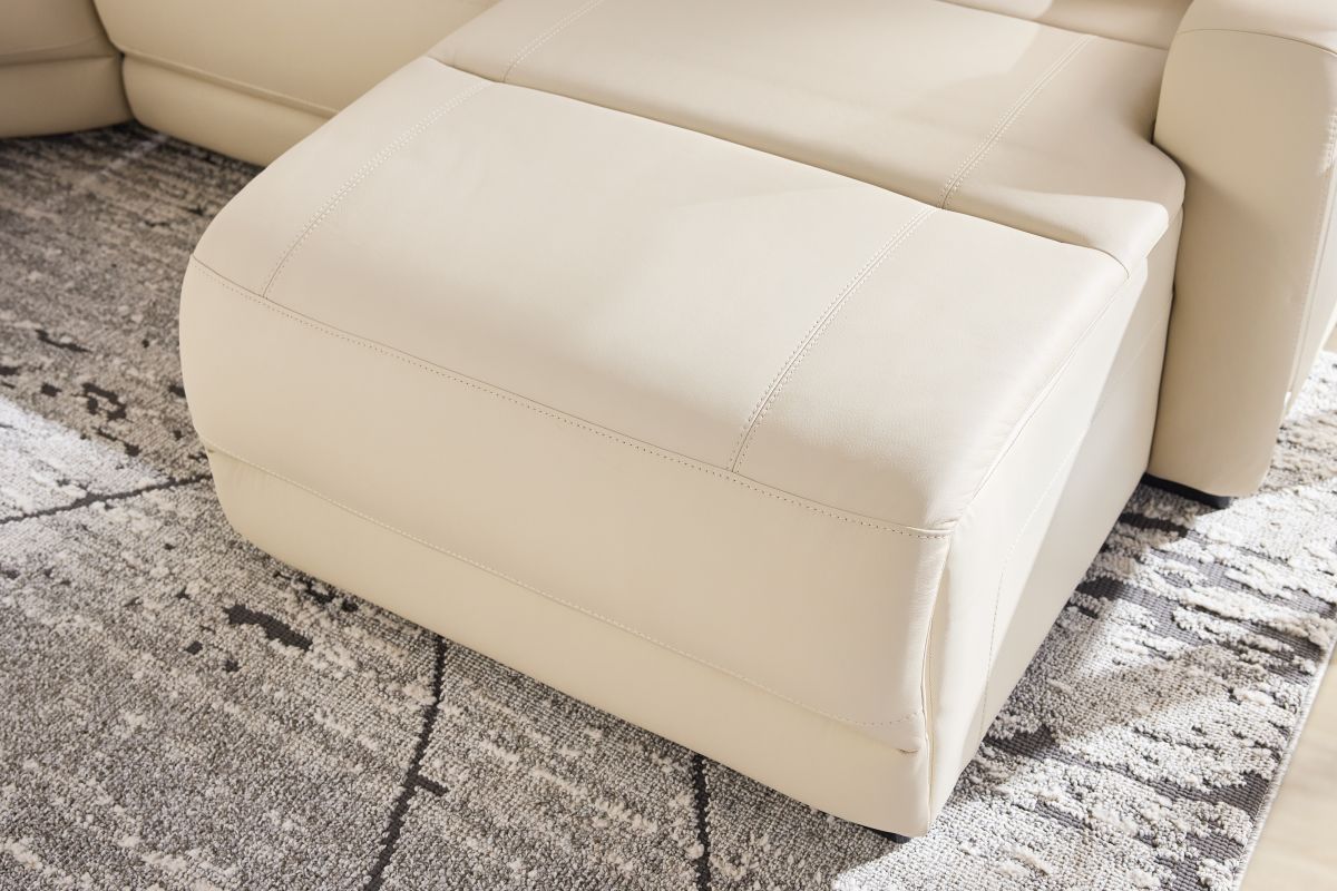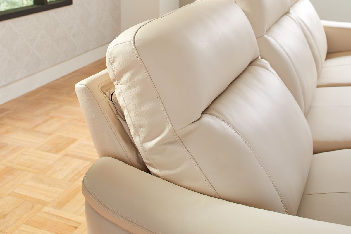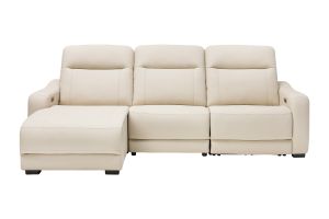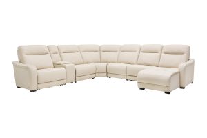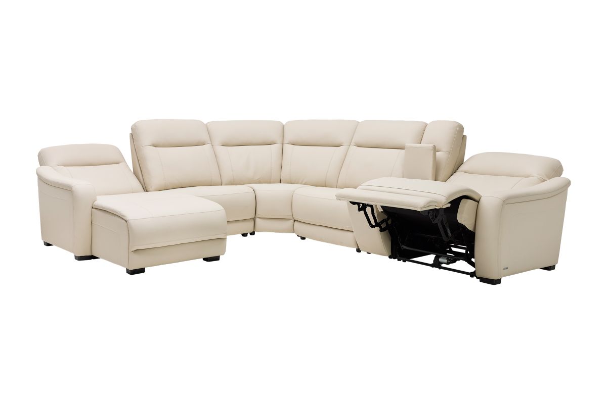 The sleek design, understated sophistication and casual profile of the Drew & Jonathan Newport sectional presents a warm, inviting feeling the whole family can enjoy. Modern in style, this sectional is upholstered in a soft, supple almond-colored top grain leather where the body touches with stylish double top-stitched seams for a luxurious look. Curved, padded arms, wide seats and an elongated footrest in the chaise provide ample space for exceptional comfort. The console adds more space as its hidden cupholders and storage compartment hold your relaxation essentials perfectly, as well as additional charging ports for devices. Dual power reclining functions provide the finishing touch, allowing adjustments in the head and footrest with a patented zero gravity mechanism for the ultimate lounging experience.