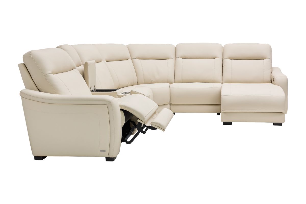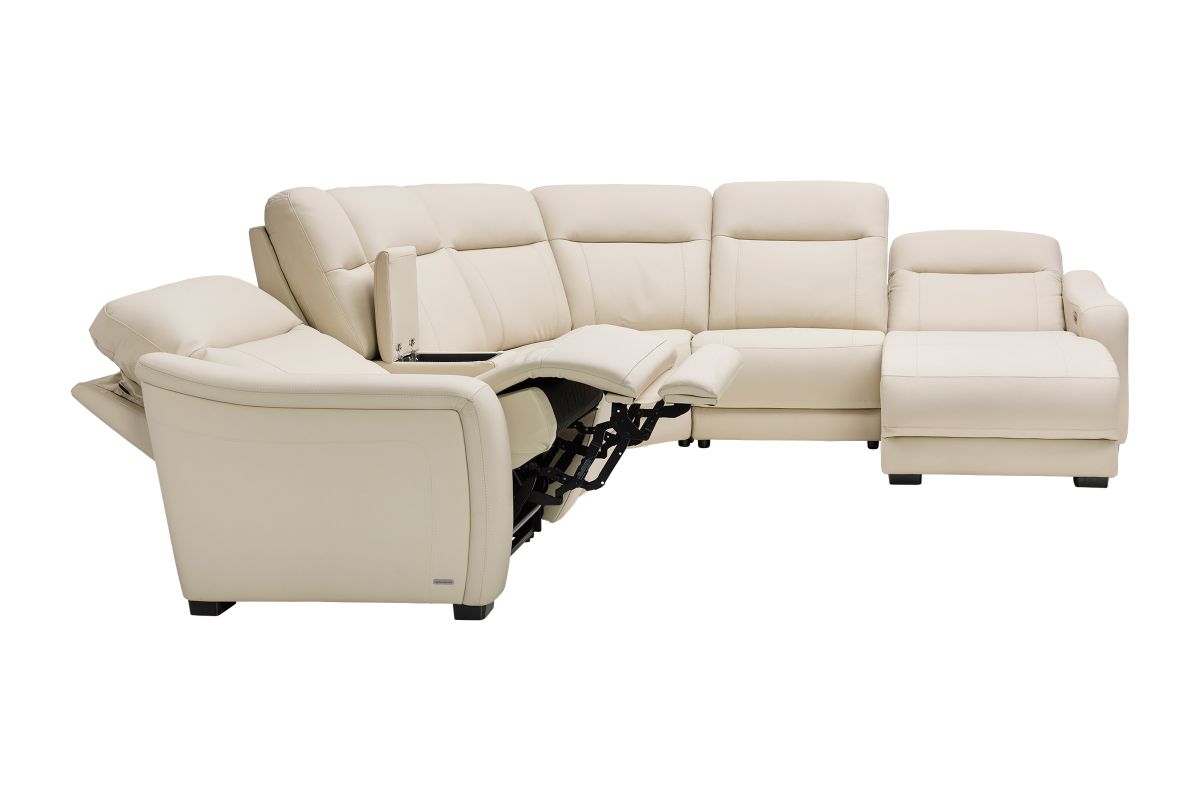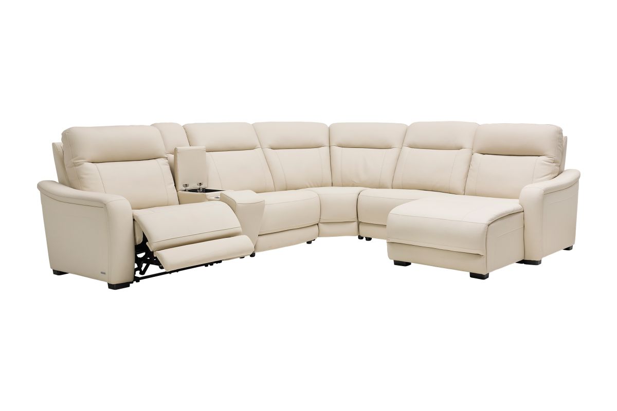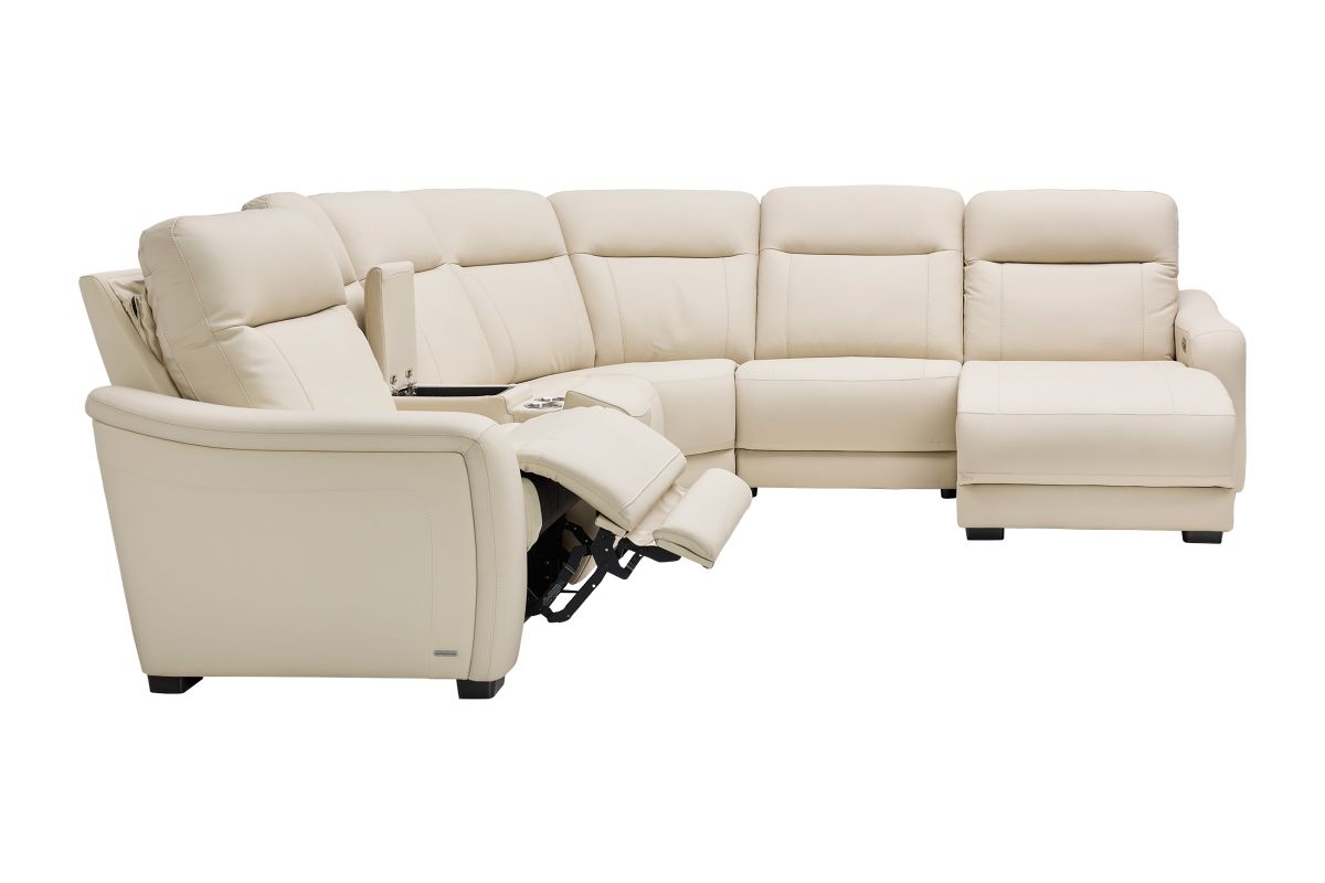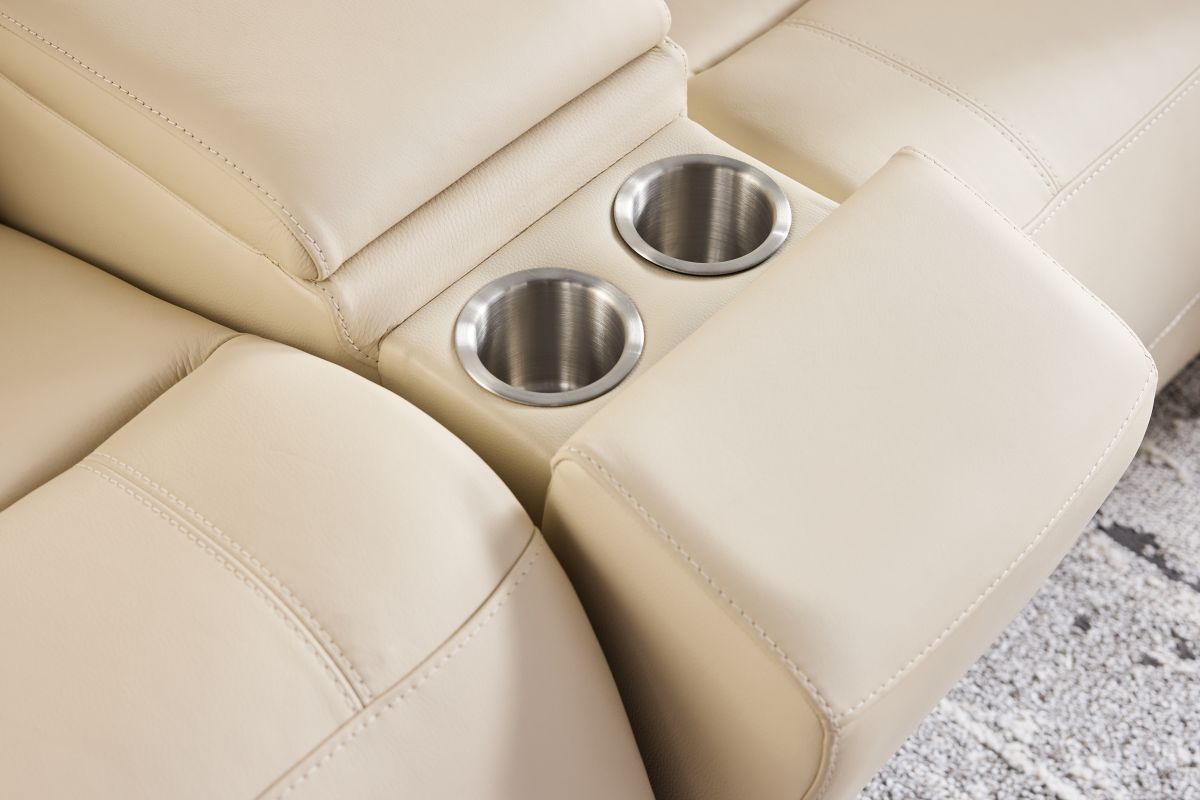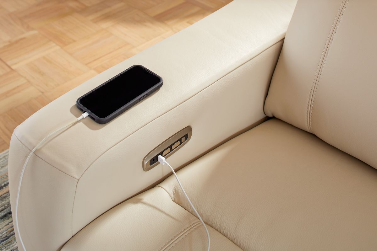 The sleek design, understated sophistication and casual profile of the Drew & Jonathan Newport sectional presents a warm, inviting feeling the whole family can enjoy. Modern in style, this sectional is upholstered in a soft, supple almond-colored top grain leather where the body touches with stylish double top-stitched seams for a luxurious look. Curved, padded arms, wide seats and an elongated footrest in the chaise provide ample space for exceptional comfort. The console adds more space as its hidden cupholders and storage compartment hold your relaxation essentials perfectly, as well as additional charging ports for devices. Dual power reclining functions provide the finishing touch, allowing adjustments in the head and footrest with a patented zero gravity mechanism for the ultimate lounging experience.