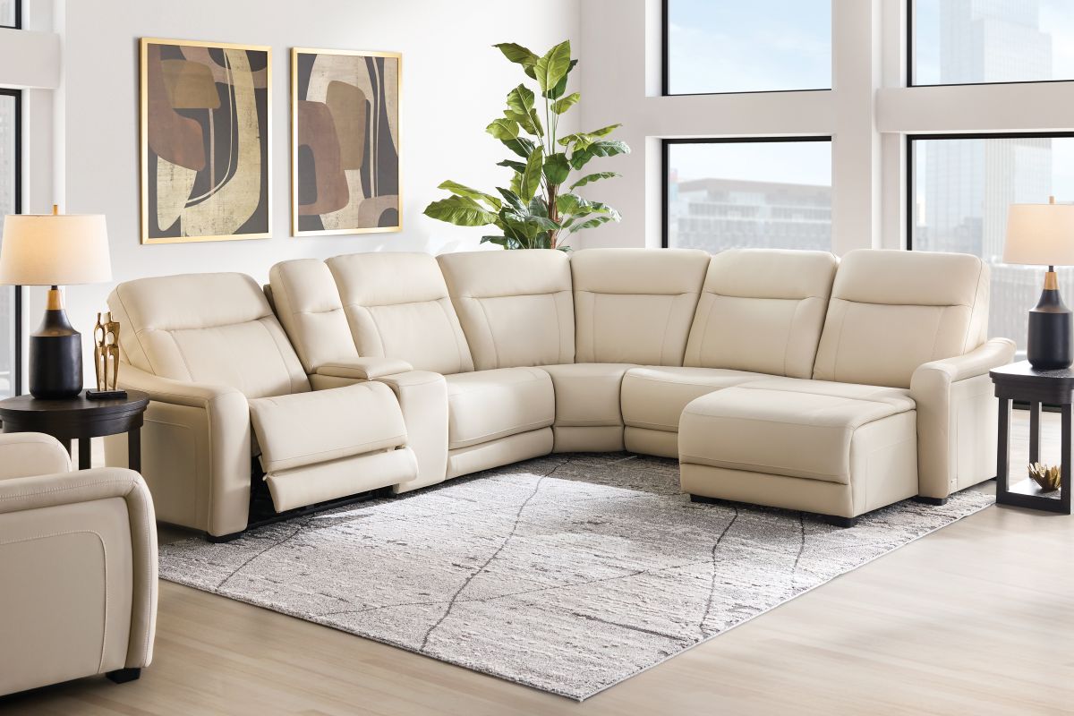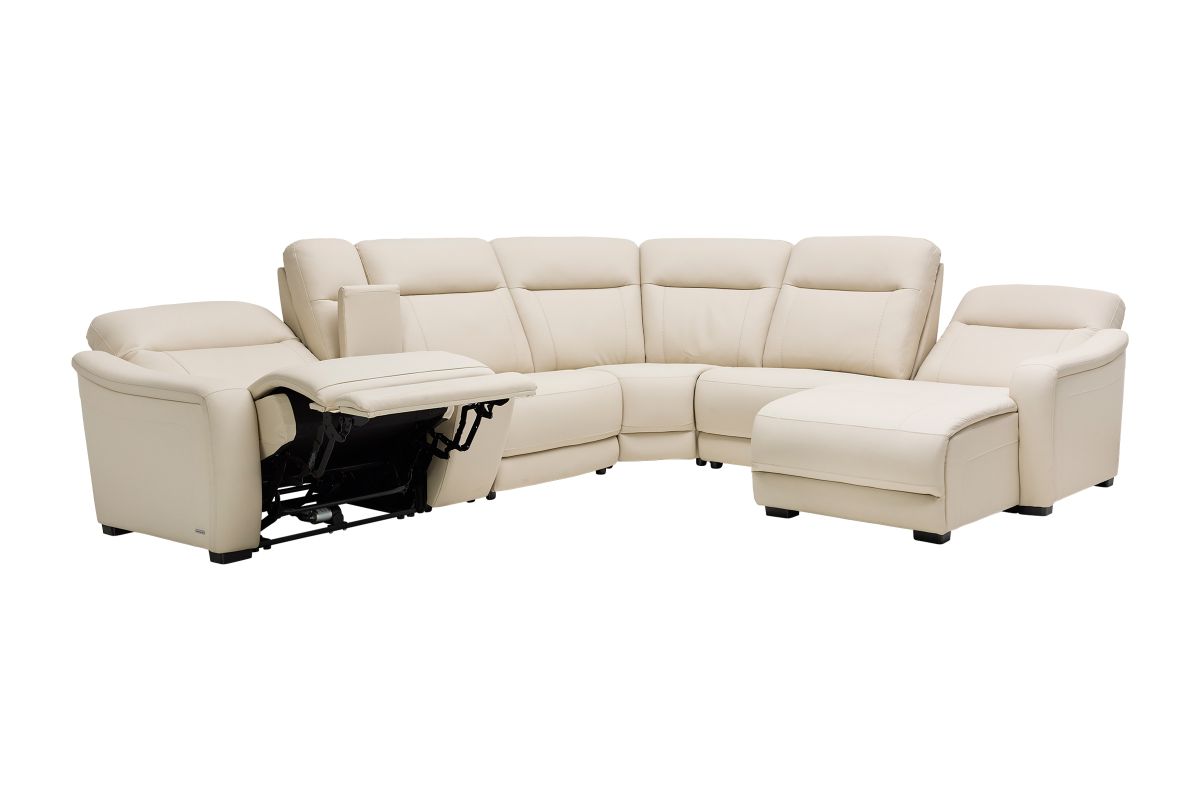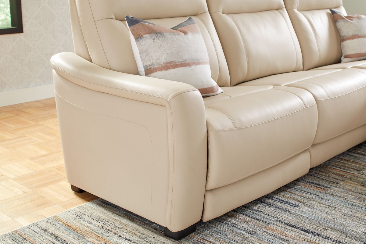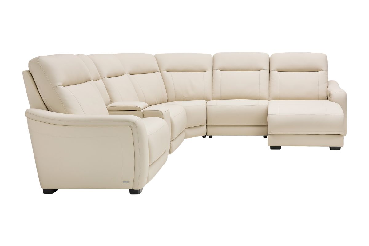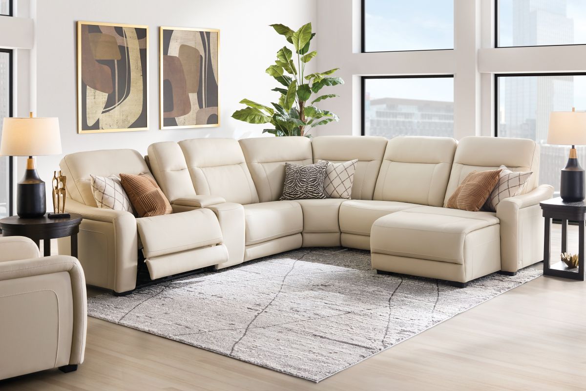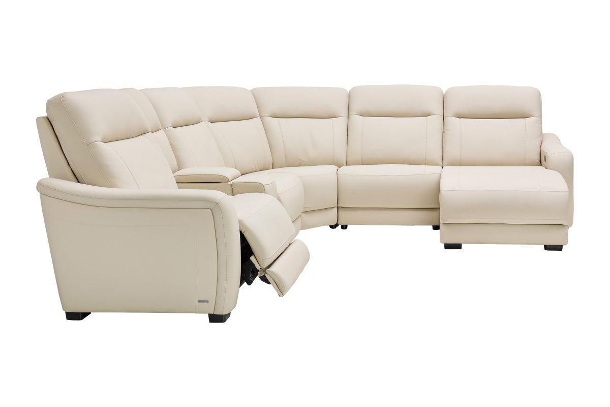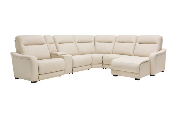 The sleek design, understated sophistication and casual profile of the Drew & Jonathan Newport sectional presents a warm, inviting feeling the whole family can enjoy. Modern in style, this sectional is upholstered in a soft, supple almond-colored top grain leather where the body touches with stylish double top-stitched seams for a luxurious look. Curved, padded arms, wide seats and an elongated footrest in the chaise provide ample space for exceptional comfort. The console adds more space as its hidden cupholders and storage compartment hold your relaxation essentials perfectly, as well as additional charging ports for devices. Dual power reclining functions provide the finishing touch, allowing adjustments in the head and footrest with a patented zero gravity mechanism for the ultimate lounging experience.