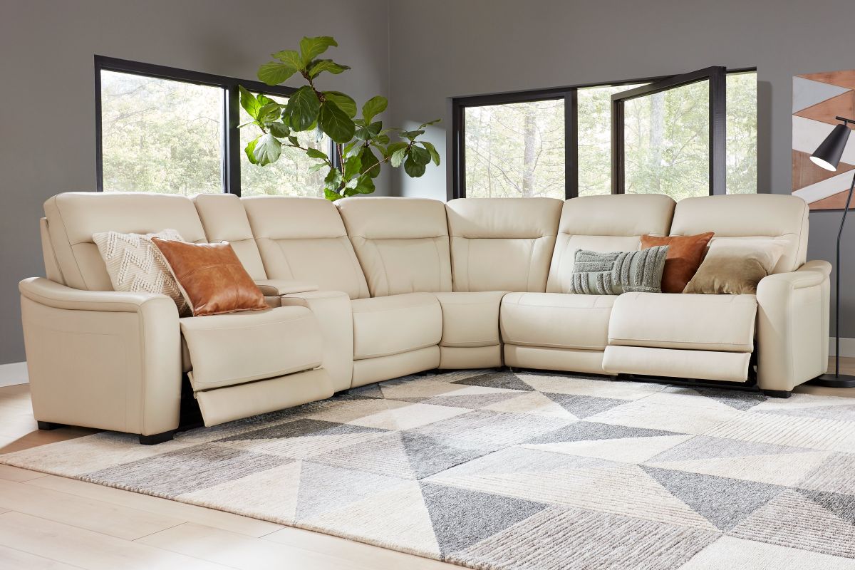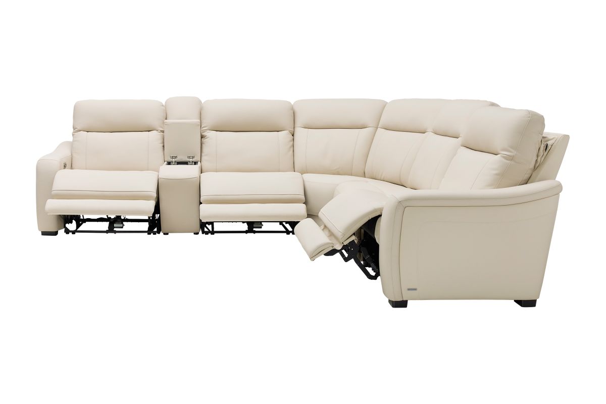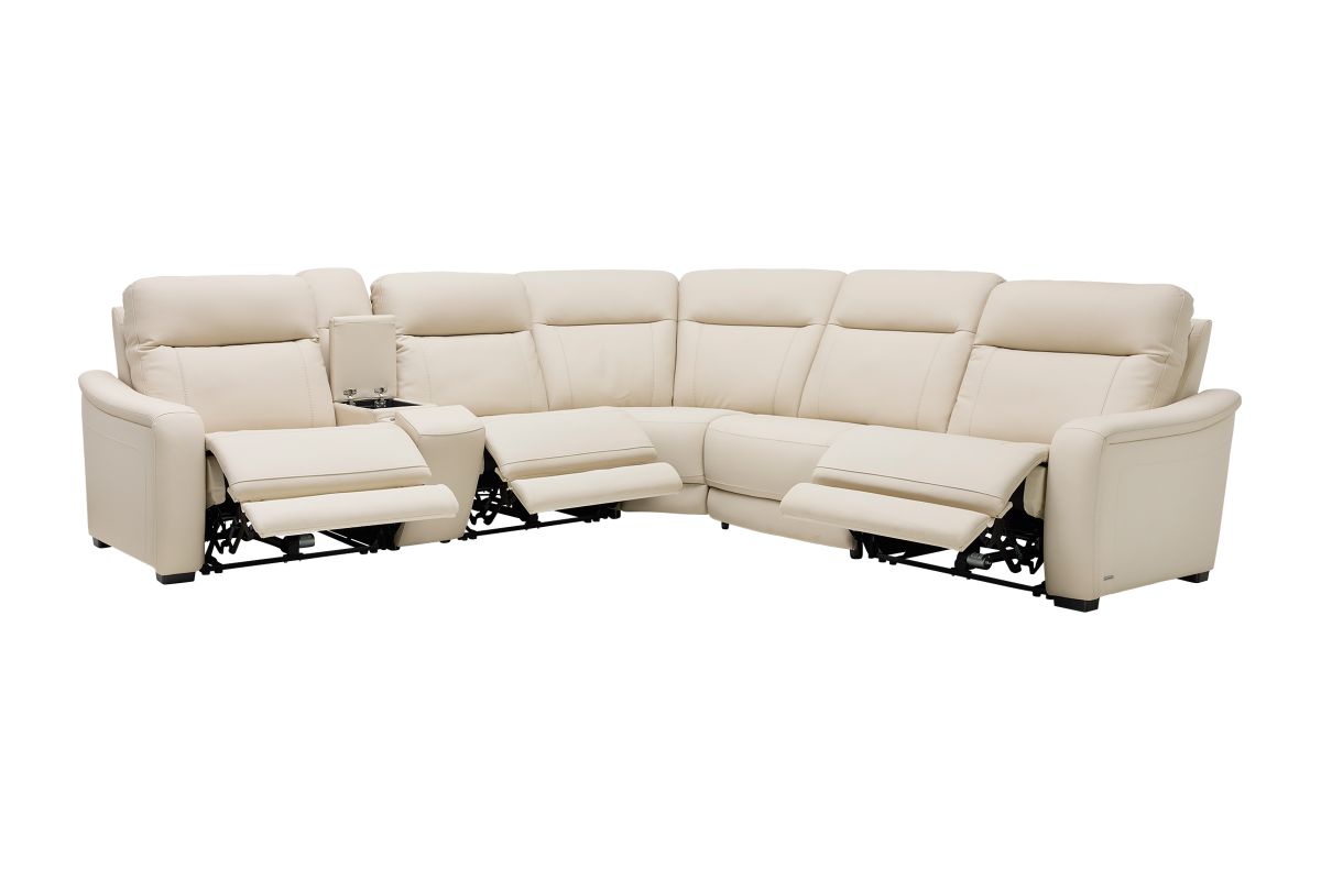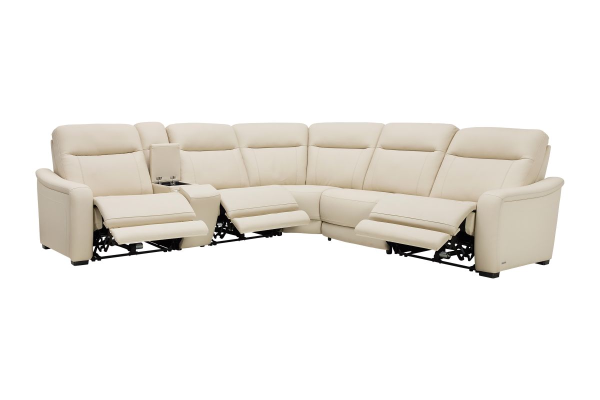 The sleek design, understated sophistication and casual profile of the Drew & Jonathan Newport sectional presents a warm, inviting feeling the whole family can enjoy. Modern in style, this sectional is upholstered in a soft, supple almond-colored top grain leather where the body touches with stylish double top-stitched seams for a luxurious look. Curved, padded arms, and wide seats provide ample space for exceptional comfort. The console adds more space as its hidden cupholders and storage compartment hold your relaxation essentials perfectly, as well as additional charging ports for devices. Dual power reclining functions provide the finishing touch, allowing adjustments in the head and footrest with a patented zero gravity mechanism for the ultimate lounging experience.