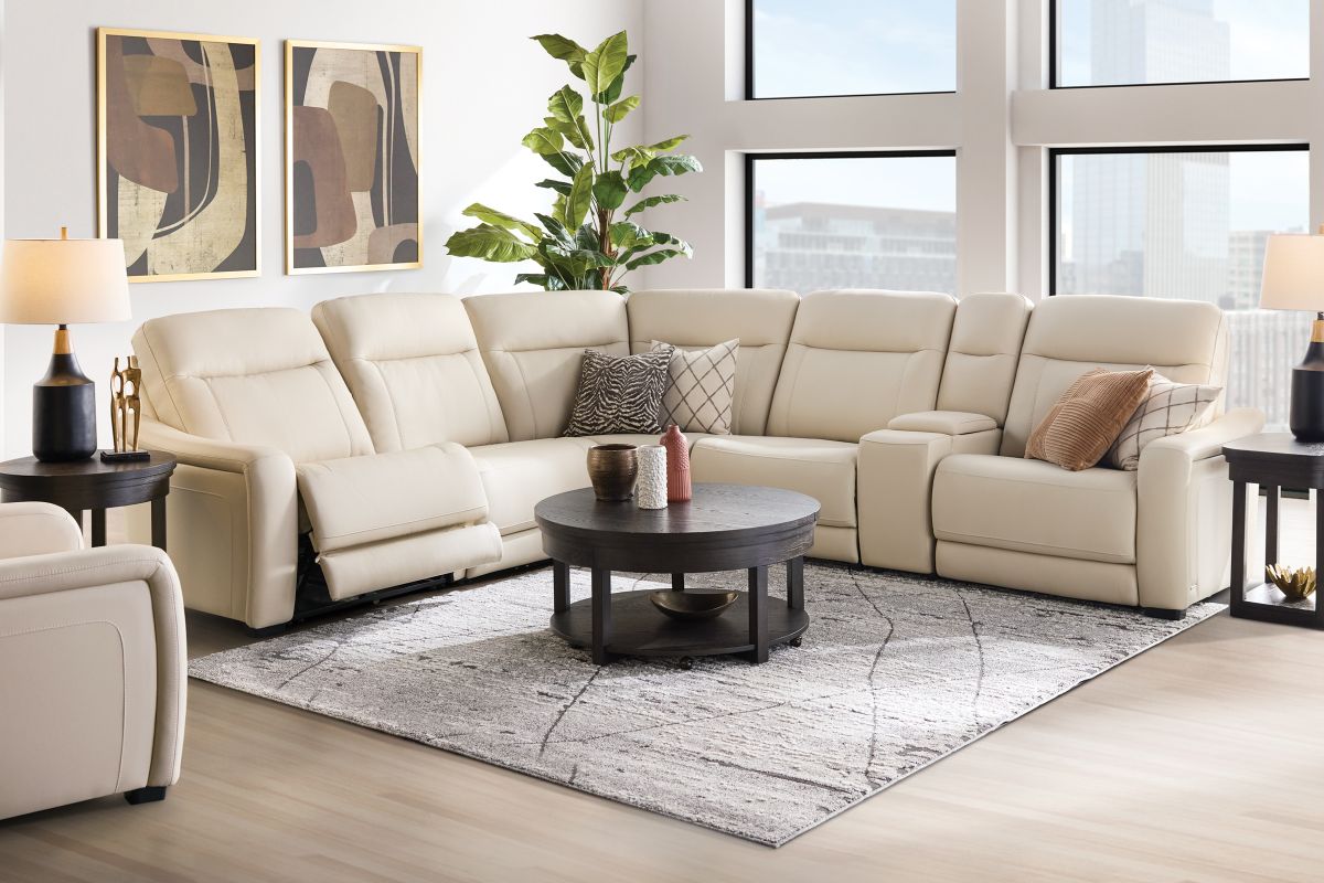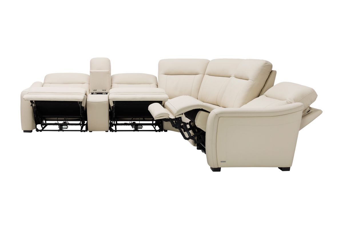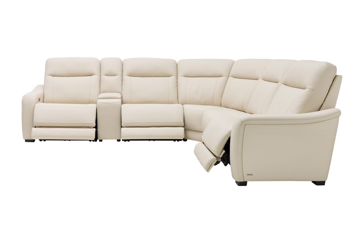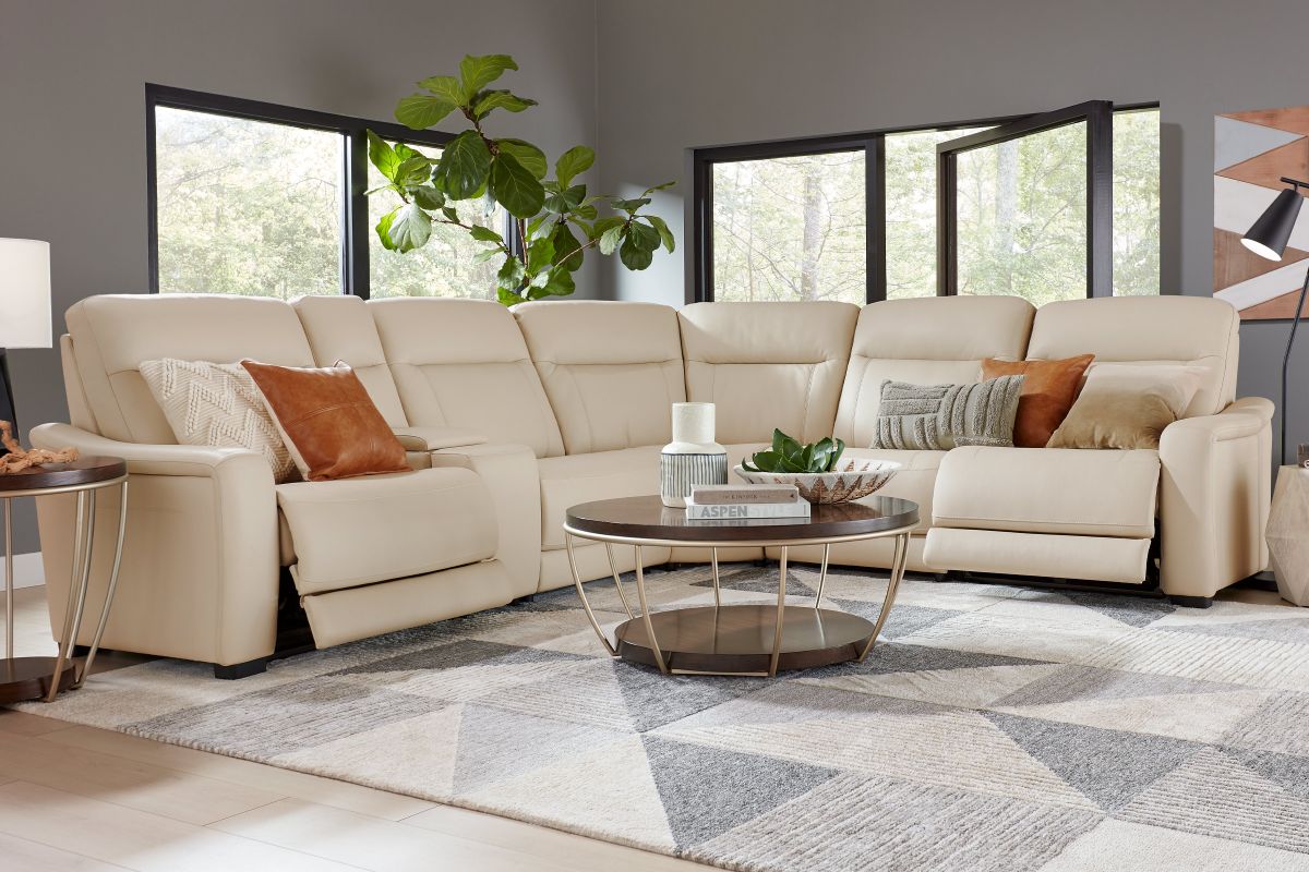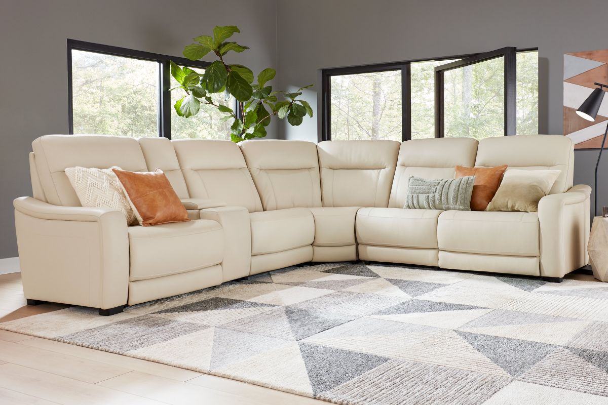 The sleek design, understated sophistication and casual profile of the Drew & Jonathan Newport sectional presents a warm, inviting feeling the whole family can enjoy. Modern in style, this sectional is upholstered in a soft, supple almond-colored top grain leather where the body touches with stylish double top-stitched seams for a luxurious look. Curved, padded arms, and wide seats provide ample space for exceptional comfort. The console adds more space as its hidden cupholders and storage compartment hold your relaxation essentials perfectly, as well as additional charging ports for devices. Dual power reclining functions provide the finishing touch, allowing adjustments in the head and footrest with a patented zero gravity mechanism for the ultimate lounging experience.