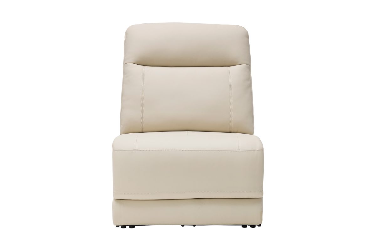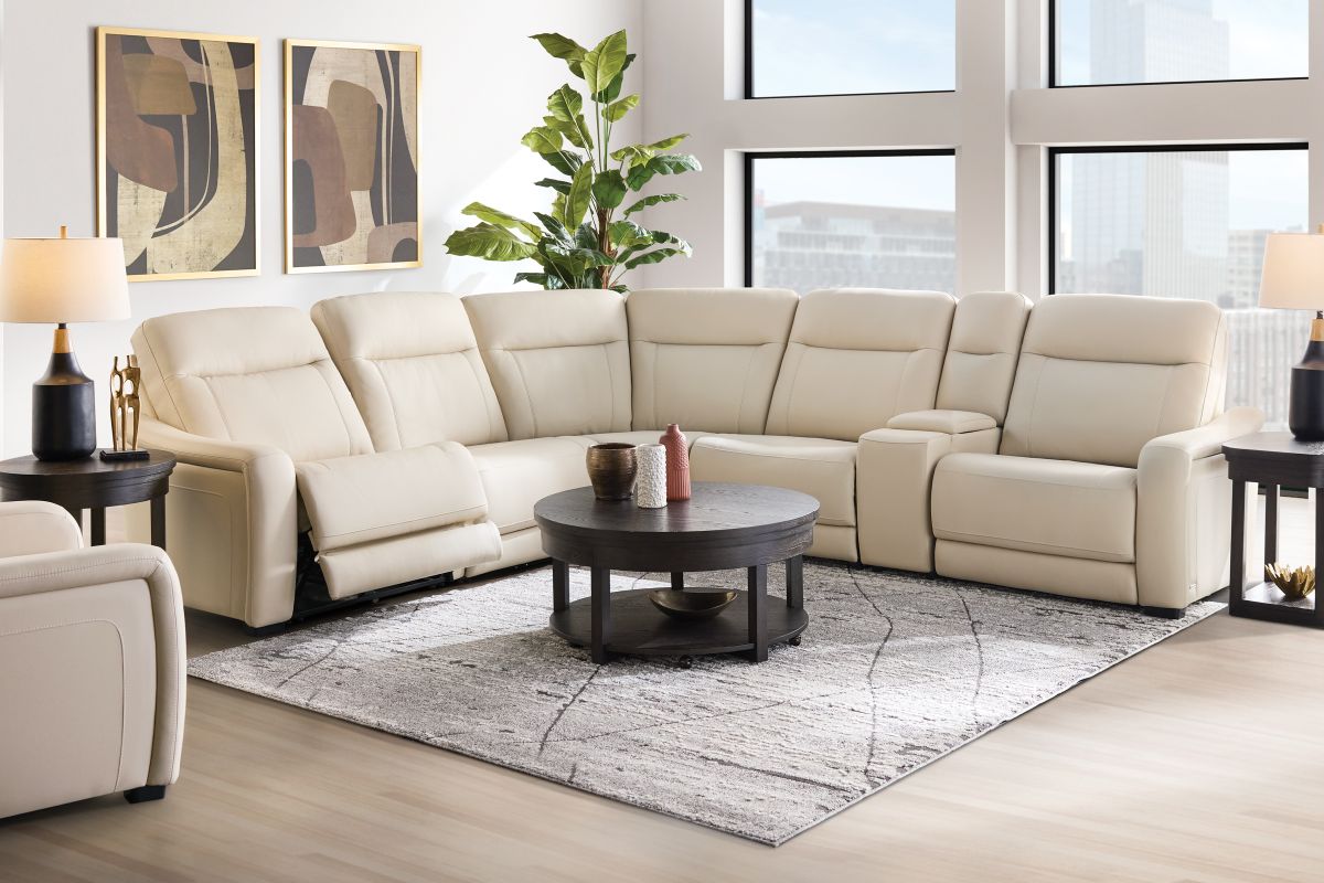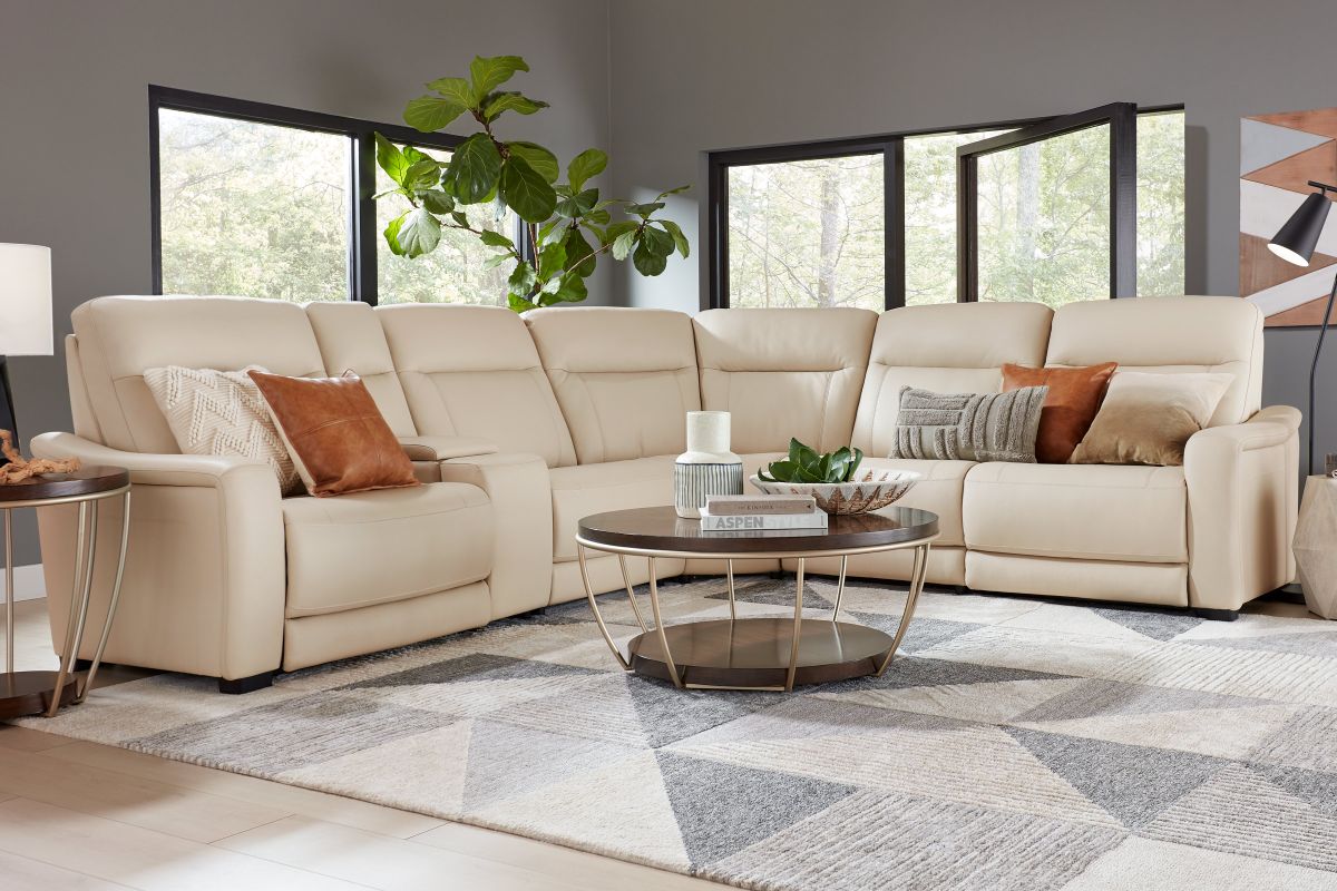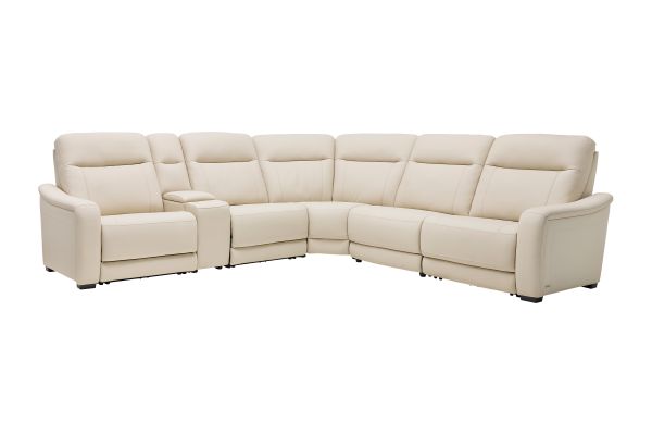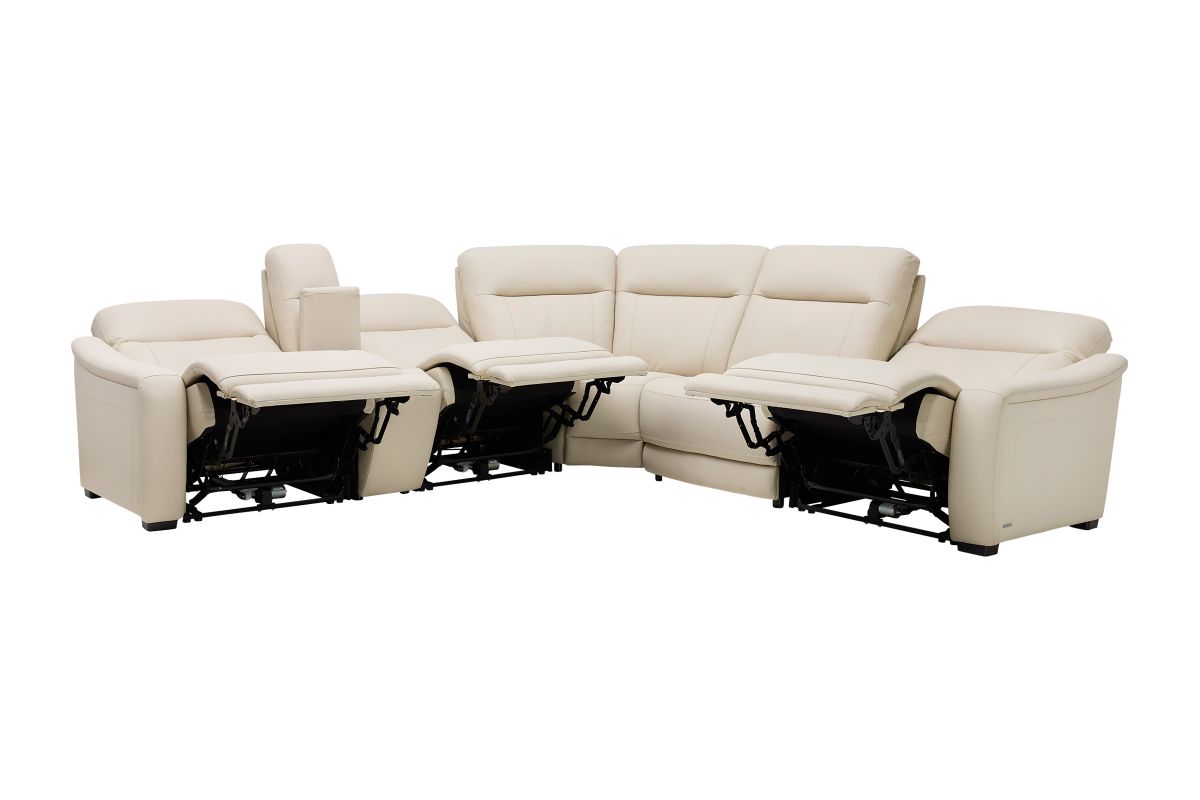 The sleek design, understated sophistication and casual profile of the Drew & Jonathan Newport sectional presents a warm, inviting feeling the whole family can enjoy. Modern in style, this sectional is upholstered in a soft, supple almond-colored top grain leather where the body touches with stylish double top-stitched seams for a luxurious look. Curved, padded arms, and wide seats provide ample space for exceptional comfort. The console adds more space as its hidden cupholders and storage compartment hold your relaxation essentials perfectly, as well as additional charging ports for devices. Dual power reclining functions provide the finishing touch, allowing adjustments in the head and footrest with a patented zero gravity mechanism for the ultimate lounging experience.