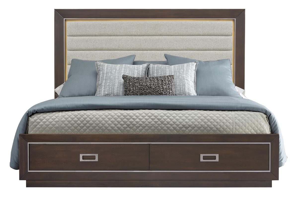 The Alexis bedroom features classic lines and sleek beveled framing to create a contemporary group that offers as much in function as it does in style. Featuring an upholstered headboard backed with a touch-LED light that adds comfort and elegance. The generous storage footboard is set on ball-bearing glides offering ease of use while the group is also complemented with metal inlays that are highlighted by the rich tobacco finish.