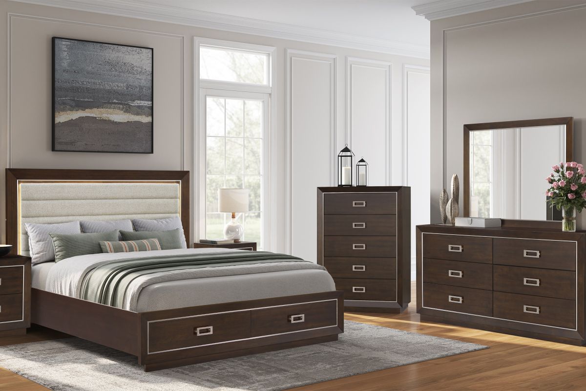 The Alexis bedroom features classic lines and sleek beveled framing to create a contemporary group that offers as much in function as it does in style. Featuring an upholstered headboard backed with a touch-LED light that adds comfort and elegance. The generous storage footboard is set on ball-bearing glides offering ease of use while the group is also complemented with metal inlays that are highlighted by the rich tobacco finish.