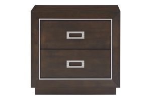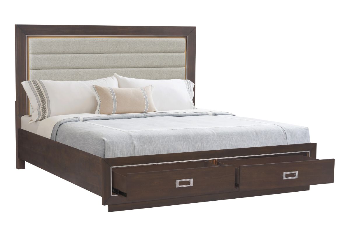 The Alexis bedroom features classic lines and sleek beveled framing to create a contemporary group that offers as much in function as it does in style. Featuring an upholstered headboard backed with a touch-LED light that adds comfort and elegance. The generous storage footboard is set on ball-bearing glides offering ease of use while the group is also complemented with metal inlays that are highlighted by the rich tobacco finish.
