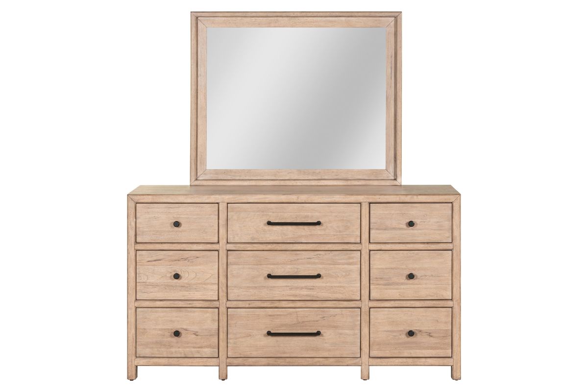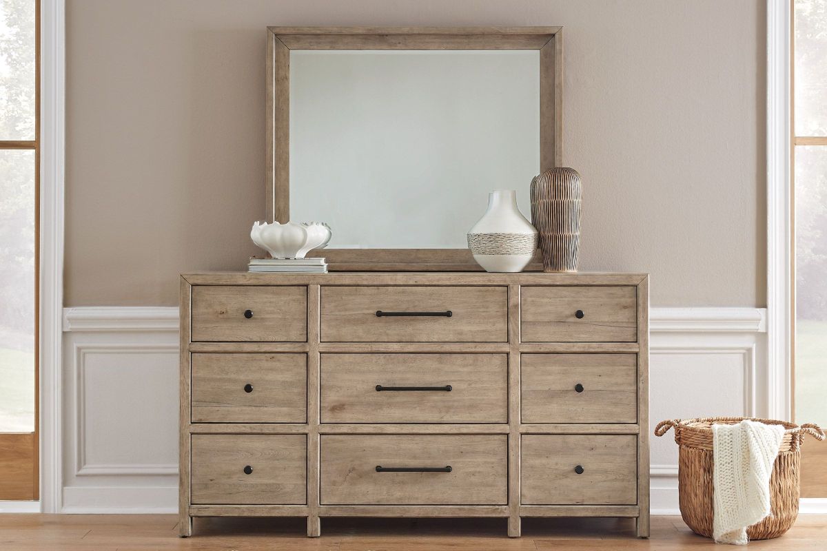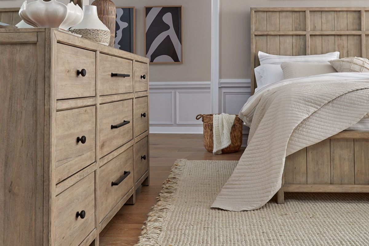 The Monre Bedroom Collection by Liberty is perfect for those who appreciate a mix of rustic charm and Traditional aestetics. Built with picture frame moldings on the headboard and drawers offering a refined architectural look.