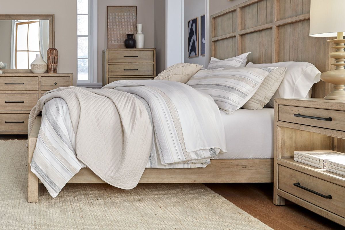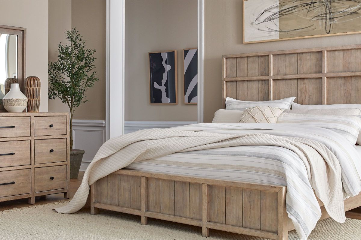 The Monre Bedroom Collection by Liberty is perfect for those who appreciate a mix of rustic charm and Traditional aestetics. Built with picture frame moldings on the headboard and drawers offering a refined architectural look.