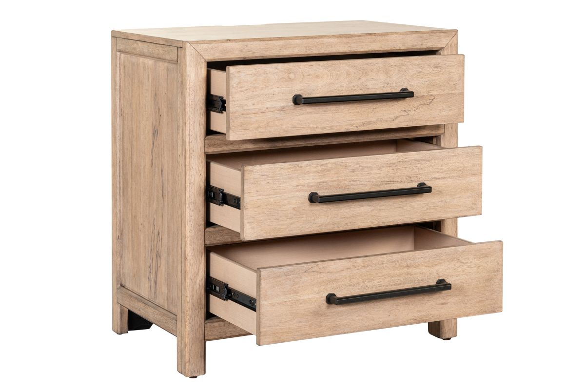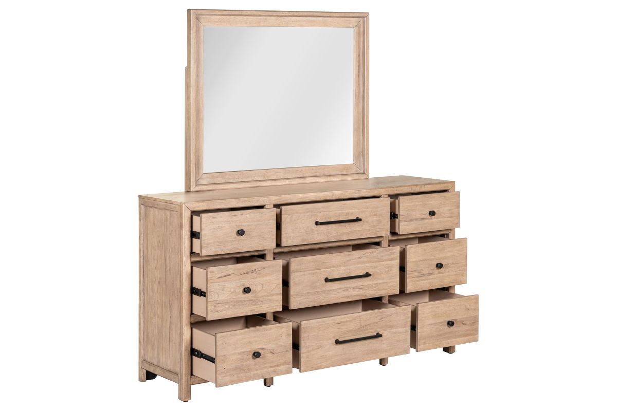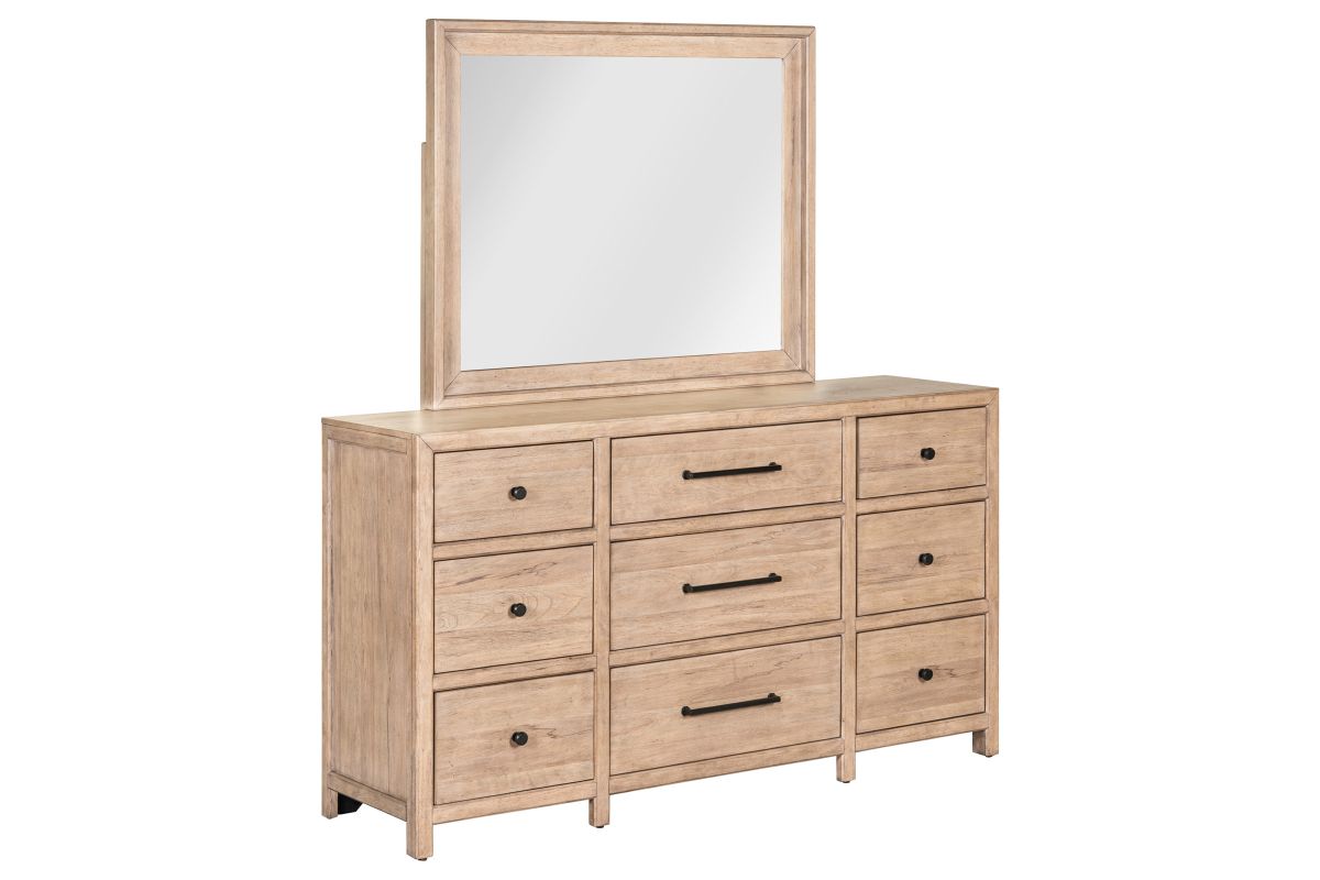 Crafted from Poplar solids and Rustic Flat Cut Birch veneers in a Barley Buff finish, the Monroe blends timeless style with thoughtful details. The bed features score lines on the headboard and footboard, creating a charming planked effect, while picture frame molding adds depth and dimension. The dresser, chest, and nightstand’s clean lines and flat drawer fronts are softened by canted parting rails, and includes soft-closing drawer guides, premium felt-lined top drawers, and cedar-lined bottom drawers for elegant storage. The nightstand features a built-in charging station that includes 2 AC outlets, 1 USB-A, and 1 USB-C port, keeping your devices conveniently charged. Complete the look with the landscape mirror, featuring a 1-inch beveled edge and bolt-on supports for secure attachment. The Monroe brings refined craftsmanship and sophisticated charm to your bedroom.