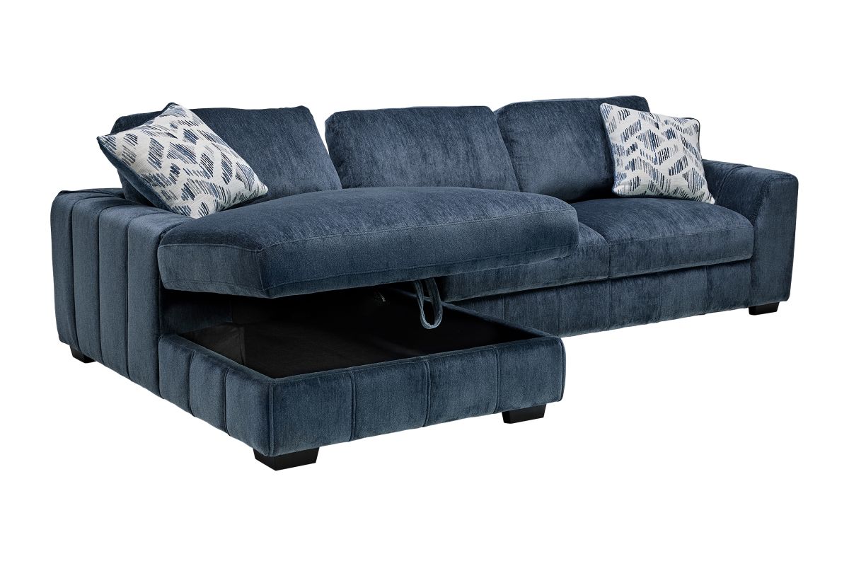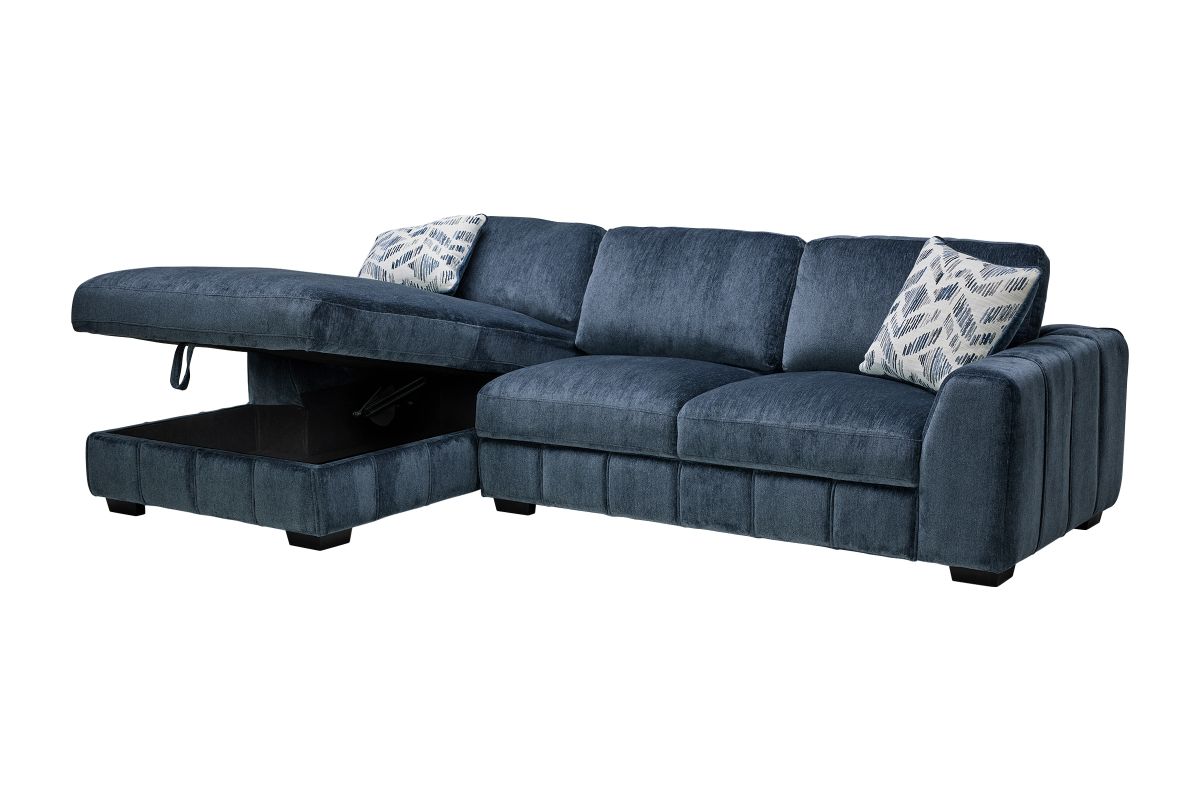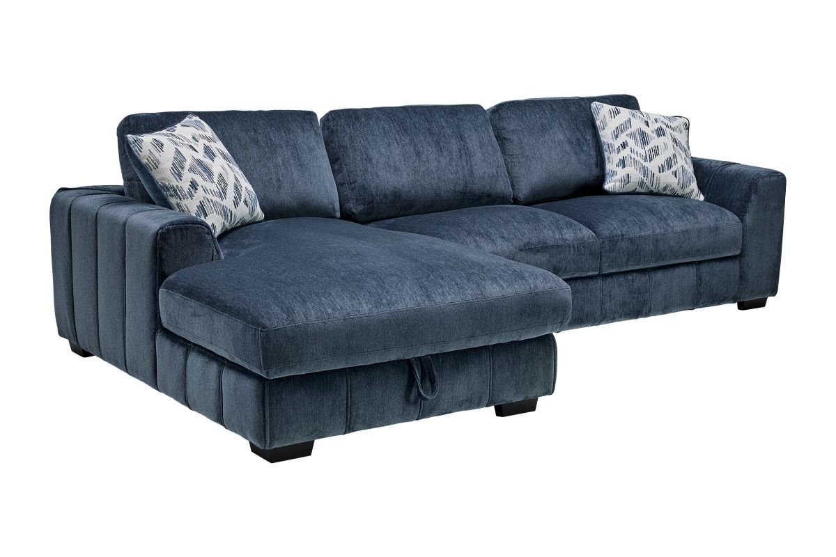 Bring stylish functionality into your living space with the Overnight sectional and coordinating swivel chair. The sectional, available in both blue and grey fabric, offers a versatile design perfect for lounging or accommodating guests. Featuring a lift-up storage chaise, it provides a convenient space to stow away blankets, pillows, or other essentials. Plush cushions and vertical channel tufting add a sophisticated touch while ensuring luxurious comfort. Whether you're hosting guests or unwinding after a long day, this sectional set combines modern design with everyday practicality.