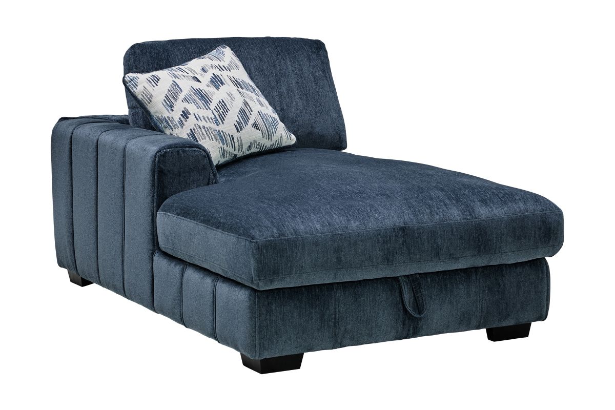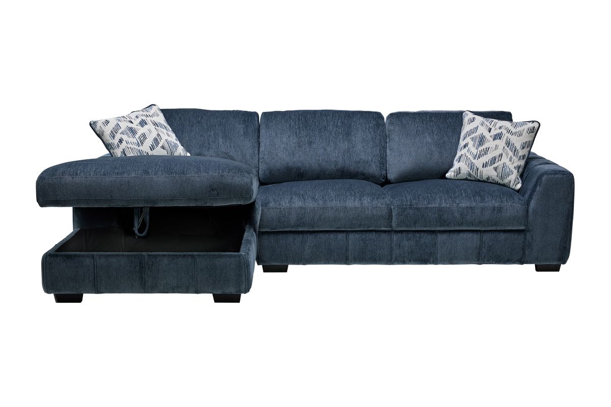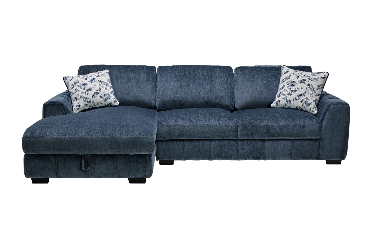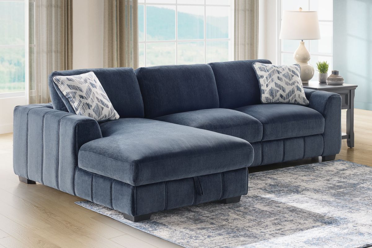 Bring stylish functionality into your living space with the Overnight sectional and coordinating swivel chair. The sectional, available in both blue and grey fabric, offers a versatile design perfect for lounging or accommodating guests. Featuring a lift-up storage chaise, it provides a convenient space to stow away blankets, pillows, or other essentials. Plush cushions and vertical channel tufting add a sophisticated touch while ensuring luxurious comfort. Whether you're hosting guests or unwinding after a long day, this sectional set combines modern design with everyday practicality.
