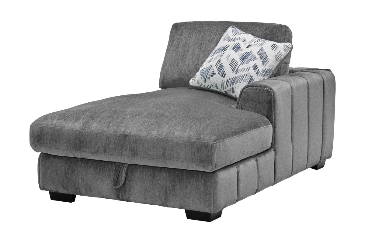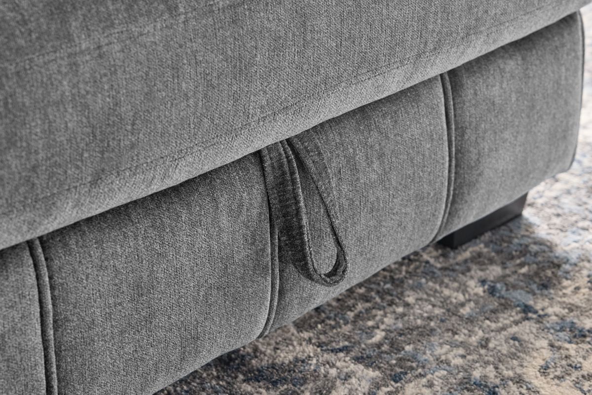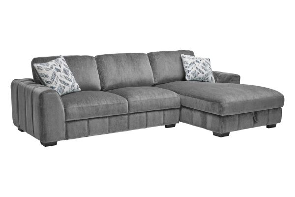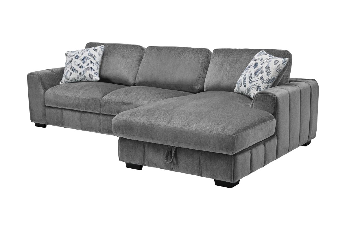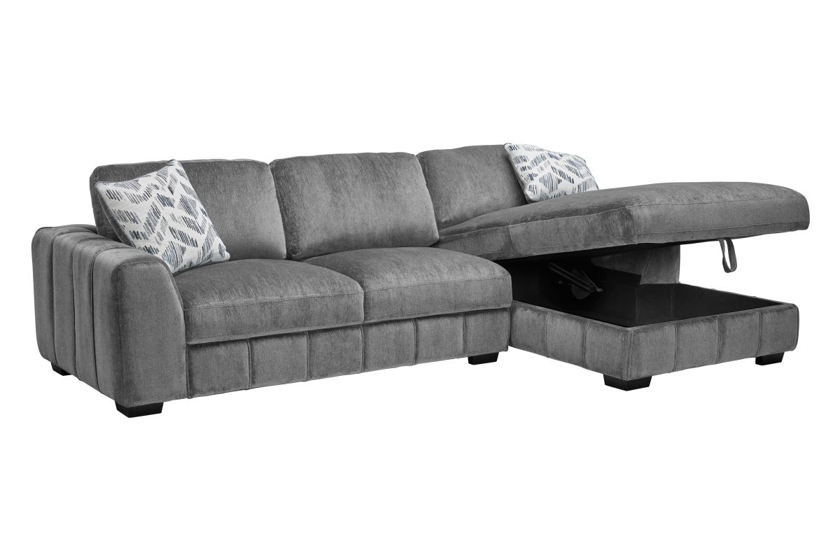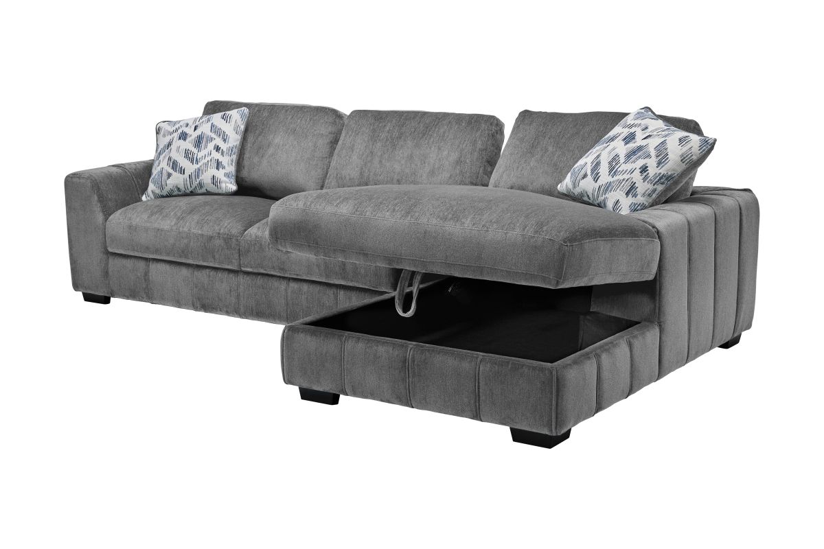 Bring stylish functionality into your living space with the Overnight sectional and coordinating swivel chair. The sectional, available in both blue and grey fabric, offers a versatile design perfect for lounging or accommodating guests. Featuring a lift-up storage chaise, it provides a convenient space to stow away blankets, pillows, or other essentials. Plush cushions and vertical channel tufting add a sophisticated touch while ensuring luxurious comfort. Whether you're hosting guests or unwinding after a long day, this sectional set combines modern design with everyday practicality.