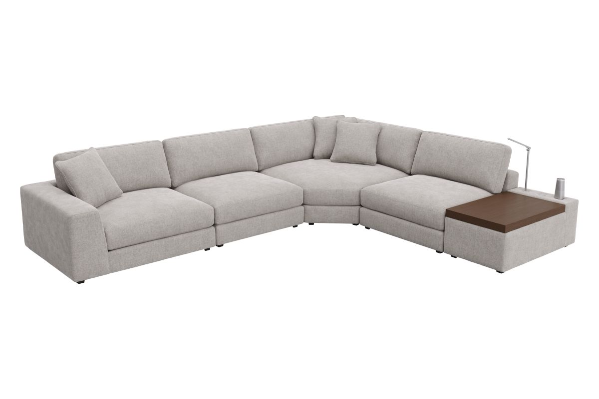 Discover the unlimited possibilities of the Drew & Jonathan ModularThree collection, thoughtfully designed to deliver the utmost in comfort and flexibility. Contemporary in style and upholstered in rich gray chenille, the tailored look of this innovative seating solution is accentuated by deep lounge seats offering the indulgent luxury of ultra-comfortable feather blend cushions. Each piece is upholstered on all sides, creating endless opportunities for reconfiguration and individual use. The extra-large console features a reading light, retracting USB hub and a Bluetooth speaker magnetically mounted to a wireless charger. Under the console's sliding wood-top table is maximum space for storage of even the bulkiest relaxation essentials. Select a preconfigured design or visit a showroom to learn about individual components and create the modular solution perfect for your space and style.