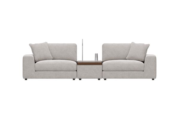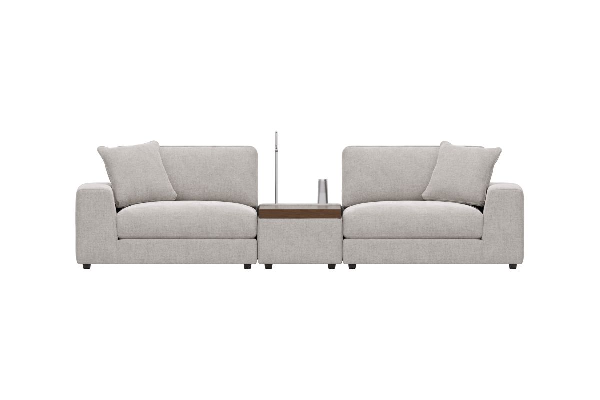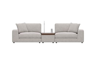 Discover the unlimited possibilities of the Drew & Jonathan ModularThree collection, thoughtfully designed to deliver the utmost in comfort and flexibility. Contemporary in style and upholstered in rich gray chenille, the tailored look of this innovative seating solution is accentuated by deep lounge seats offering the indulgent luxury of ultra-comfortable feather blend cushions. Each piece is upholstered on all sides, creating endless opportunities for reconfiguration and individual use. The extra-large console features a reading light, retracting USB hub and a Bluetooth speaker magnetically mounted to a wireless charger. Under the console's sliding wood-top table is maximum space for storage of even the bulkiest relaxation essentials. Select a preconfigured design or visit a showroom to learn about individual components and create the modular solution perfect for your space and style.