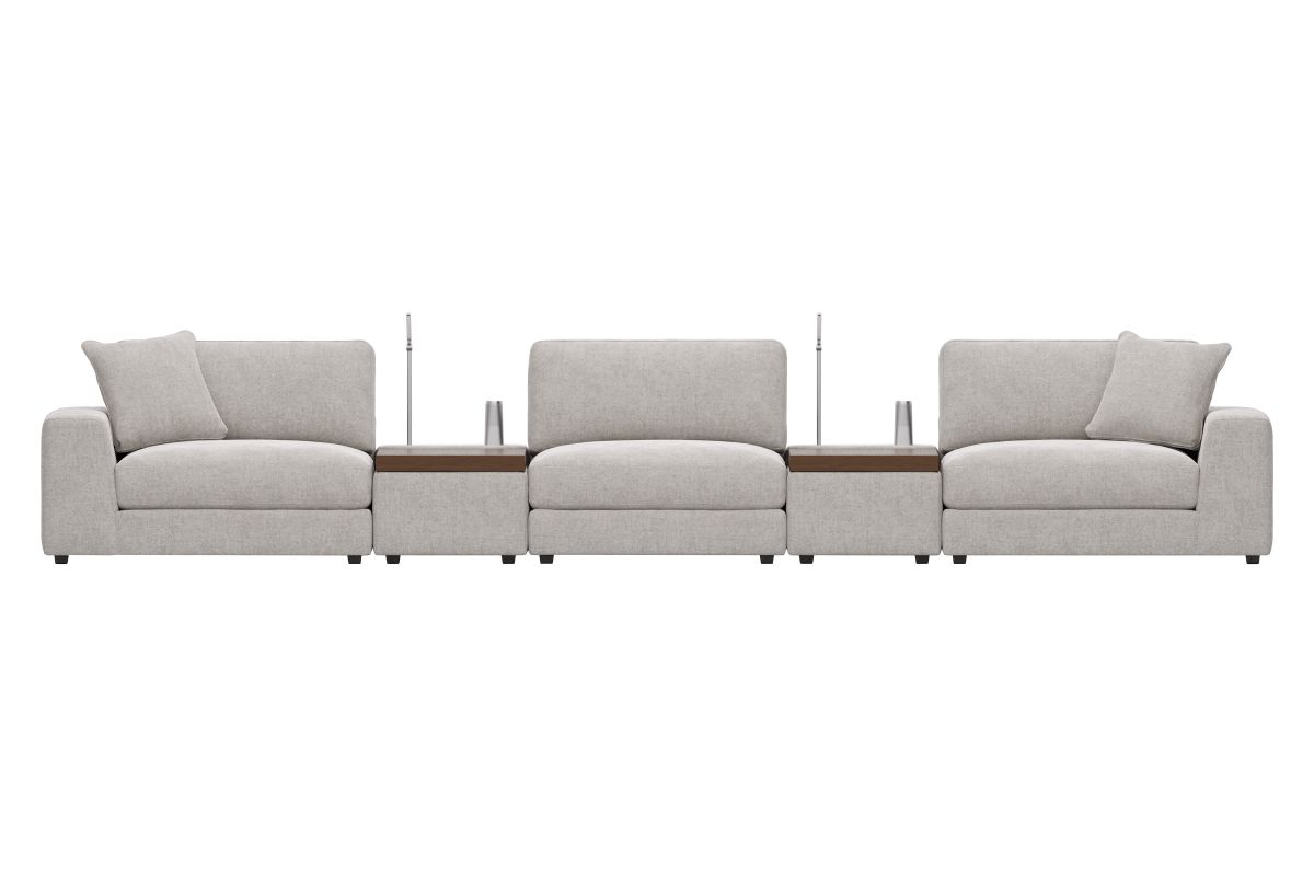 Discover the unlimited possibilities of the Drew & Jonathan ModularThree collection, thoughtfully designed to deliver the utmost in comfort and flexibility. Contemporary in style and upholstered in rich gray chenille, the tailored look of this innovative seating solution is accentuated by deep lounge seats offering the indulgent luxury of ultra-comfortable feather blend cushions. Each piece is upholstered on all sides, creating endless opportunities for reconfiguration and individual use. The extra-large console features a reading light, retracting USB hub and a Bluetooth speaker magnetically mounted to a wireless charger. Under the console's sliding wood-top table is maximum space for storage of even the bulkiest relaxation essentials. Select a preconfigured design or visit a showroom to learn about individual components and create the modular solution perfect for your space and style.