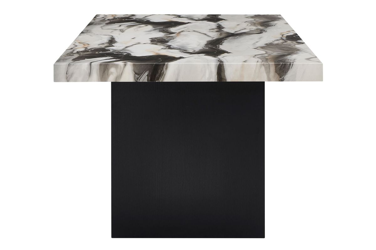 This bold and contemporary dining group features a dramatic marble-look tabletop with dynamic veining that mimics natural stone, adding an upscale, artistic touch to any dining space. The sculptural black pedestal base complements the striking tabletop, creating a luxurious edge perfect for elevating everyday meals and stylish entertaining. Paired with sleek, channel-tufted chairs