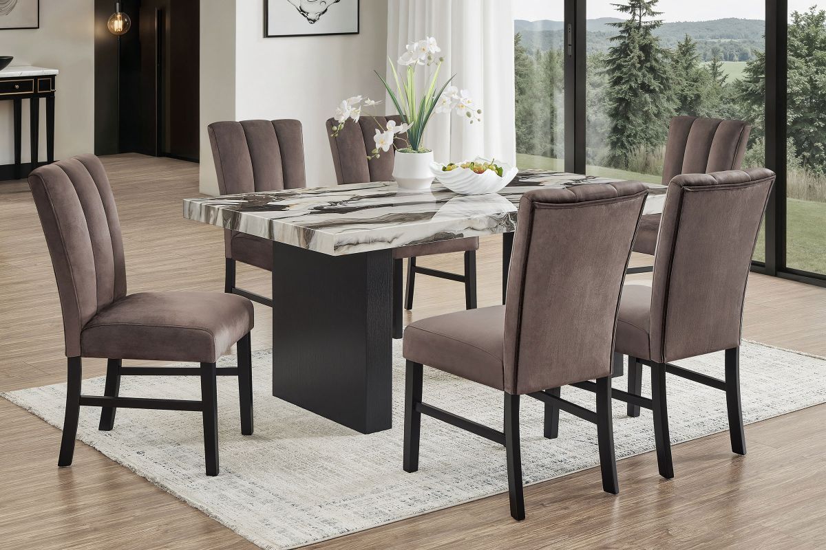 This bold and contemporary dining group features a dramatic marble-look tabletop with dynamic veining that mimics natural stone, adding an upscale, artistic touch to any dining space. The sculptural black pedestal base complements the striking tabletop, creating a luxurious edge perfect for elevating everyday meals and stylish entertaining. Paired with sleek, channel-tufted chairs