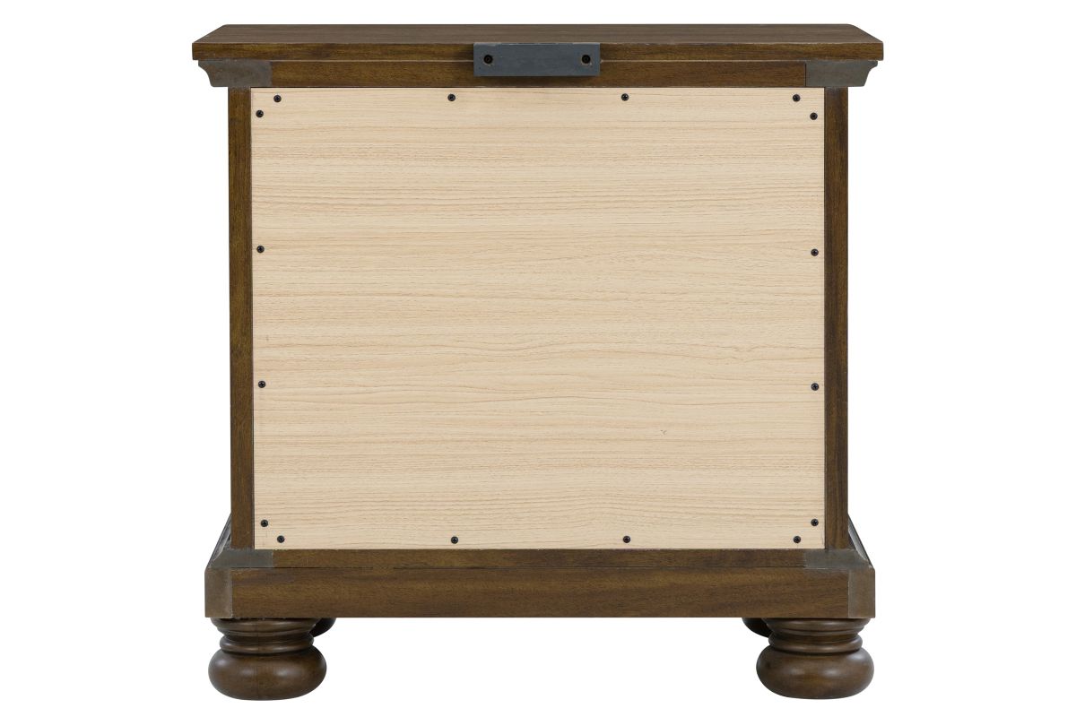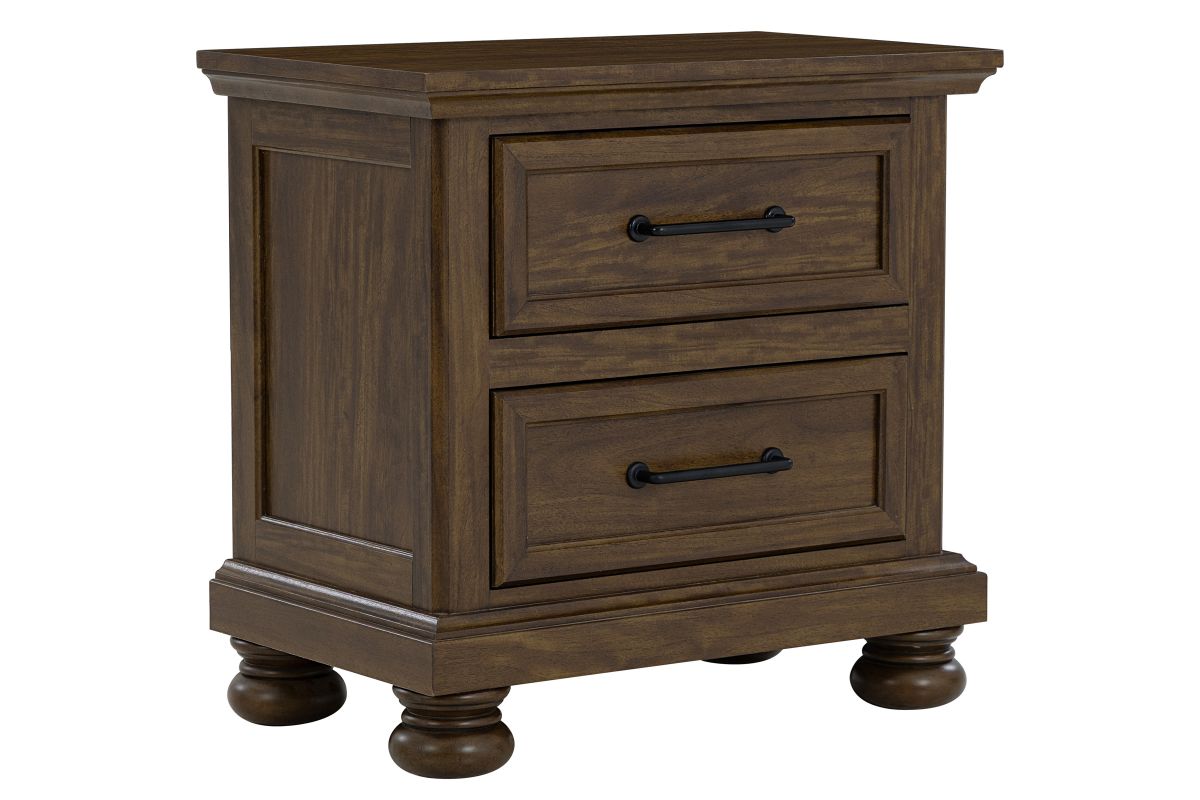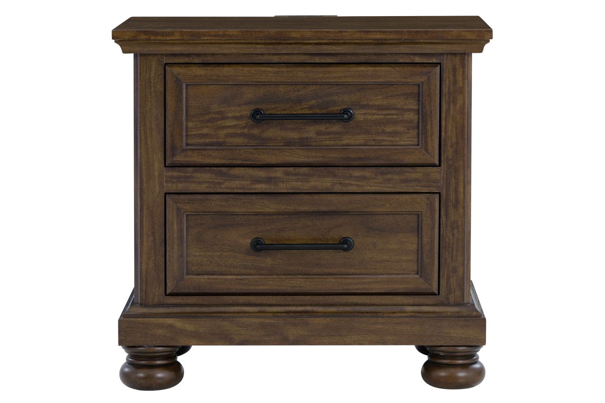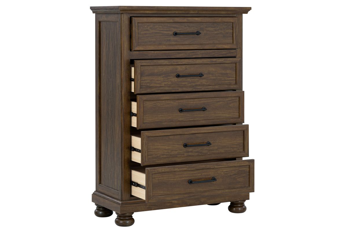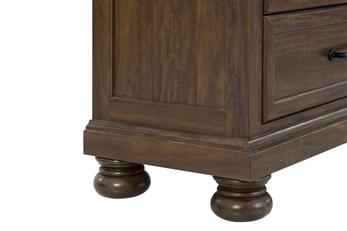 The Arthur Collection has a curved headboard offers a classic, elegant silhouette, with two spacious drawers built into the footboard provide extra storage for linens or seasonal clothing. Includes a dresser with mirror, nightstand, and chest, all featuring coordinated hardware and bun feet.