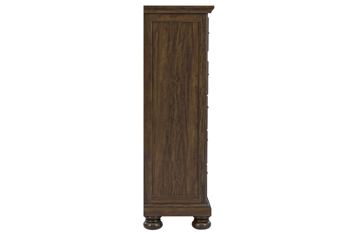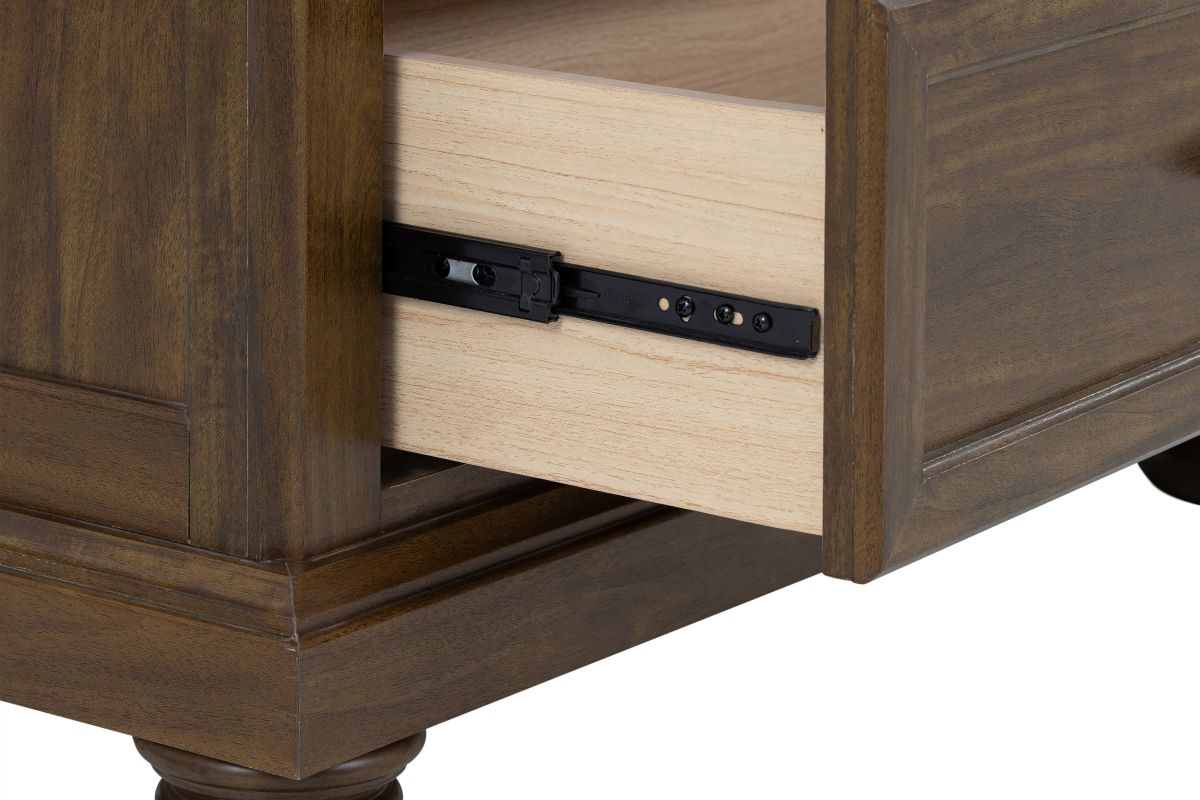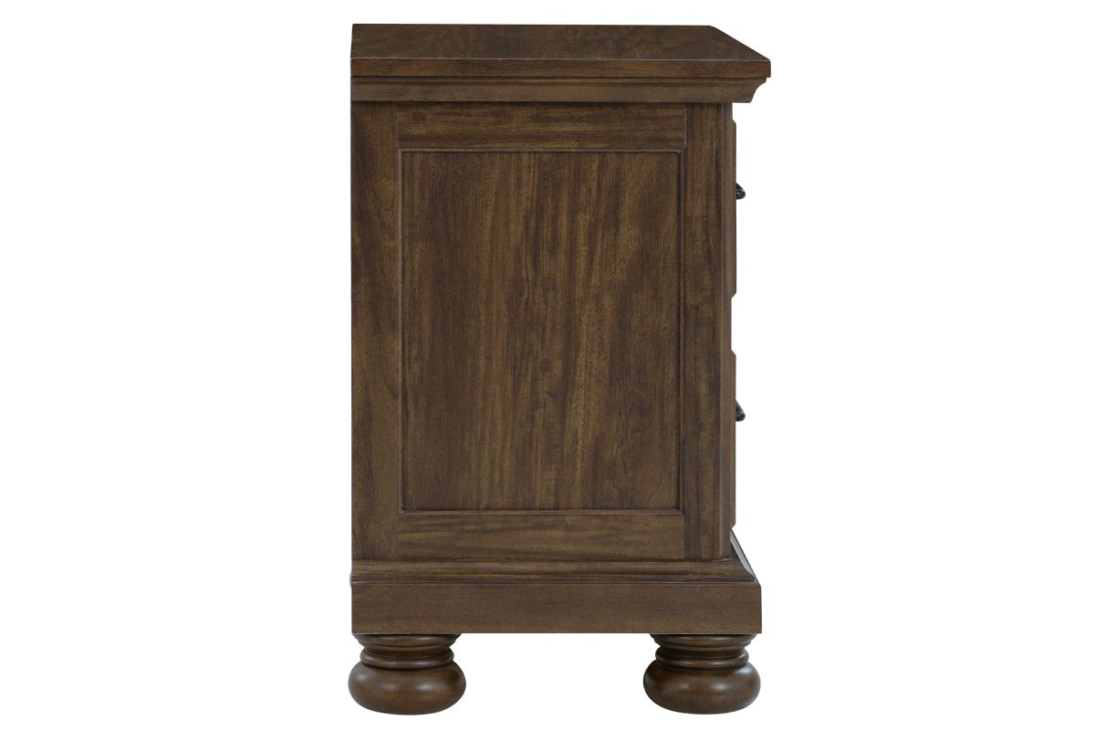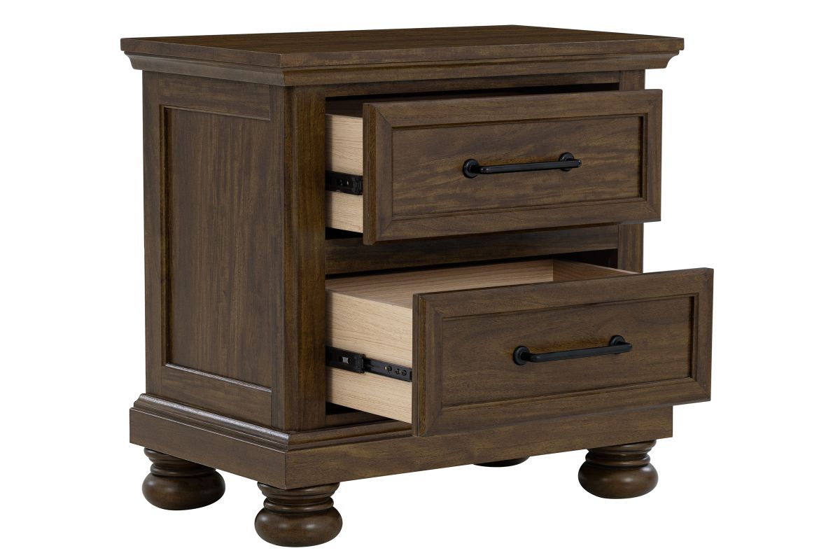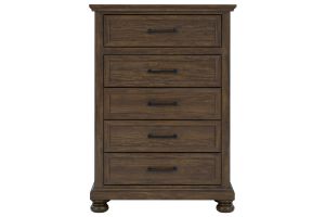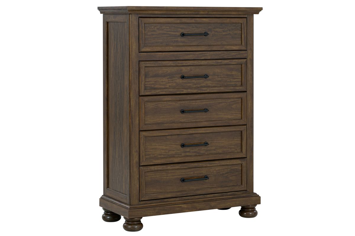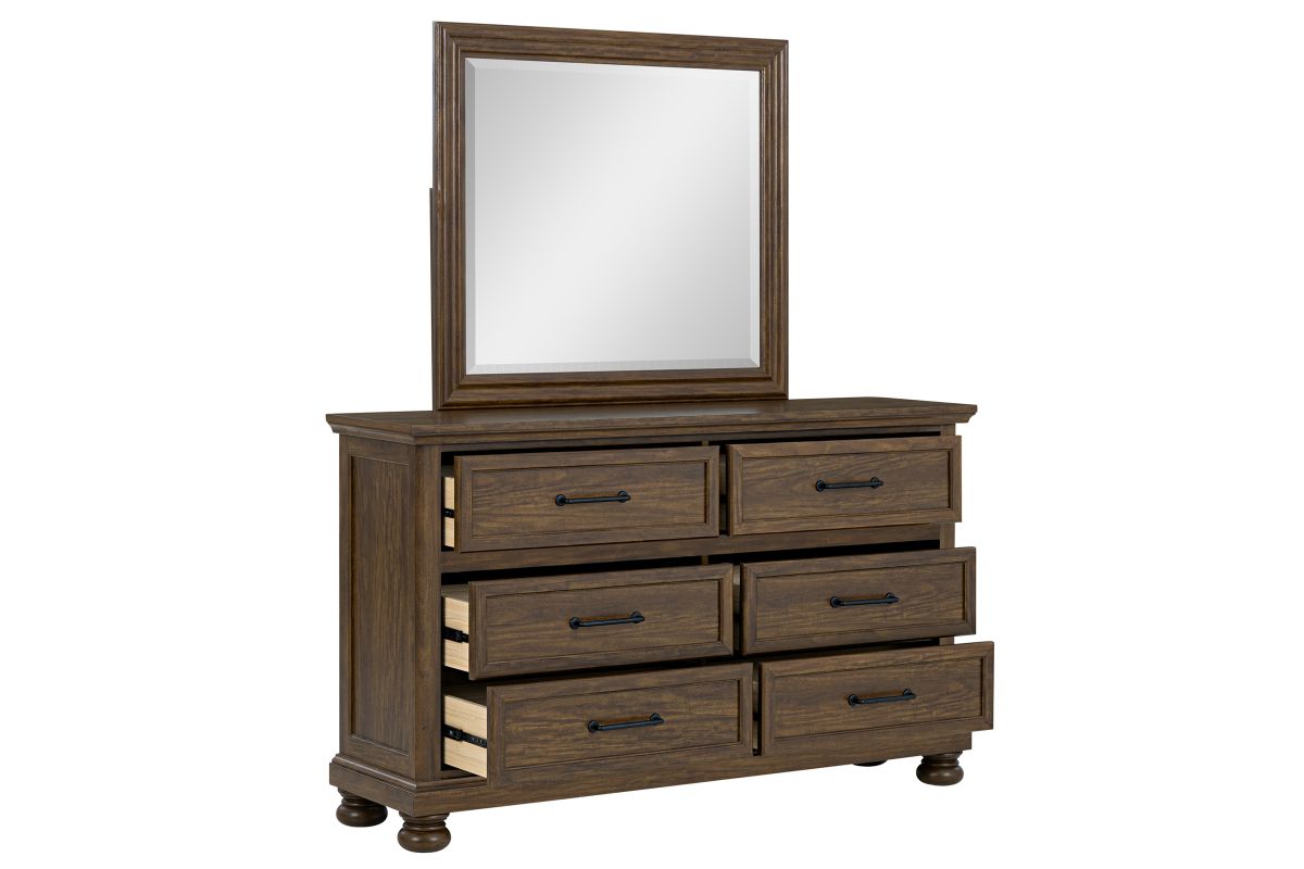 The Arthur Collection has a curved headboard offers a classic, elegant silhouette, with two spacious drawers built into the footboard provide extra storage for linens or seasonal clothing. Includes a dresser with mirror, nightstand, and chest, all featuring coordinated hardware and bun feet.
