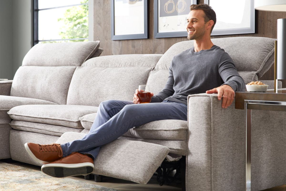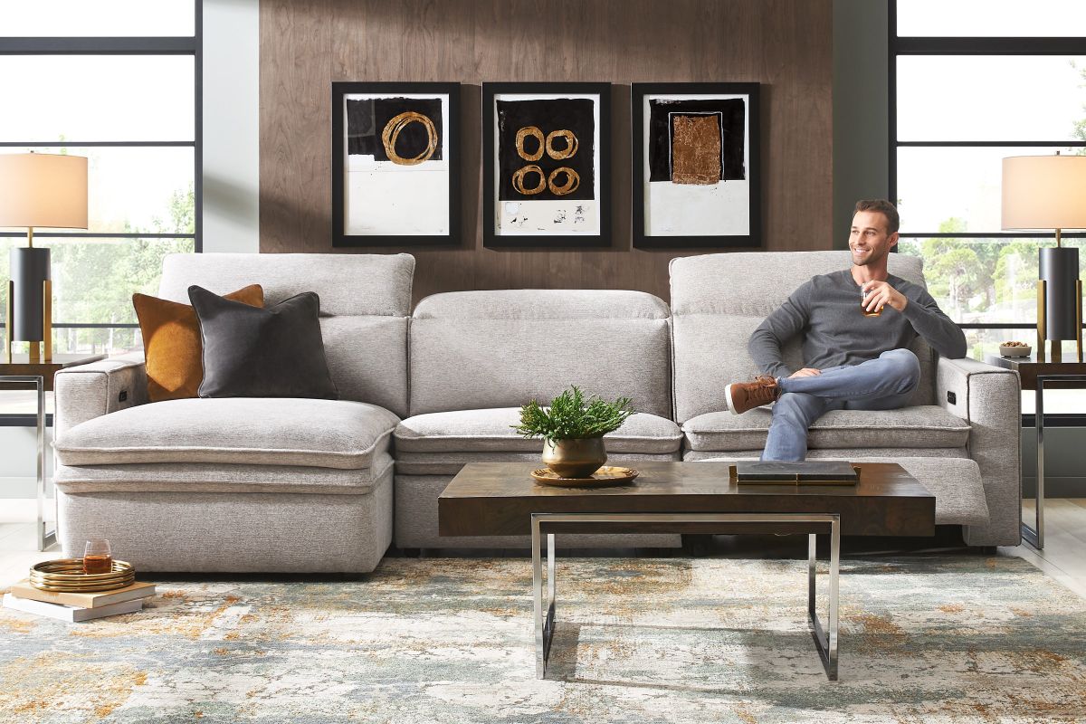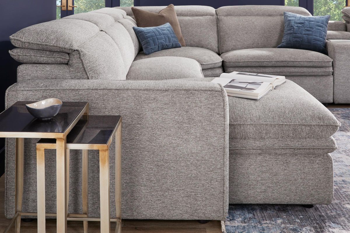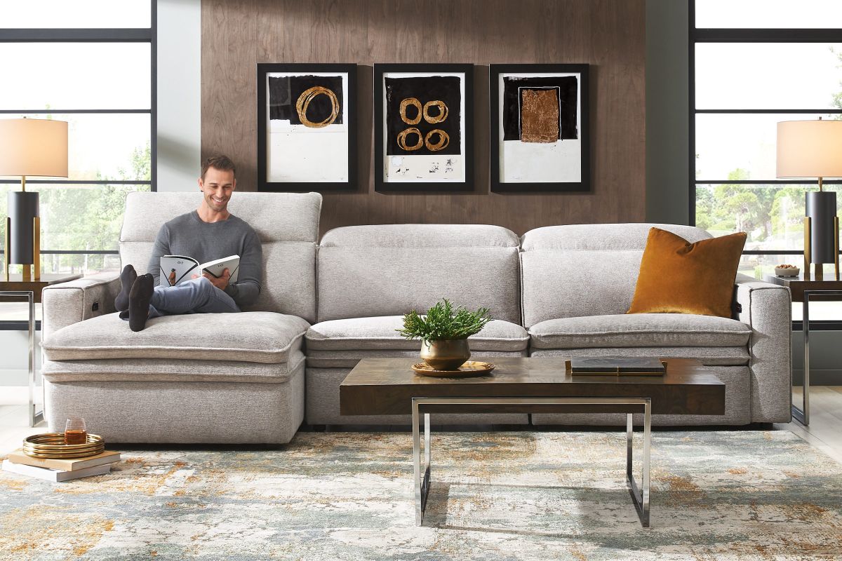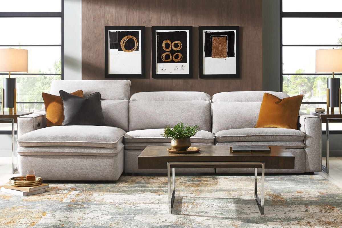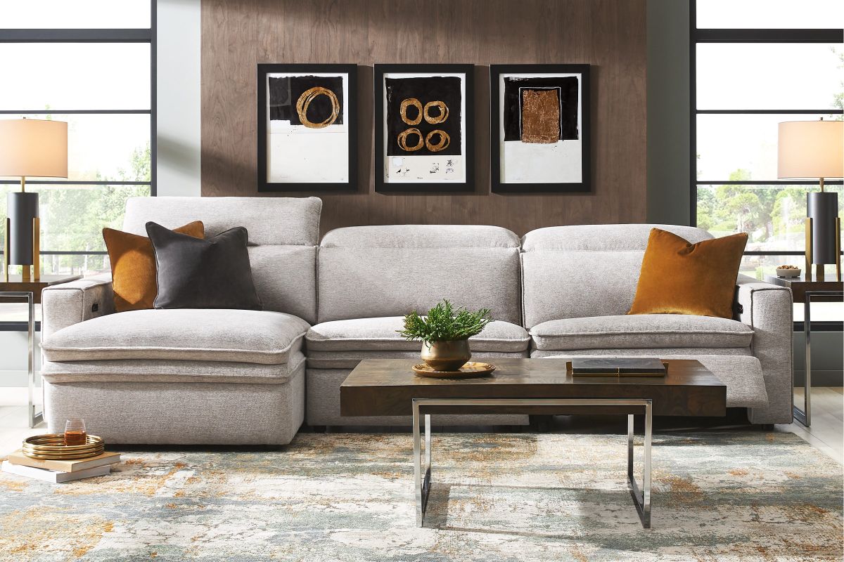 Sleek, chic, and altogether unique, the Salvator Street sectional's spacious seating and seamless functionality is the perfect blend of modern comfort and urban sophistication. Upholstered in a woven fabric, this sectional features stylish track arms, dark cylindrical legs and attached double pillow pad seat cushions for a luxurious feel. The dual power reclining feature allows adjustment in the head and footrest for personalized support while the chaise allows adjustment in the headrest for the ultimate lounging experience.