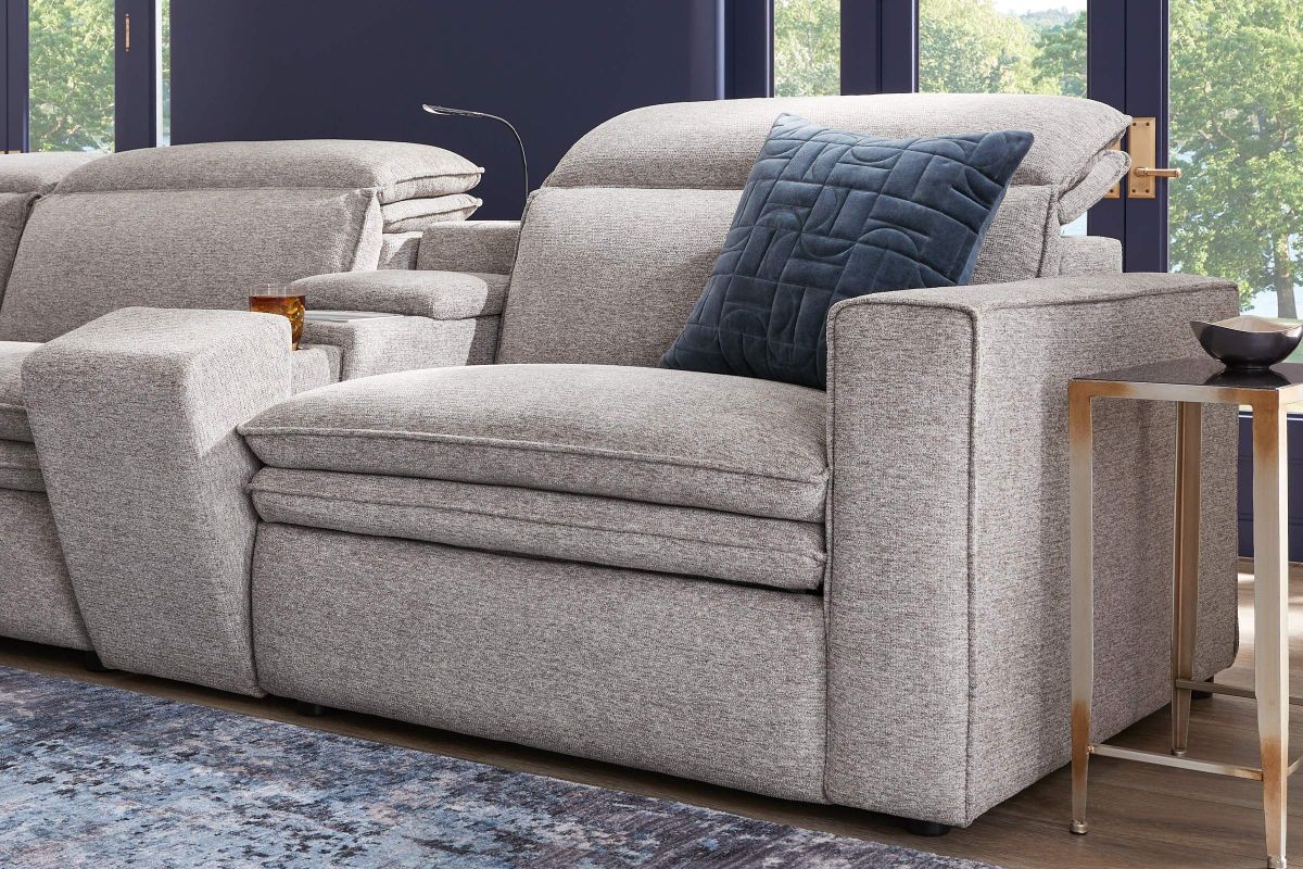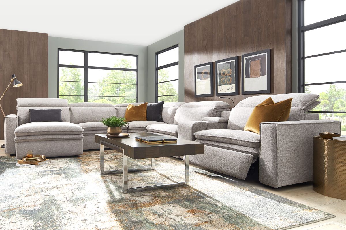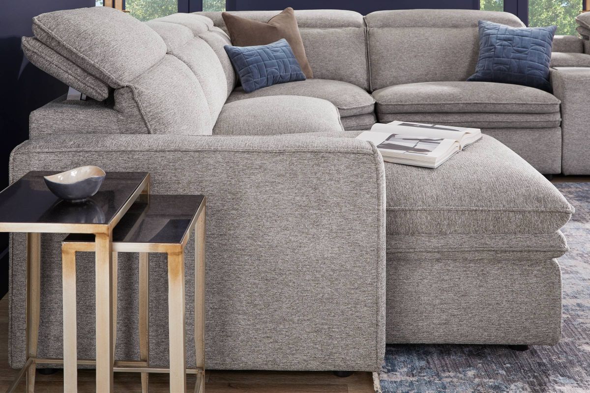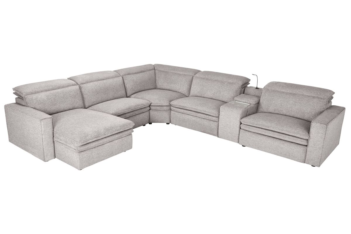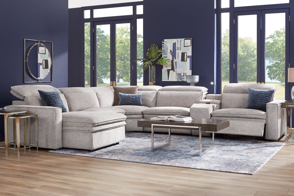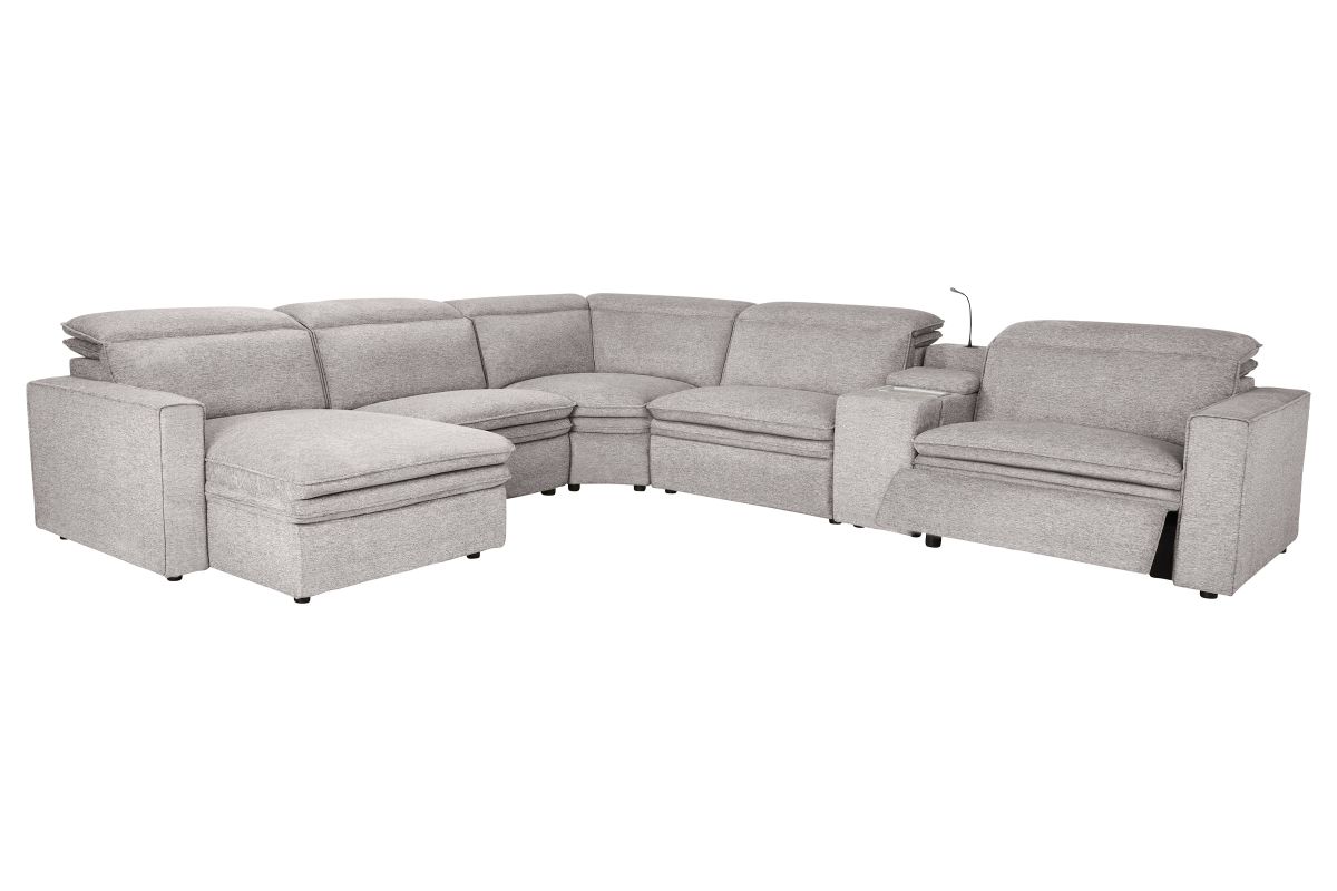 Sleek, chic, and altogether unique, the Drew & Jonathan Salvator Street sectional's spacious seating and seamless functionality is the perfect blend of modern comfort and urban sophistication. Upholstered in a woven fabric, this sectional features stylish track arms and attached double pillow pad seat cushions for a luxurious feel. The dual power reclining feature allows adjustment in the head and footrest for personalized support while the chaise allows adjustment in the headrest for the ultimate lounging experience. The media console includes a storage compartment, cupholders and a reading light for convenience.