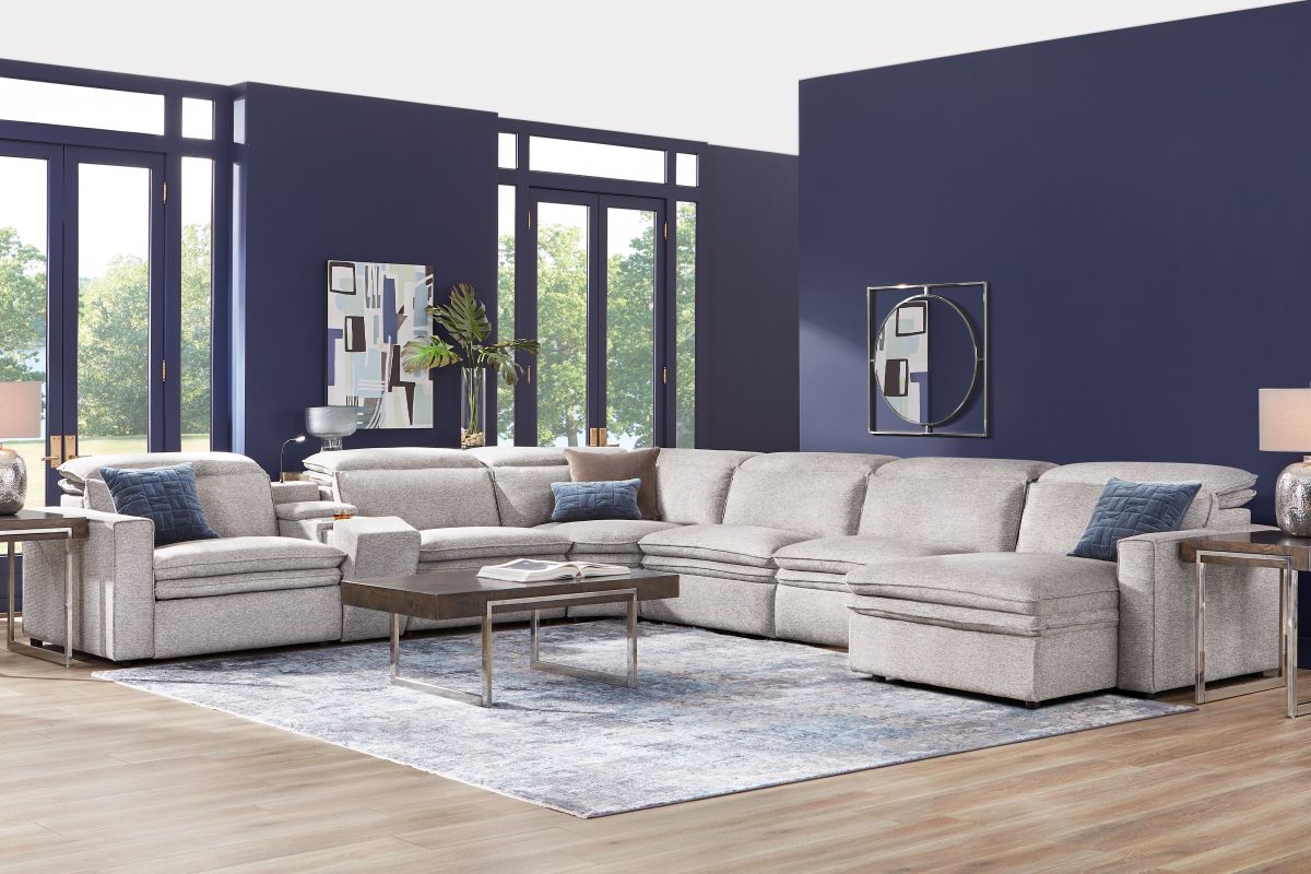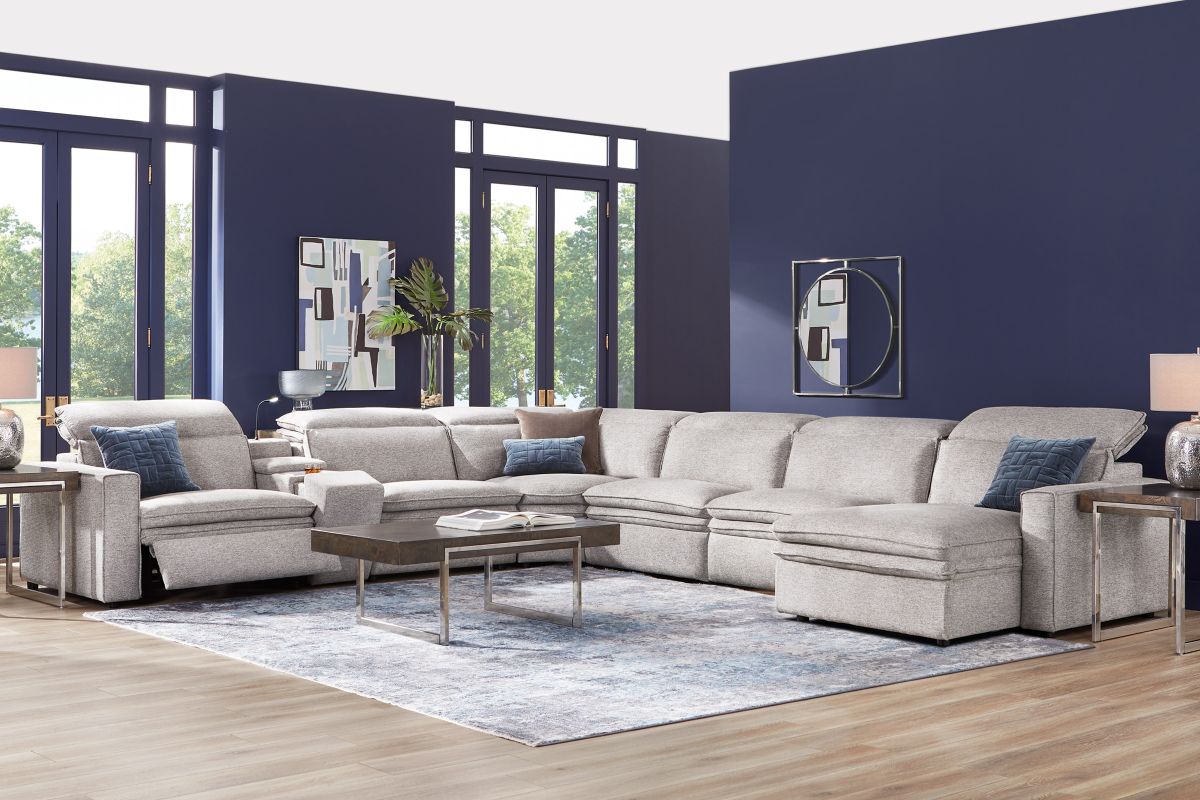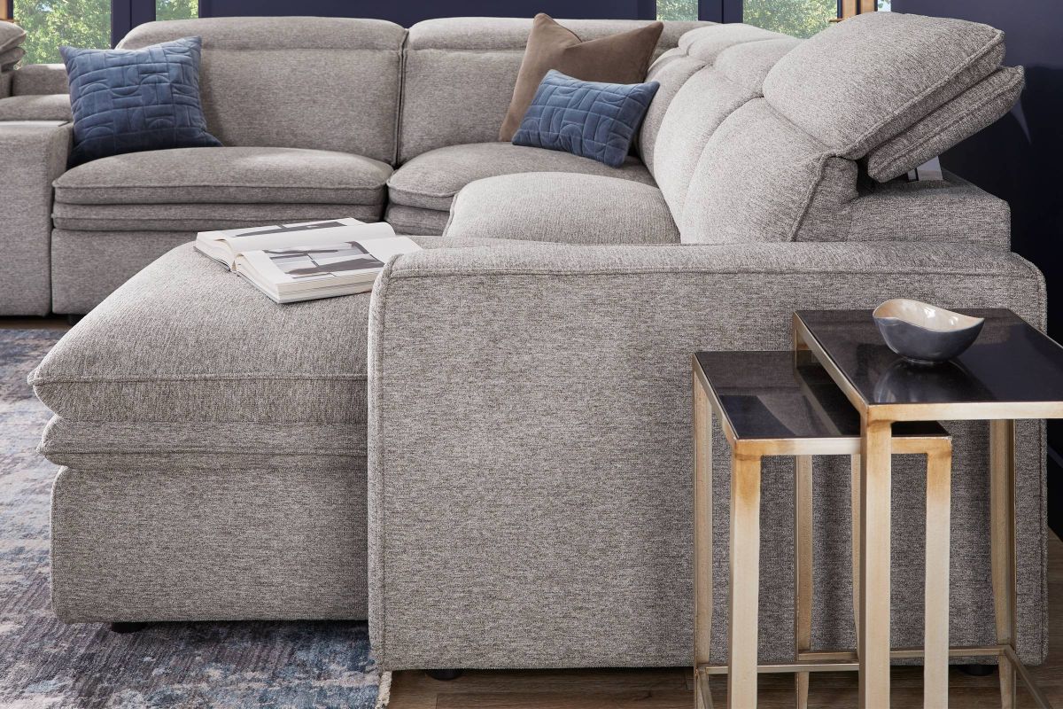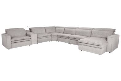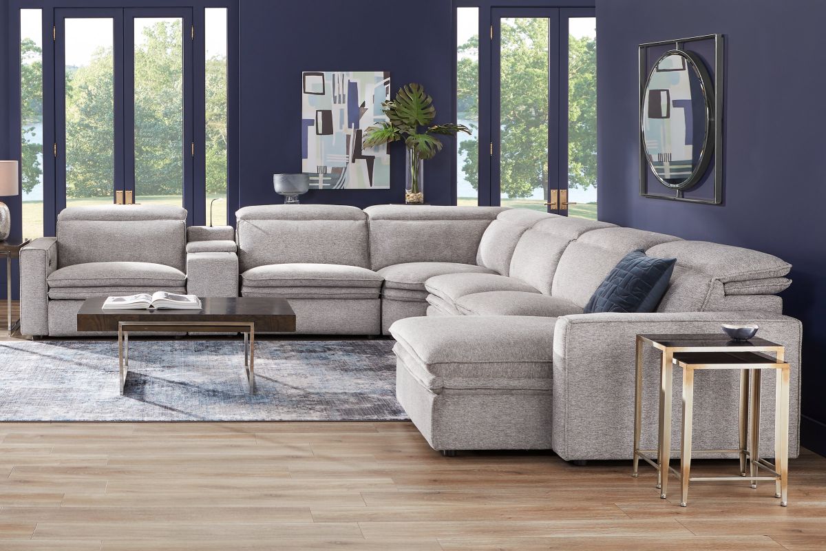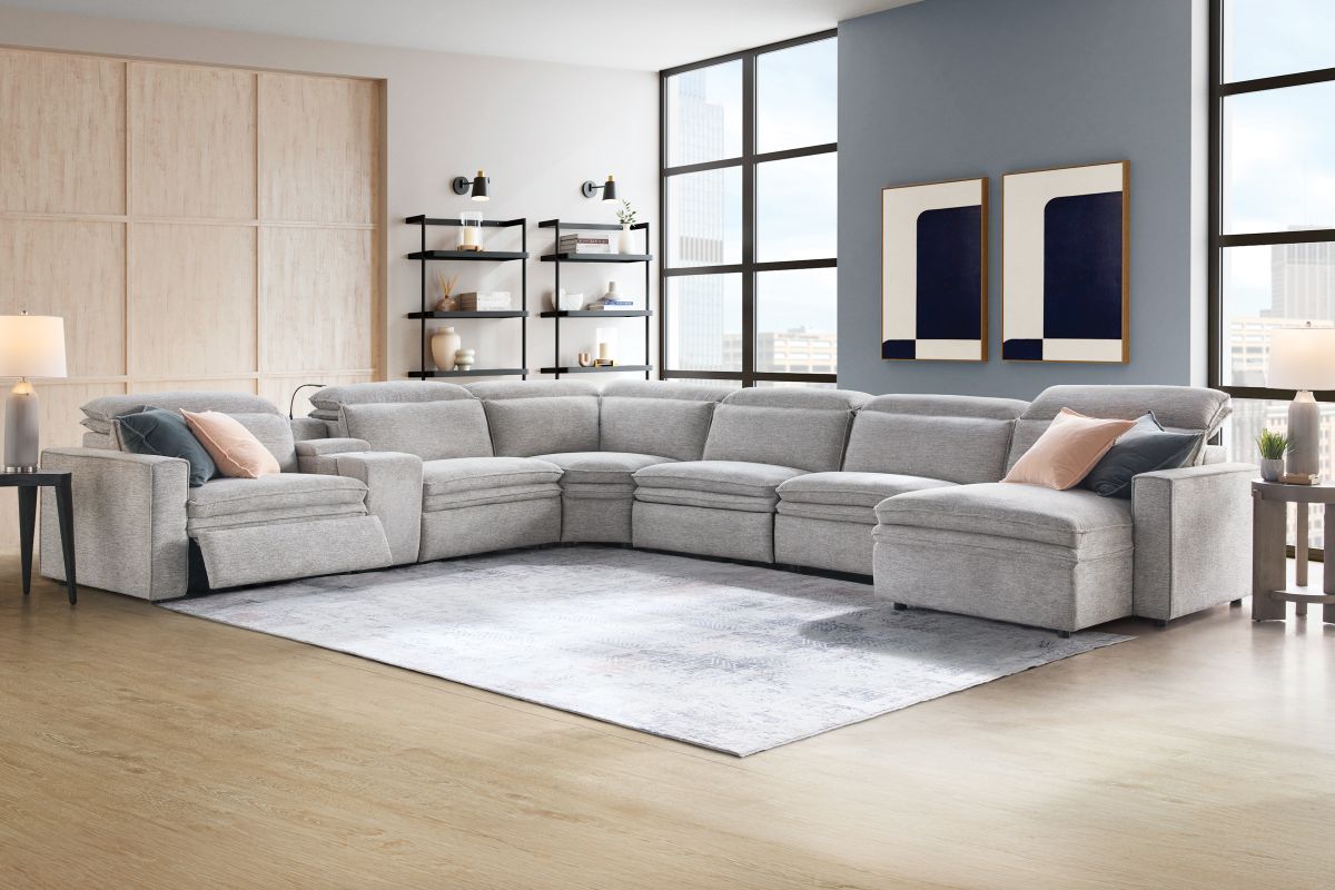 Sleek, chic, and altogether unique, the Drew & Jonathan Salvator Street sectional's spacious seating and seamless functionality is the perfect blend of modern comfort and urban sophistication. Upholstered in a woven fabric, this sectional features stylish track arms and attached double pillow pad seat cushions for a luxurious feel. The dual power reclining feature allows adjustment in the head and footrest for personalized support while the chaise allows adjustment in the headrest for the ultimate lounging experience. The media console includes a storage compartment, cupholders and a reading light for convenience.