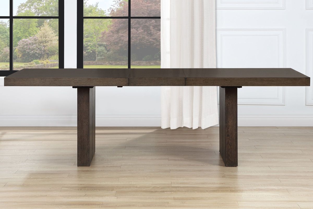The Alexander 7-Piece Dining set comes with a 78-96 inch table features bold modern styling in a practical configuration. The centerpiece is a stunning table with a double pedestal base, clean lines, and an ultra-smooth glide system that effortlessly expands and stores the 18" leaf when not in use. The wire-brushed walnut finish with a waxy hang-up adds sophistication, beautifully paired with luxurious green velvet side chairs for comfort