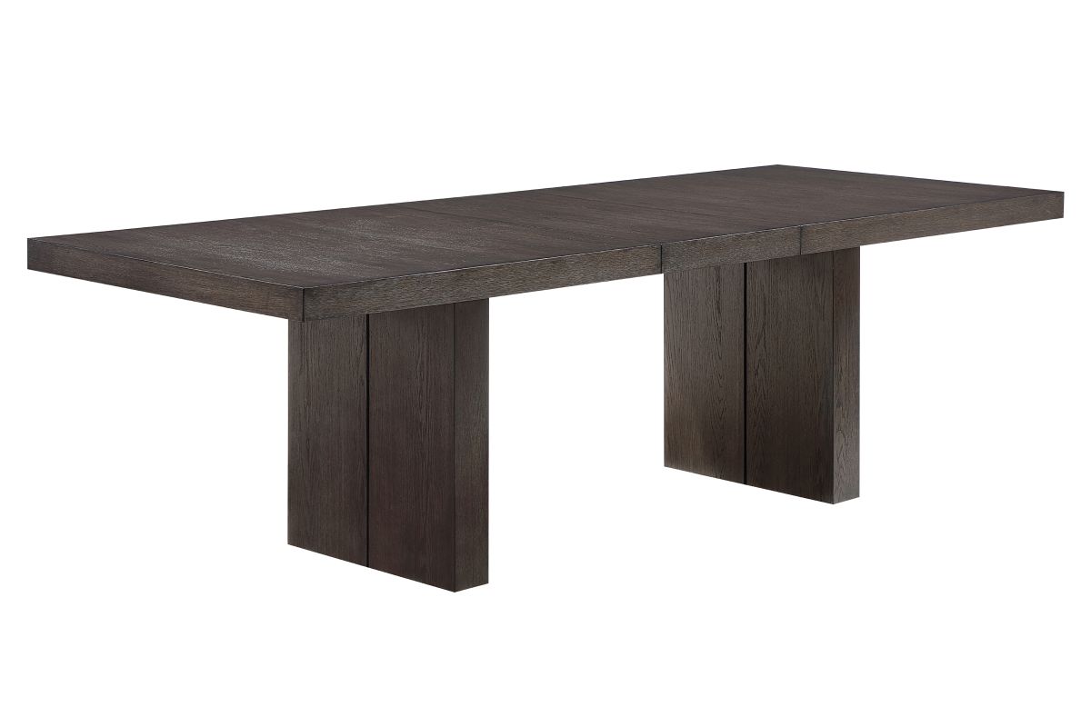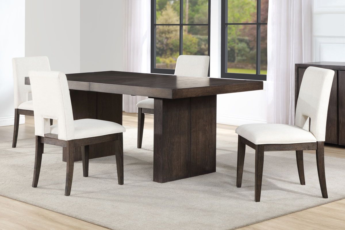 The Alexander 5-Piece Dining set comes with a 78-96 inch table features bold modern styling in a practical configuration. The centerpiece is a stunning table with a double pedestal base, clean lines, and an ultra-smooth glide system that effortlessly expands and stores the 18" leaf when not in use. The wire-brushed walnut finish with a waxy hang-up adds sophistication, beautifully paired with luxurious White Linen side chairs for comfort
