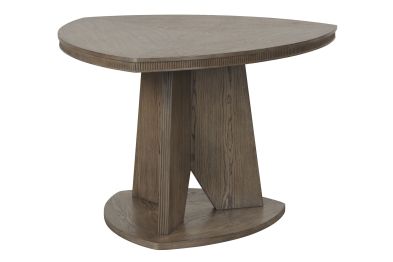 The Verve 5-Piece Dining will be the centerpiece of your dining room, our triangle wooden table boasts a unique central pedestal base. Its visible wood grain texture adds a touch of natural elegance, and sink into plush comfort with our padded Stools. The light fabric upholstery complements the warm tones of the wood, creating a harmonious look.