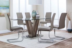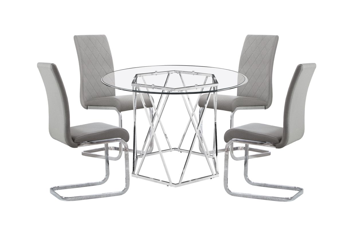 Clean lines and modern styling are the signatures of Chrome Dining. This mixed media set features a tempered glass top table that showcases a gorgeous hexagonal shaped chrome table base. The Chair offers 100% polyurethane upholstery and chrome finish frame. You will fall in love with this Chrome Dining Room Set.