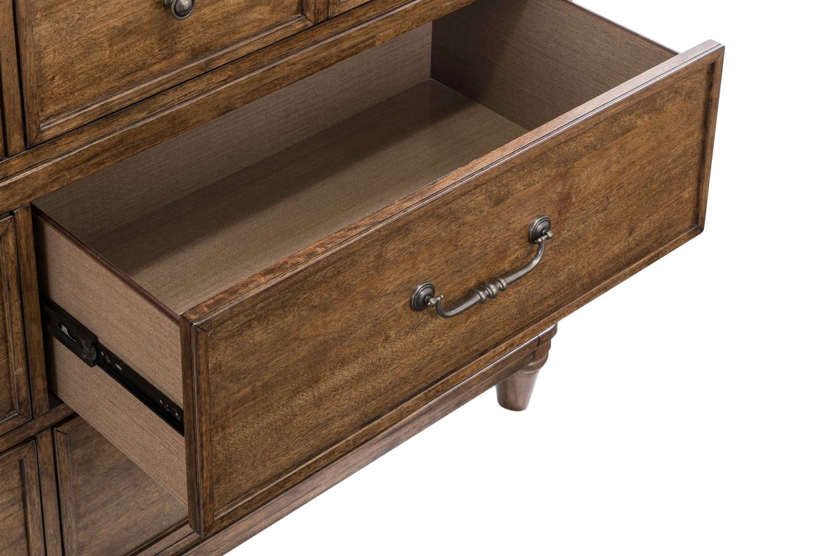 Bring timeless charm and modern convenience to your space with the Tuscany collection. Designed with a blend of classic detailing and contemporary function, this piece showcases frosted beige upholstery paired with bead moulding for a refined, elegant look. Antique brass bail and knob hardware add a vintage touch, while premium felt-lined top drawers and cedar-lined bottom drawers offer thoughtful storage solutions. Integrated USB-A and USB-C ports make it easy to stay connected without compromising style.