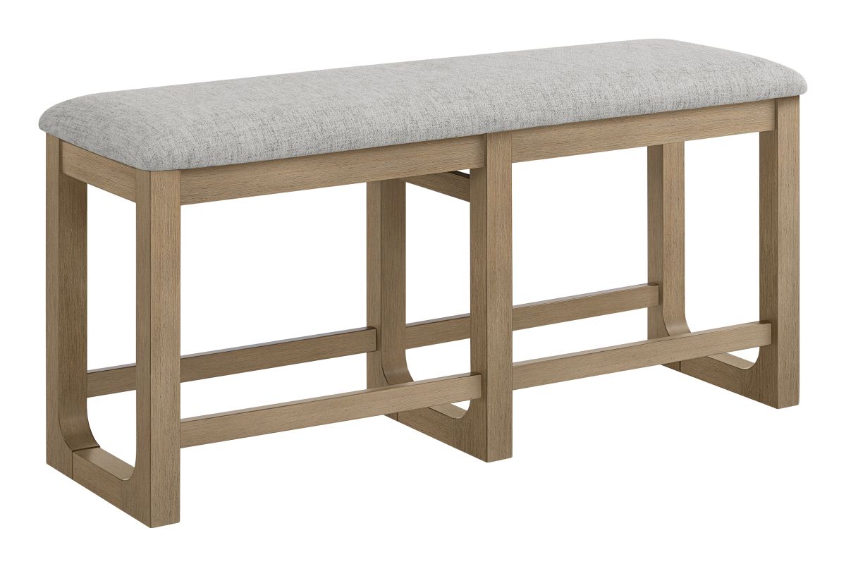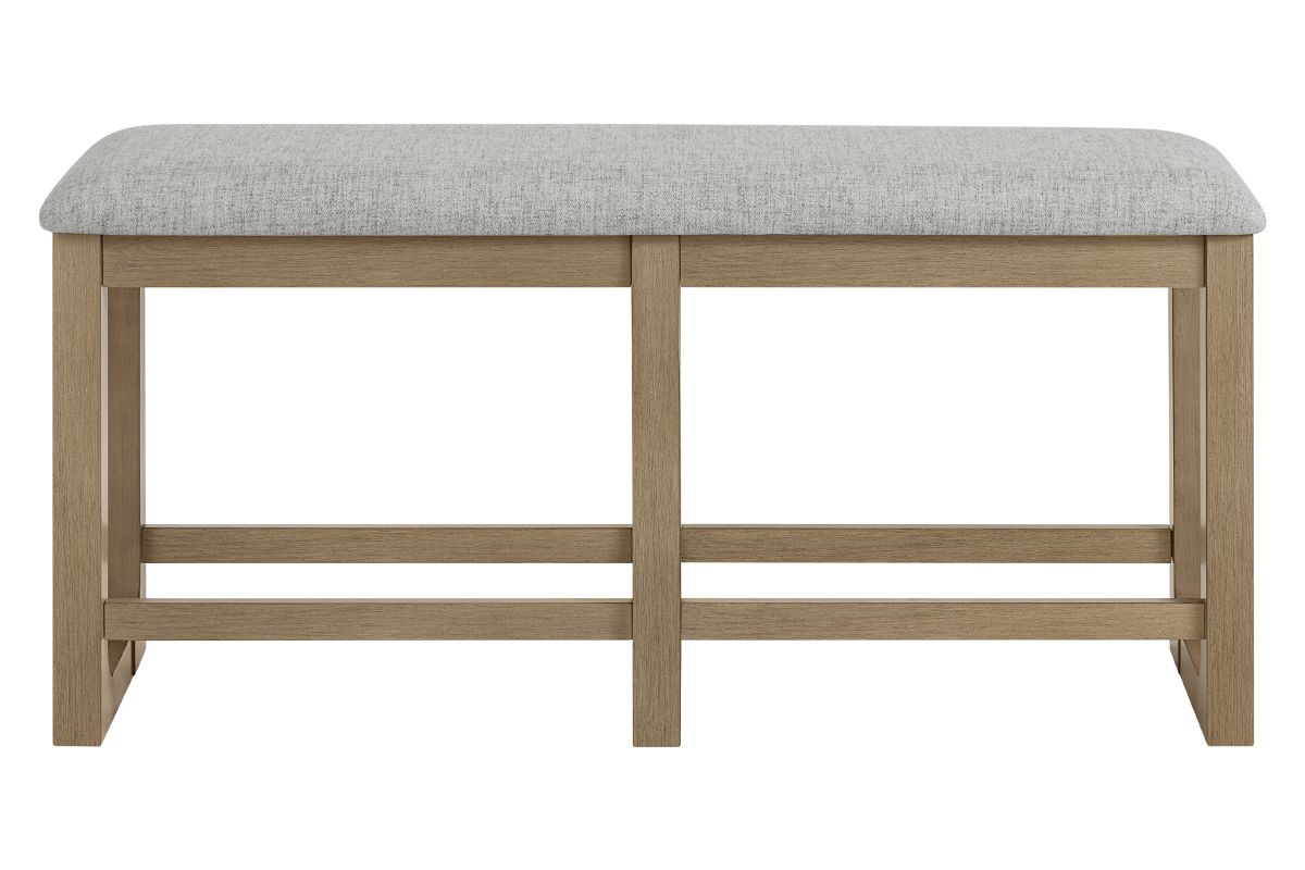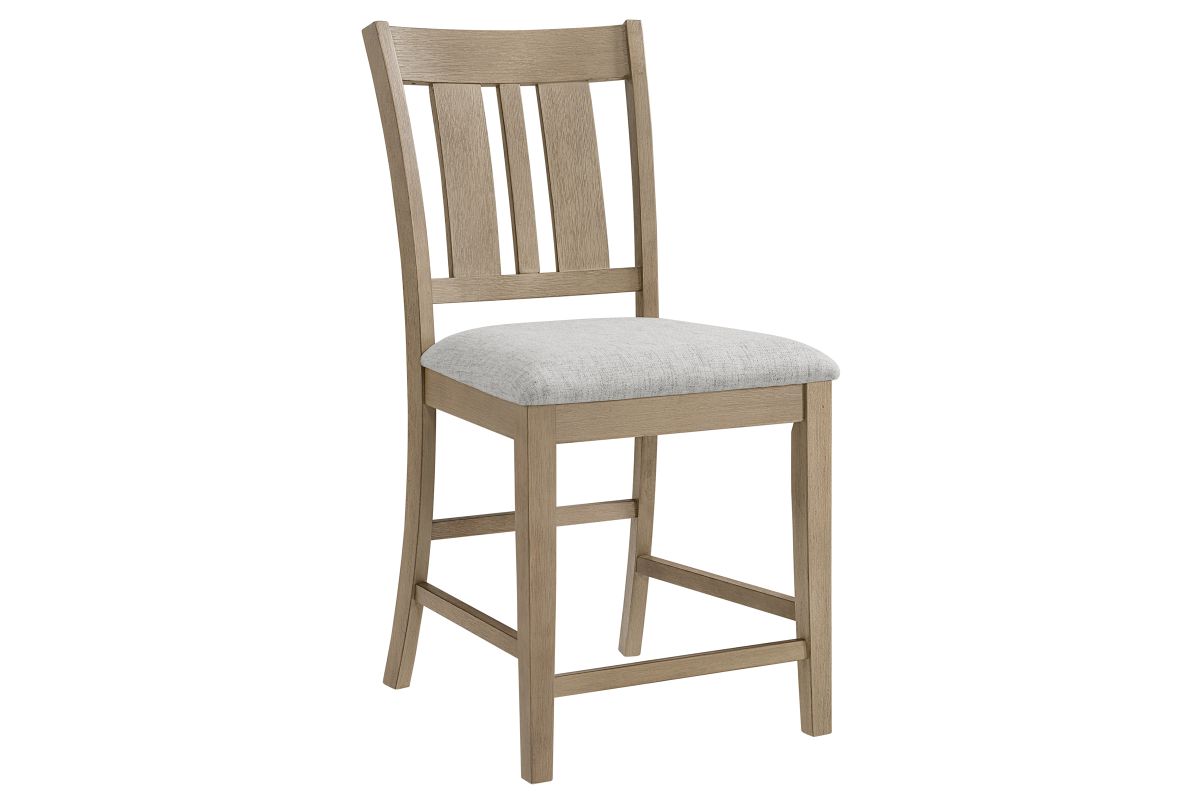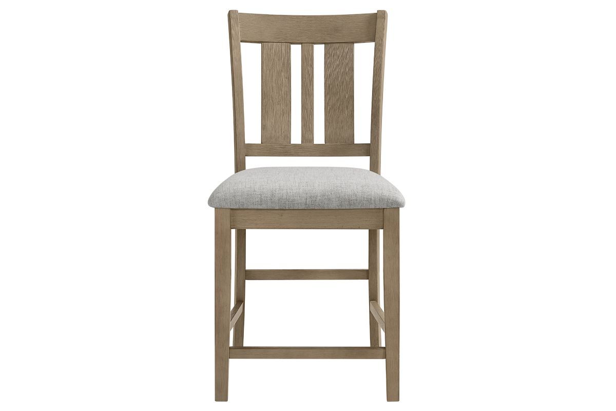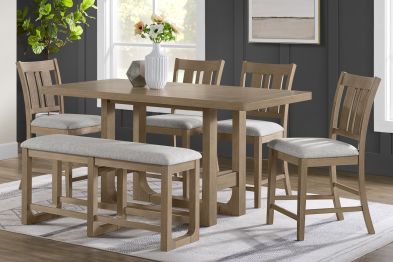 The Hadley Dining Collection seamlessly combines timeless design with enduring craftsmanship, featuring soft, livable finishes that beautifully showcase the natural oak veneer grain. The fixed-top counter-height table comfortably seat six or more, making them ideal for both meals and game nights. Each table showcases a planked tabletop design along the length, bordered by a non-planked horizontal oak veneer on each end, adding visual interest and movement. The sleigh-style bases with rounded inside corners introduce a touch of softness to the overall design. Complementing the tables are slat-back chairs and benches, each equipped with comfortable 100% polyester upholstered seats and a stretcher system for added strength and durability. This collection seamlessly combines aesthetic appeal with practical functionality, making it a versatile addition to any dining space.