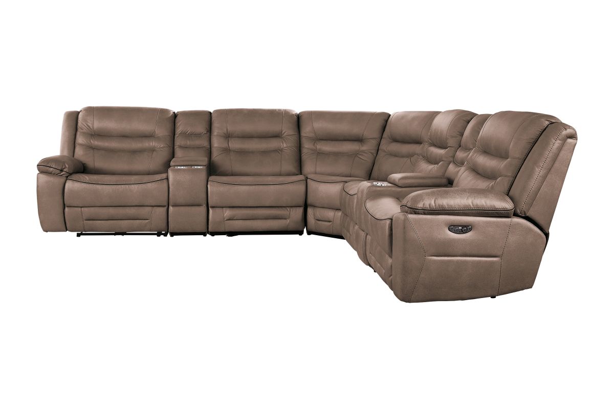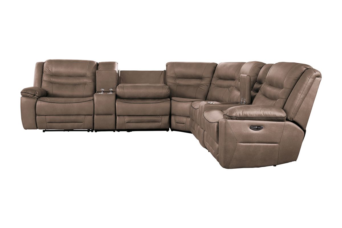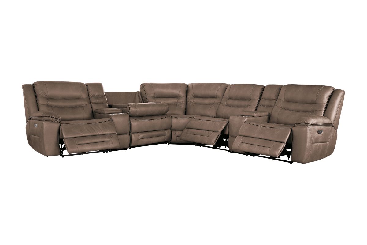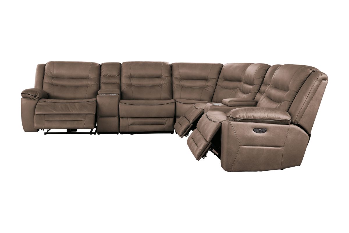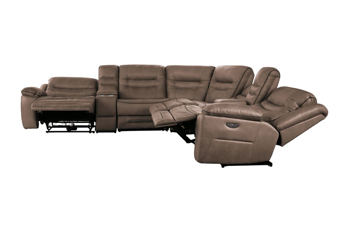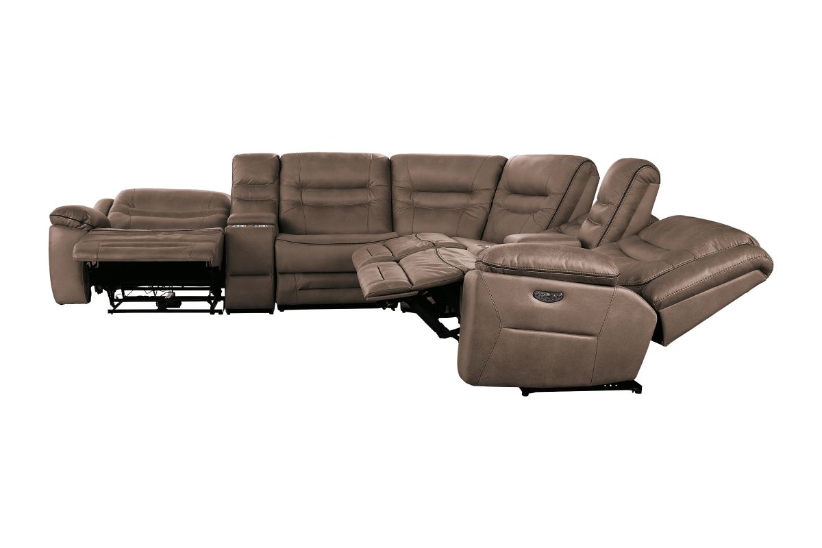 Upgrade your living space with the Rockford Brown Dual Power Reclining 7-Piece Sectional— where comfort meets innovation. Wrapped in soft, durable brown polyester upholstery, this sectional blends plush relaxation with sleek modern design.