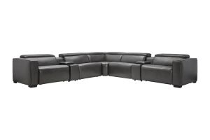The Drift Grey Leather Dual Power Reclining 6-Piece Sectional is designed to be the ultimate gathering spot, blending sleek contemporary style with state-of-the-art comfort features. Upholstered in a versatile grey finish, this spacious sectional offers plenty of room for family and friends while surrounding you with innovative technology. Each seat features dual power reclining with adjustable power headrests, allowing everyone to find their perfect position at the touch of a button.