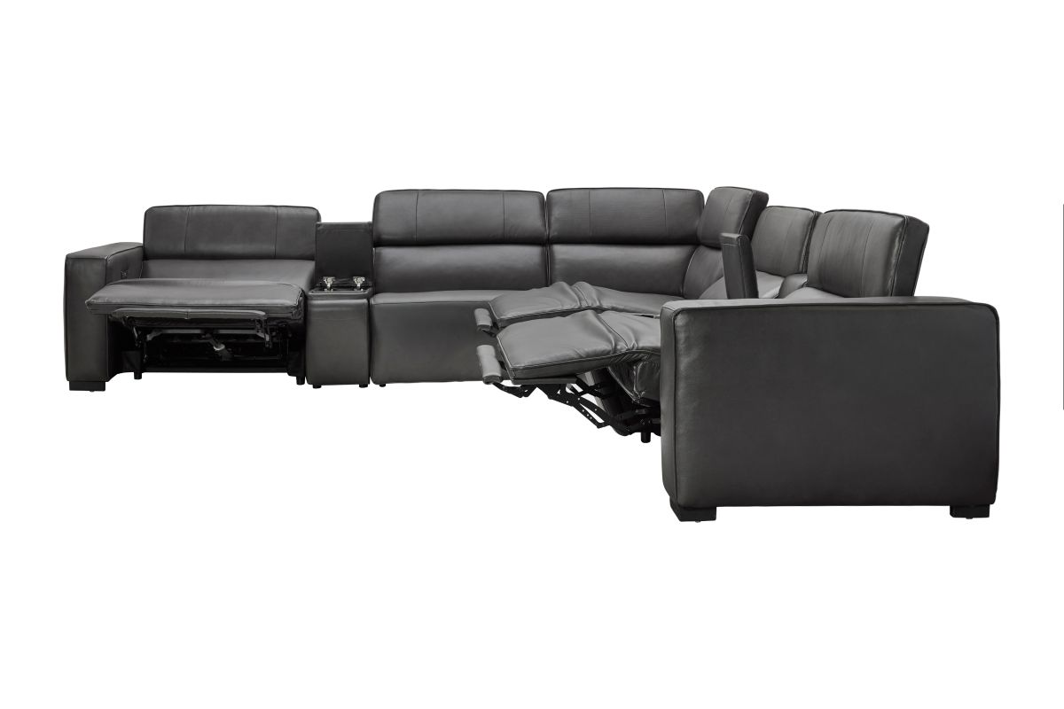 For a truly immersive experience, the Drift sectional is equipped with a built-in 3D sound system that delivers rich, theater-like audio right from your seat. The addition of vibration functions enhances relaxation, while a wireless charging station ensures your devices stay powered without the clutter of cords. With plush cushioning, modular design, and modern detailing, the Drift Grey Leather Dual Power Reclining 7-Piece Sectional is more than just seating — it’s a complete comfort and entertainment hub designed for today’s lifestyle.