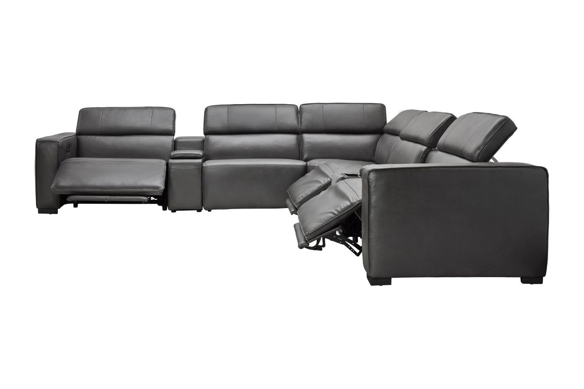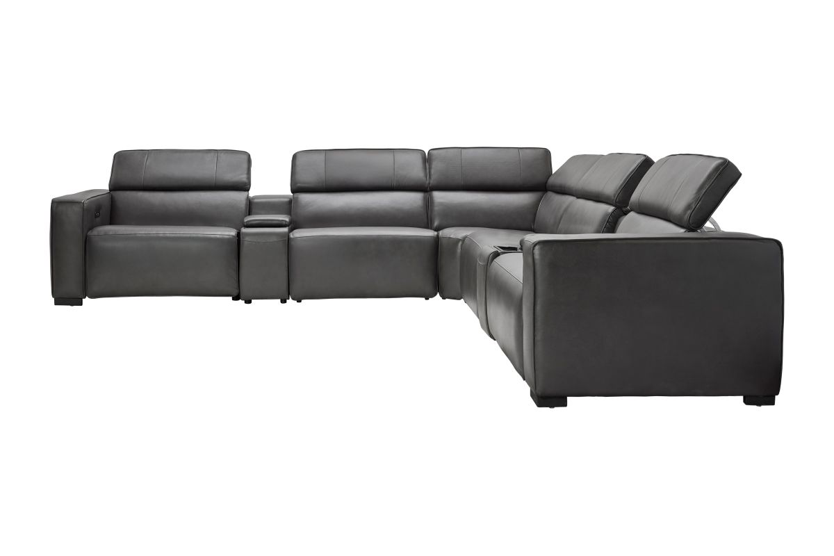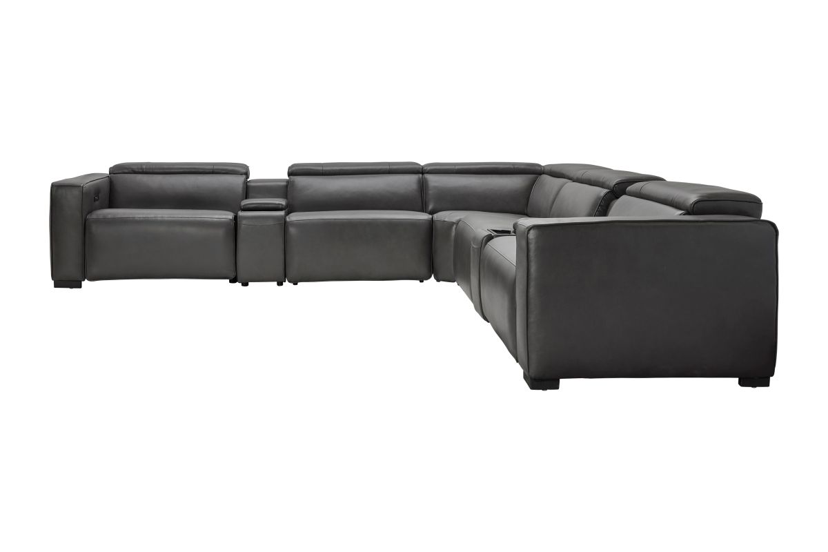 The Drift Grey Leather Dual Power Reclining 7-Piece Sectional is designed to be the ultimate gathering spot, blending sleek contemporary style with state-of-the-art comfort features. Upholstered in a versatile grey leather finish, this spacious sectional offers plenty of room for family and friends while surrounding you with innovative technology. Each seat features dual power reclining with adjustable power headrests, allowing everyone to find their perfect position at the touch of a button.