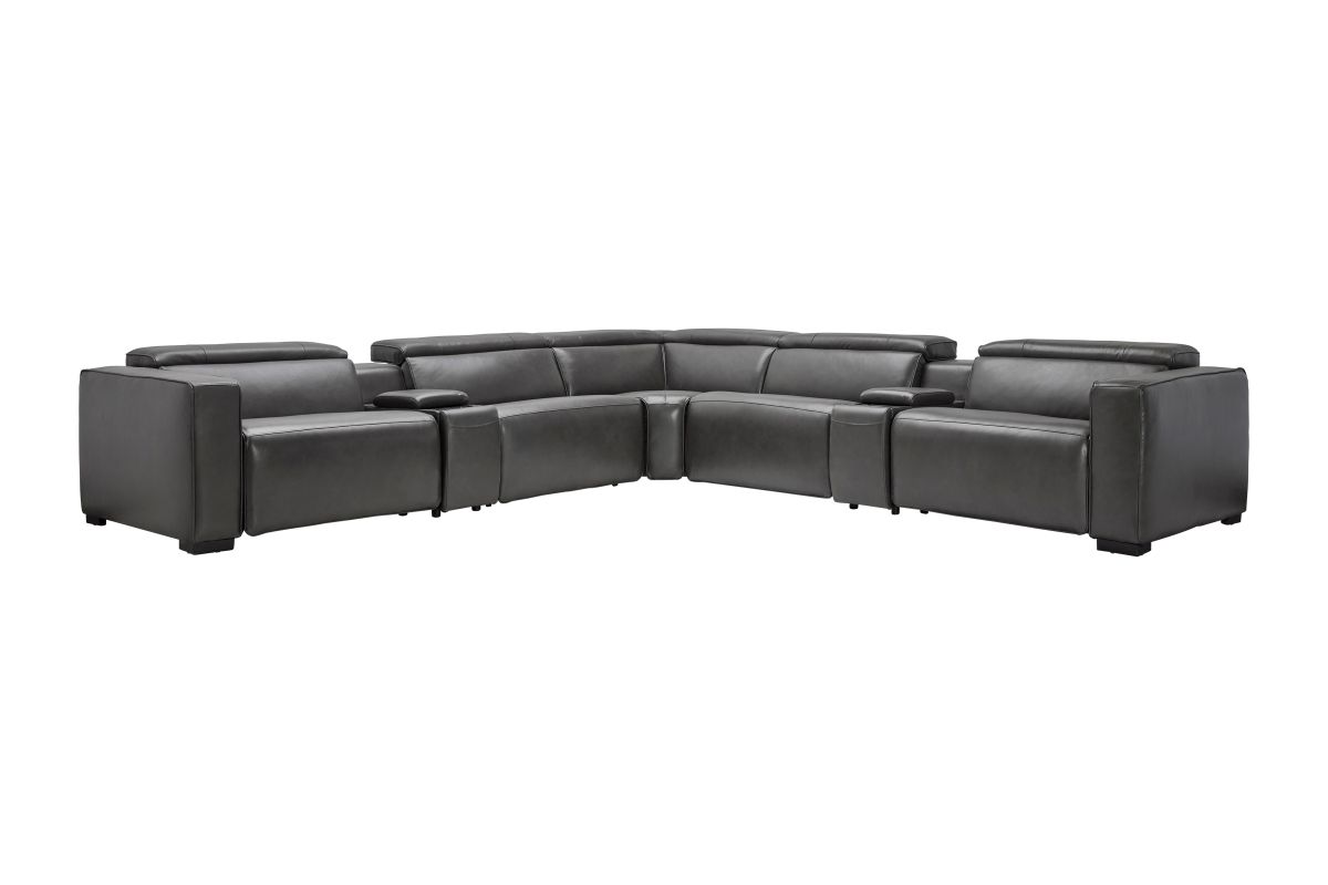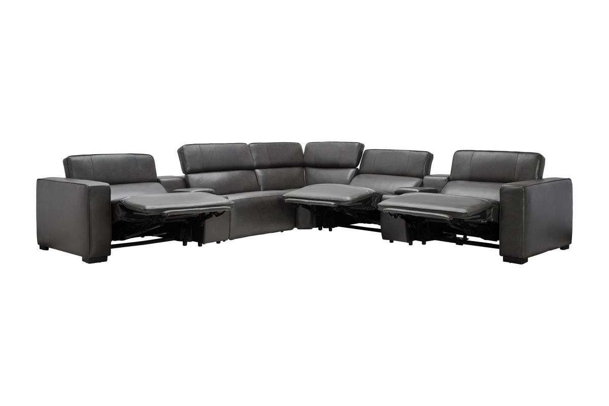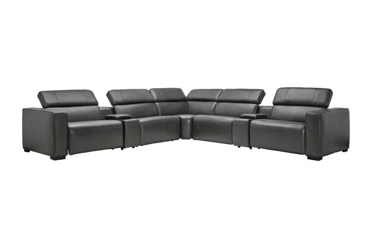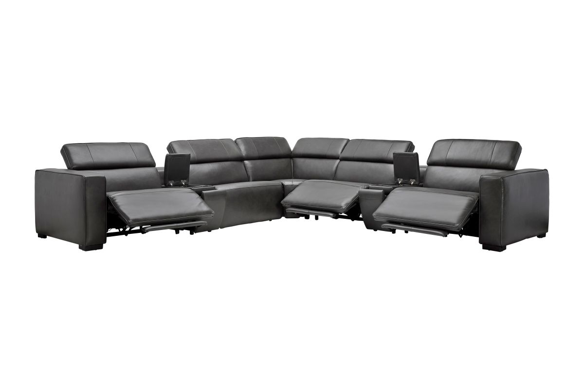 The Drift Grey Leather Dual Power Reclining 7-Piece Sectional is designed to be the ultimate gathering spot, blending sleek contemporary style with state-of-the-art comfort features. Upholstered in a versatile grey leather finish, this spacious sectional offers plenty of room for family and friends while surrounding you with innovative technology. Each seat features dual power reclining with adjustable power headrests, allowing everyone to find their perfect position at the touch of a button.