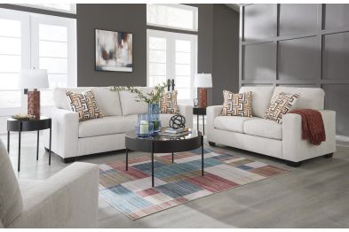The Aviemore Collection brings a fresh, vibrant feel to living spaces with its clean lines, sleek profiles, and standout colors—think bold navy “Ink,” earthy “Burnt Orange,” and soft neutrals. Each piece features a corner-blocked frame, high-resiliency foam cushions wrapped in poly fiber, and a platform foundation system that helps resist sagging up to three times better than traditional spring systems. Set includes the Aviemore Stone Sofa, Loveseat, Recliner, Ardoline Occasional 3-Pack Table Set, Wimmings 2-Pack Ceramic Table Lamps, and the Redlings 5' x 7' Rug.