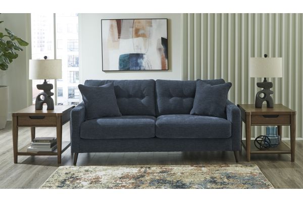 The Bixler line channels mid-century modern flair with clean, linear profiles, track arms, and subtle button tufting on attached back cushions, combined with loose, non-reversible seat cushions for convenience and style. Tapered accent legs complete the retro-modern aesthetic. The upholstery is typically a polyester/viscose blend, available in bold colors like navy and olive. Structurally, the pieces are built on corner?blocked frames with platform foundations for durability. Set includes the Bixler Navy Sofa, Loveseat, the Isanti Cocktail Table, two Isanti End Tables, and a 2-Pack of the Scarbot Paper Table Lamps and the Jerelyn 7'10" x 10' Rug.