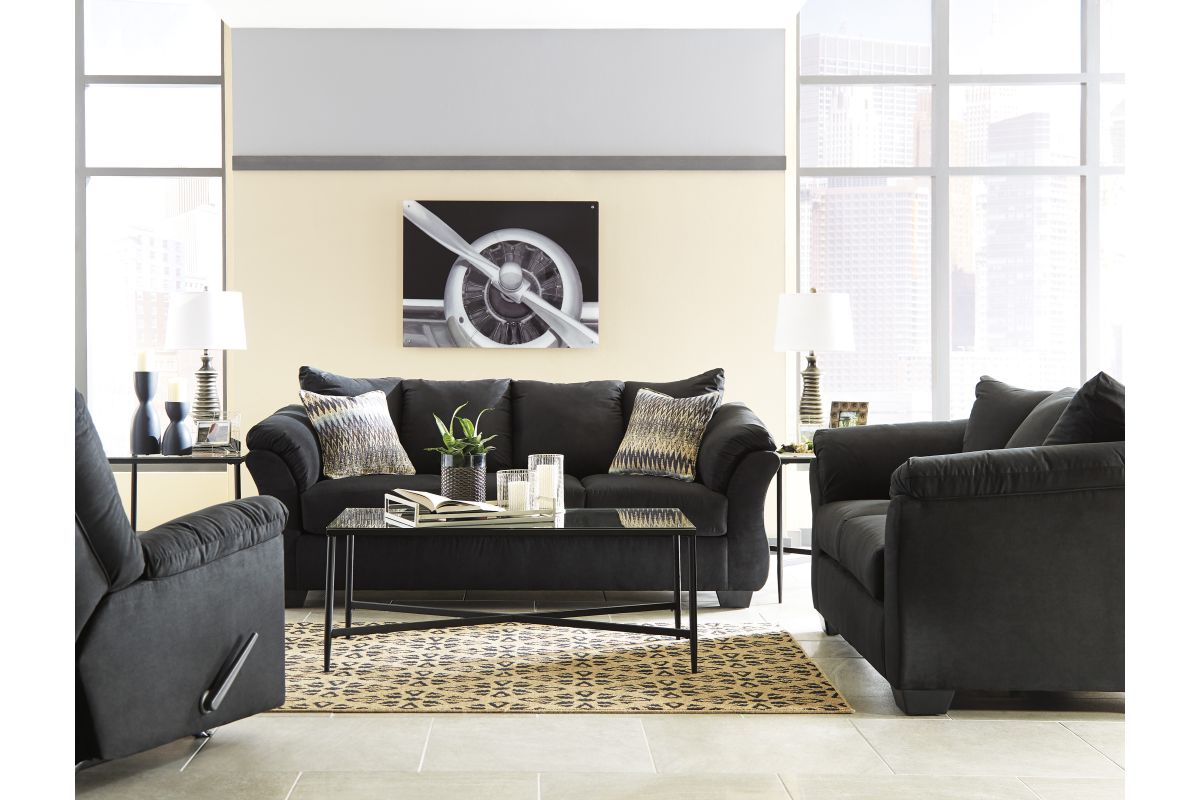 The Darcy Collection by Ashley blends contemporary flair with plush comfort. With its clean lines, stylish details, and versatile range of pieces and finishes, it’s designed to fit seamlessly into modern living spaces. Whether you're looking for a single statement sofa, a matching loveseat, or a curated set, Darcy gives you both form and function—with a touch of elegance. Set includes: Darcy Black Loveseat, Sofa, Recliner, Chair, Ottoman and the Tarrin 3-Pack Occasional Table Set.