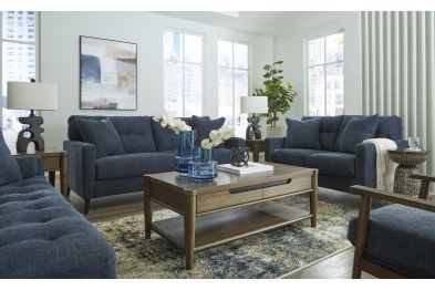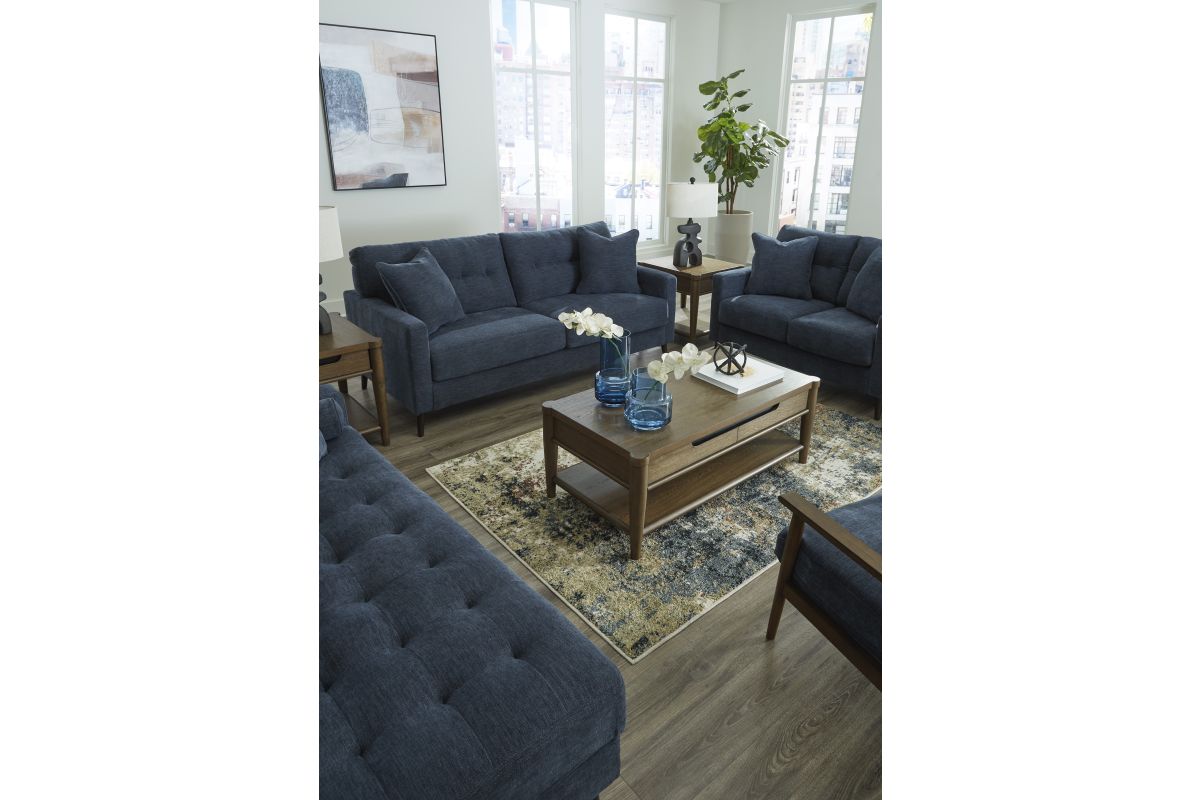 Make room for easy, everyday elegance with the Bixler Living Room Collection. Designed for the modern home, this collection delivers timeless style, plush comfort, and inviting appeal—all wrapped in a clean, contemporary silhouette. This set includes the Bixler Navy Sofa, Loveseat, Accent Chair, Right-Arm Facing Corner Chaise, the Isanti Cocktail Table, two Isanti End Tables, and a 2-Pack of the Scarbot Paper Table Lamps, and the Jerelyn 7'10" x 10' Rug. Some assembly is required upoon delivery.