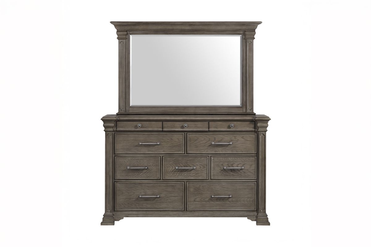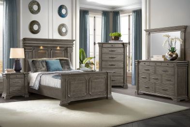 Transform your bedroom into a sophisticated sanctuary with the Radcliff Queen Panel Bedroom Set. This set features refined molding, giving it an elegant and timeless look. The high headboard adds a touch of grandeur to your space, while the touch-button mood-lighting in the headboard creates a relaxing ambiance. With two USB ports conveniently located in the headboard, you can easily charge your devices while lounging in bed. The black felt lined top drawers of all the case pieces provide a luxurious touch, and the nightstand sliding top with hidden storage offers safe keeping of your valuables. Finished with cedar veneer bottom drawers, this set combines style and durability for long-lasting use.