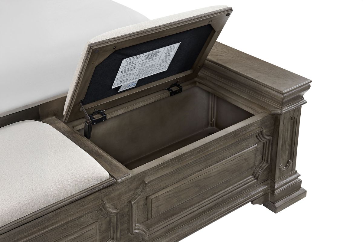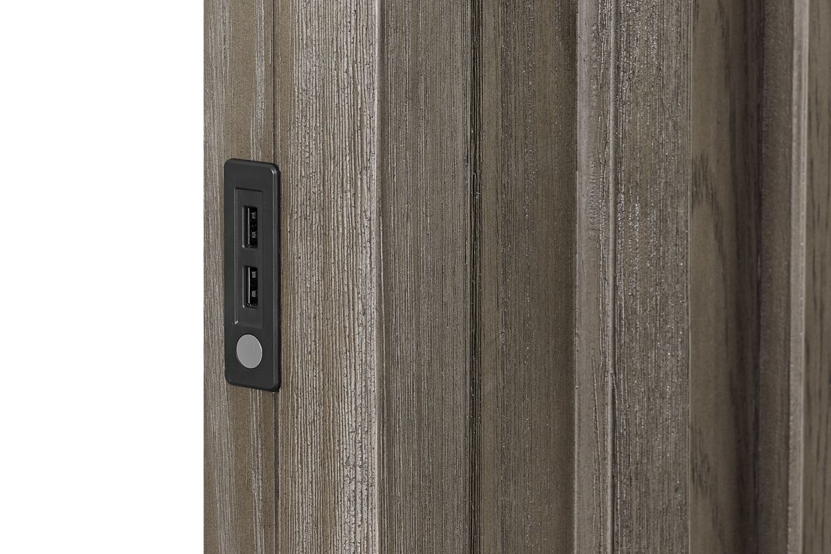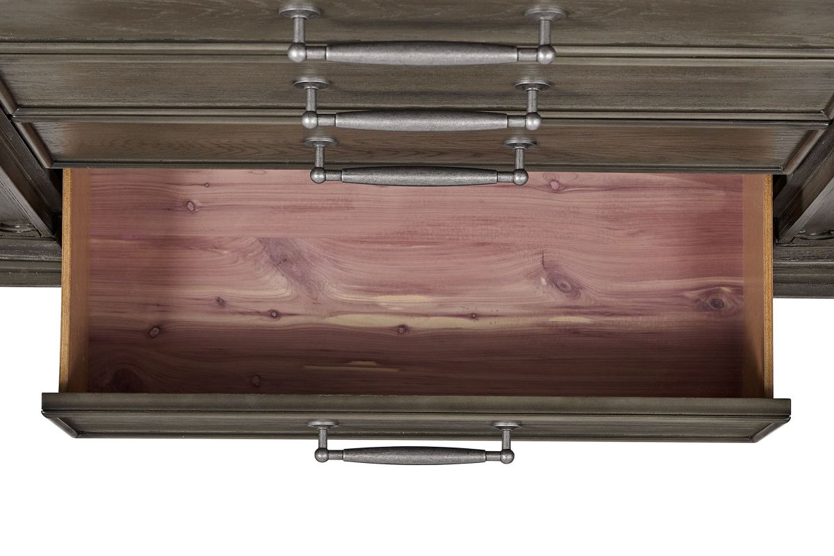 Transform your bedroom into a sophisticated sanctuary with the Radcliff Storage Bedroom Set. This set features refined molding, giving it an elegant and timeless look. The high headboard adds a touch of grandeur to your space, while the touch-button mood-lighting in the headboard creates a relaxing ambiance. With two USB ports conveniently located in the headboard, you can easily charge your devices while lounging in bed. The black felt lined top drawers of all the case pieces provide a luxurious touch, and the nightstand sliding top with hidden storage offers safe keeping of your valuables. Finished with cedar veneer bottom drawers, this set combines style and durability for long-lasting use.
