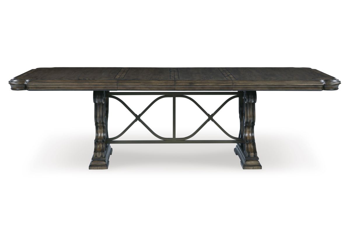 From its ornamental appliques to its large scale, this dining package makes a bold statement. With ornate details, the opulent set wows with stunning style. The look is timeless. The feel? Right at home.