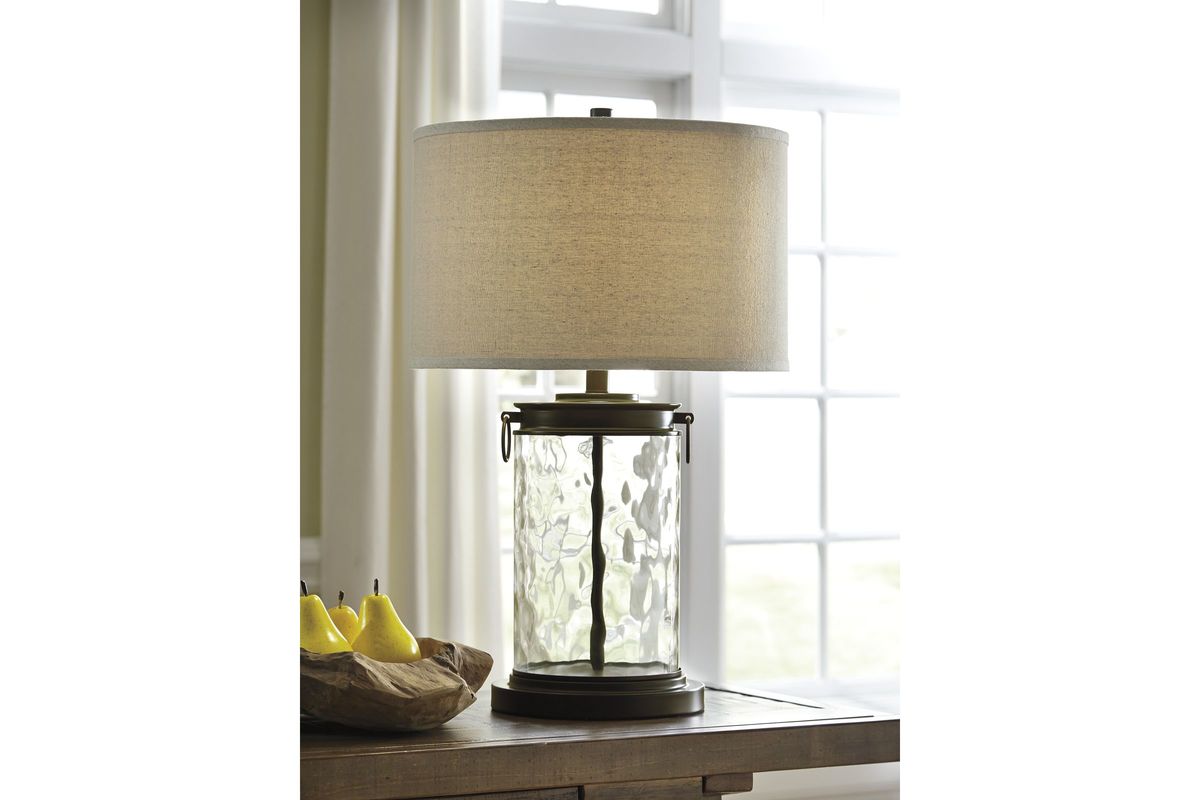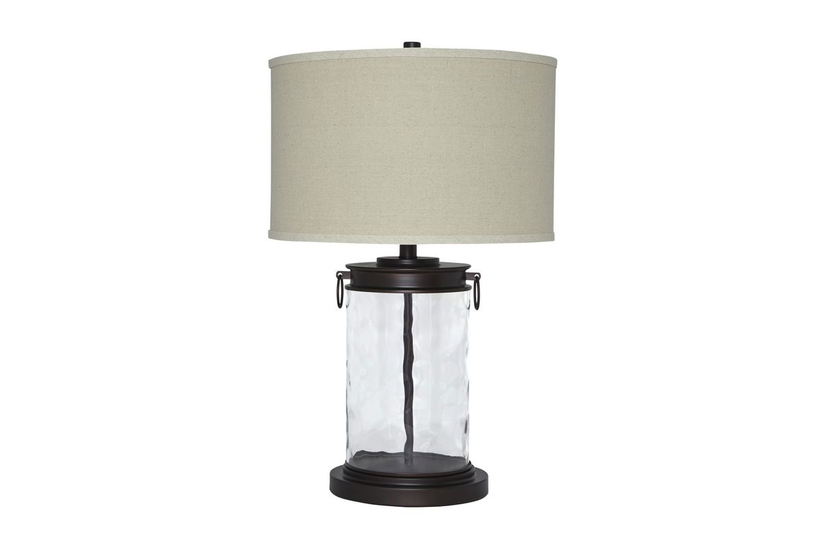 Light waves ahead. Wowing with a clear wave glass design, this table lamp is delightfully chic and unique. Classic drum shade is perfectly in tune with cylinder shape base.